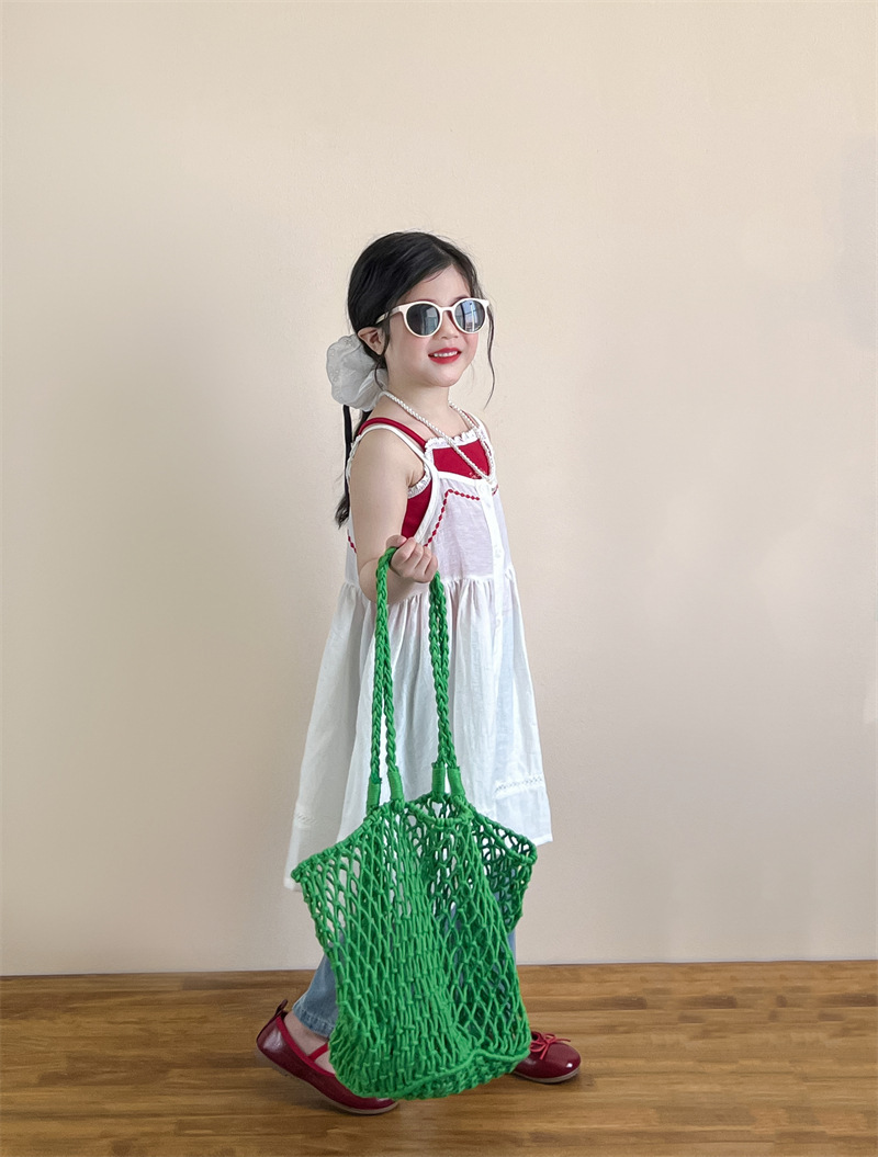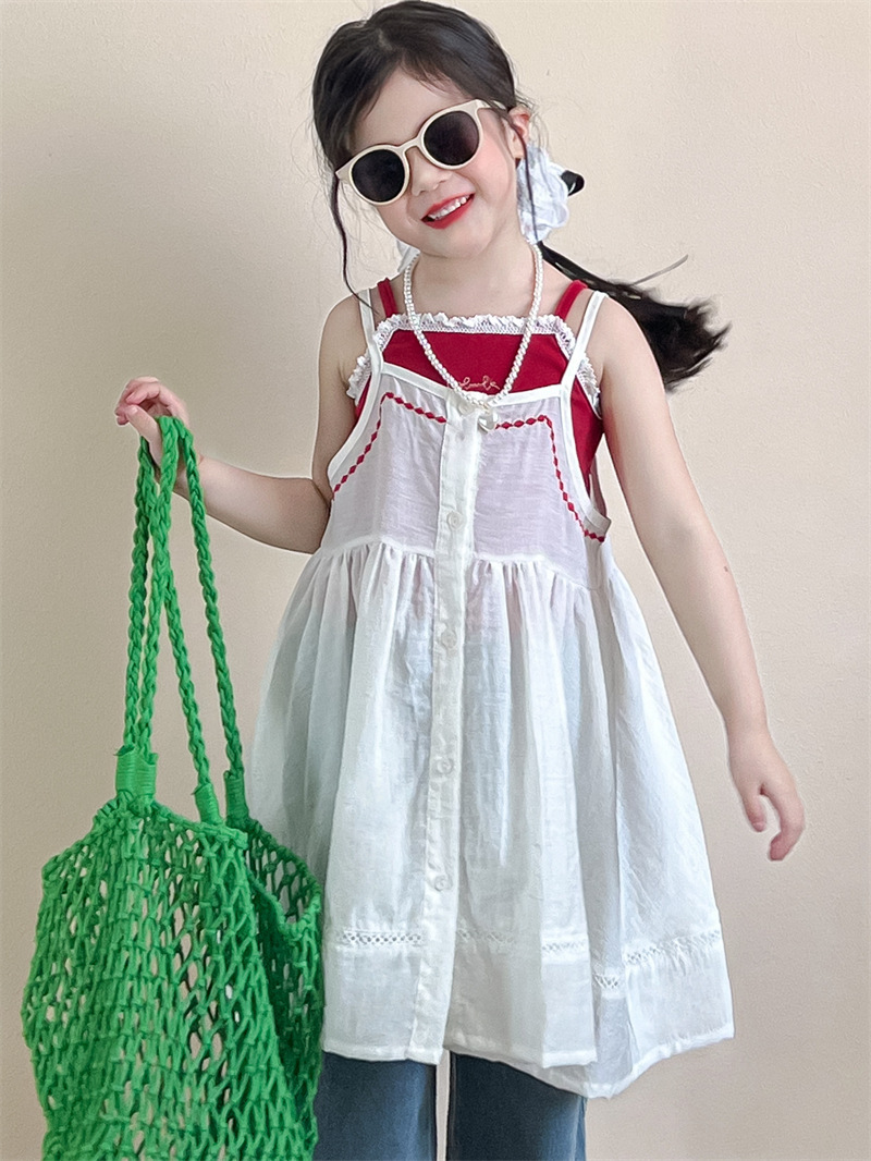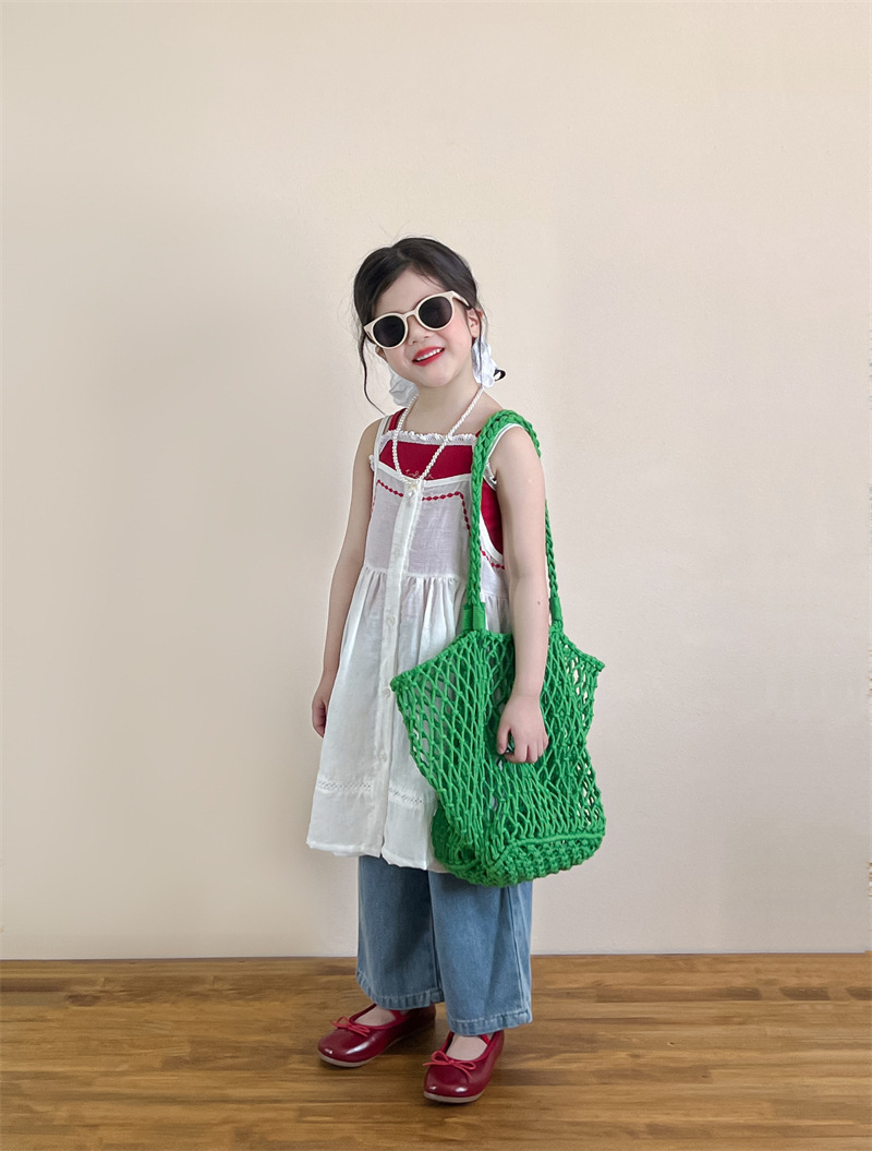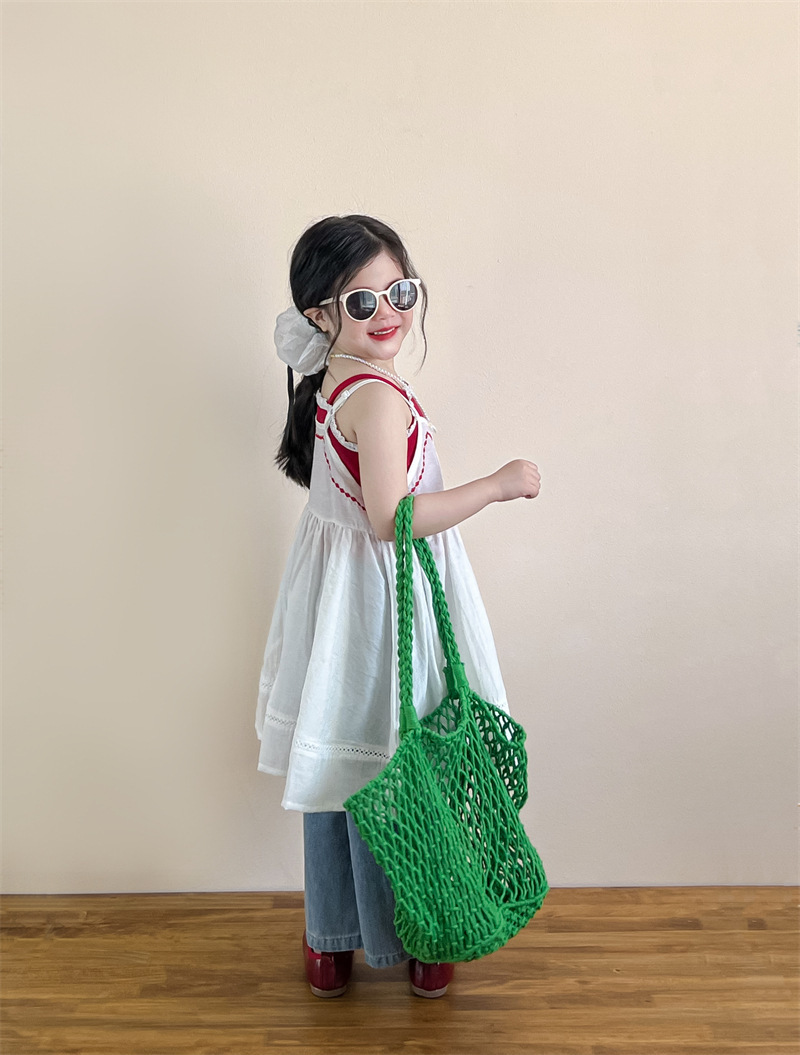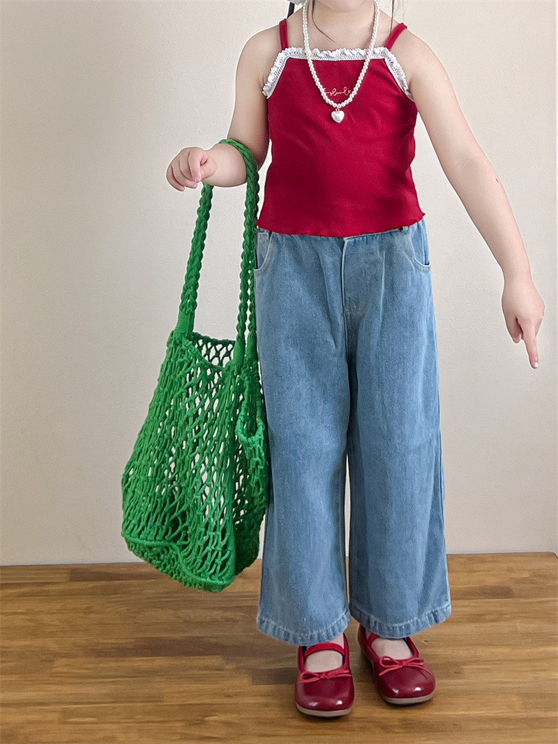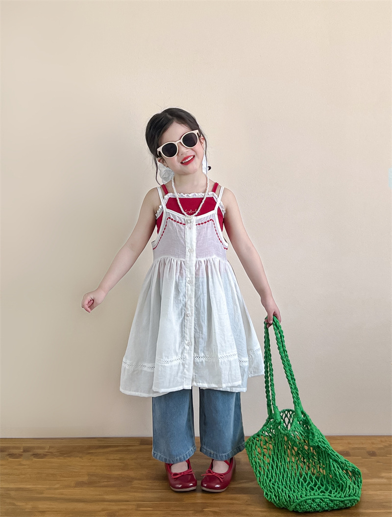 소녀의 여름 달콤한 우아한 자수 레이스 레드 슬링 화이트 버클 블라우스 청바지 별도 샷