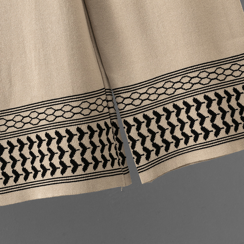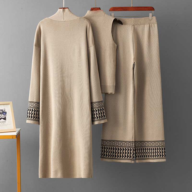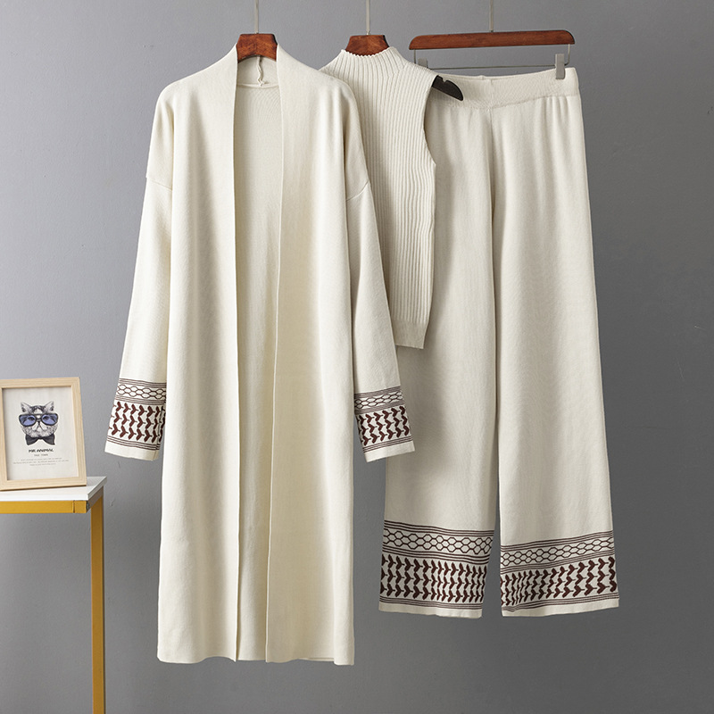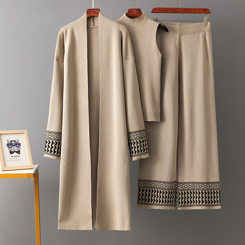 국경 간 유럽과 미국의 자카드 캐주얼 세트 여성용 숄 재킷 라운드 넥베이스 니트 스웨터 와이드 레그 팬츠 3 피스 세트