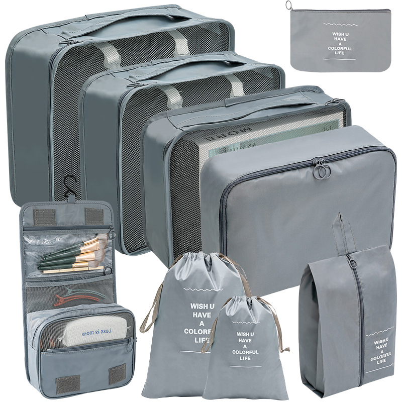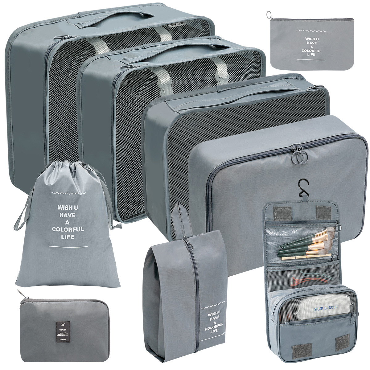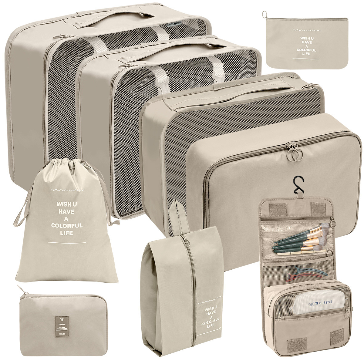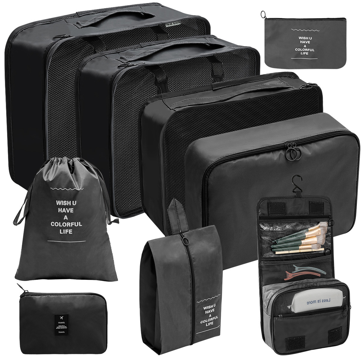洗漱化妆包十件套=七件套+小号束口袋+化妆包+挂钩洗漱包;包装24X35X10CM