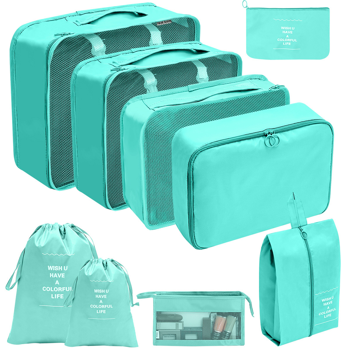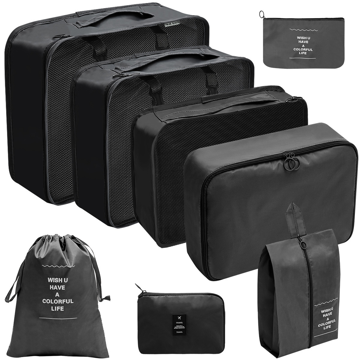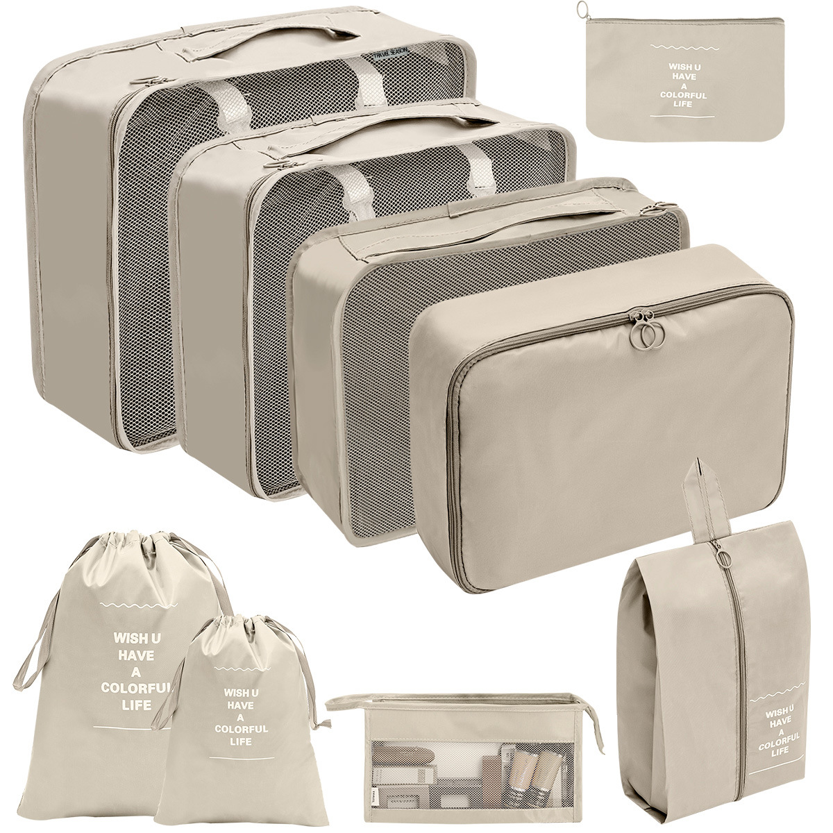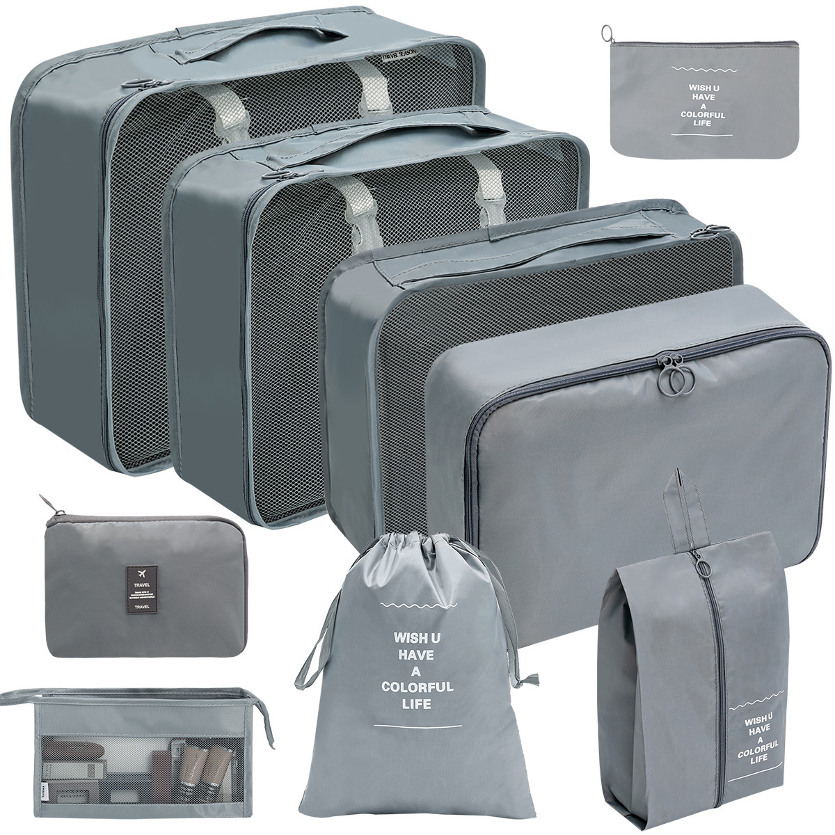 洗漱化妆包十件套=七件套+小号束口袋+化妆包+挂钩洗漱包;包装24X35X10CM