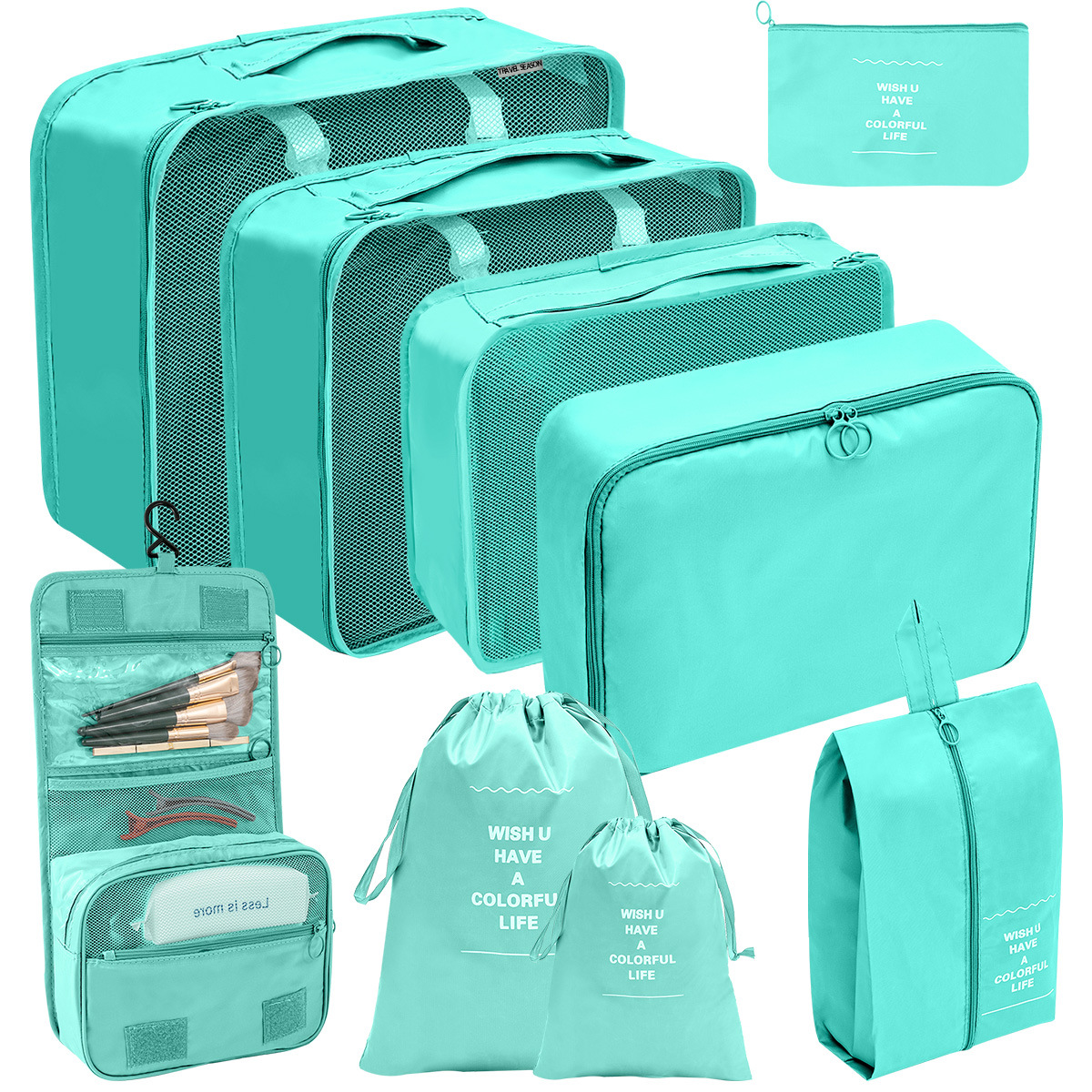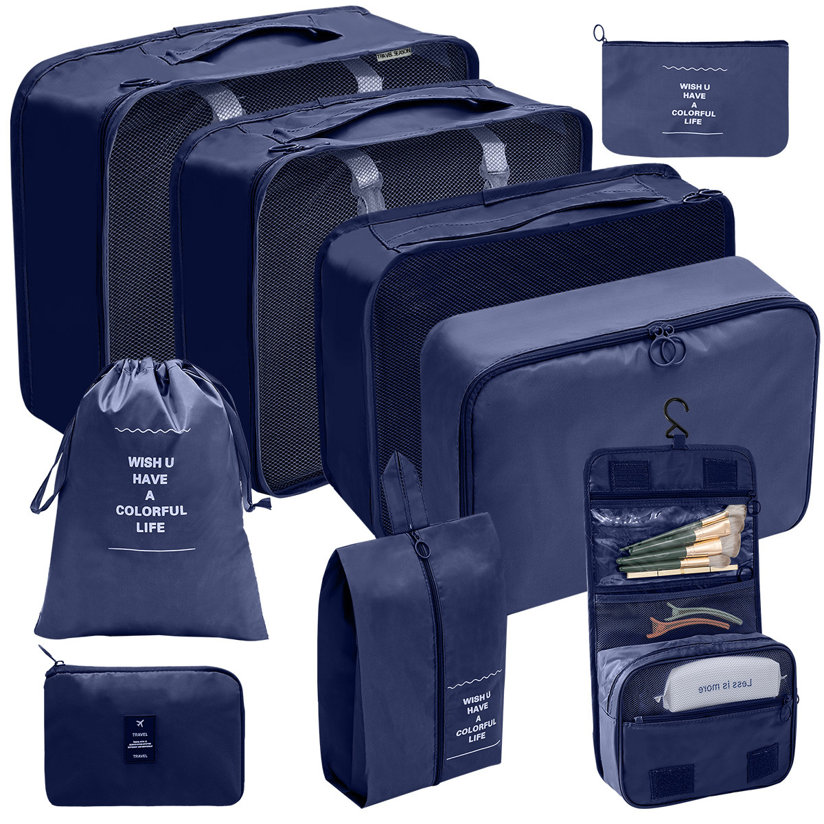 洗漱包九件套=七件套+小号束口袋+挂钩洗漱包;包装24X35X8CM