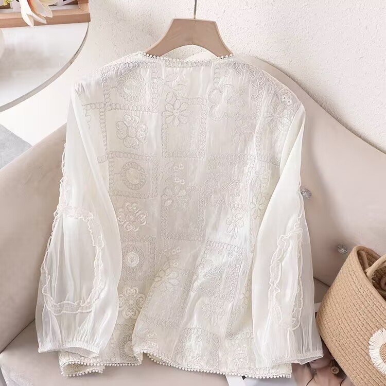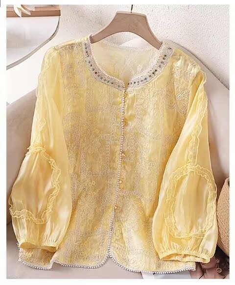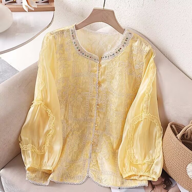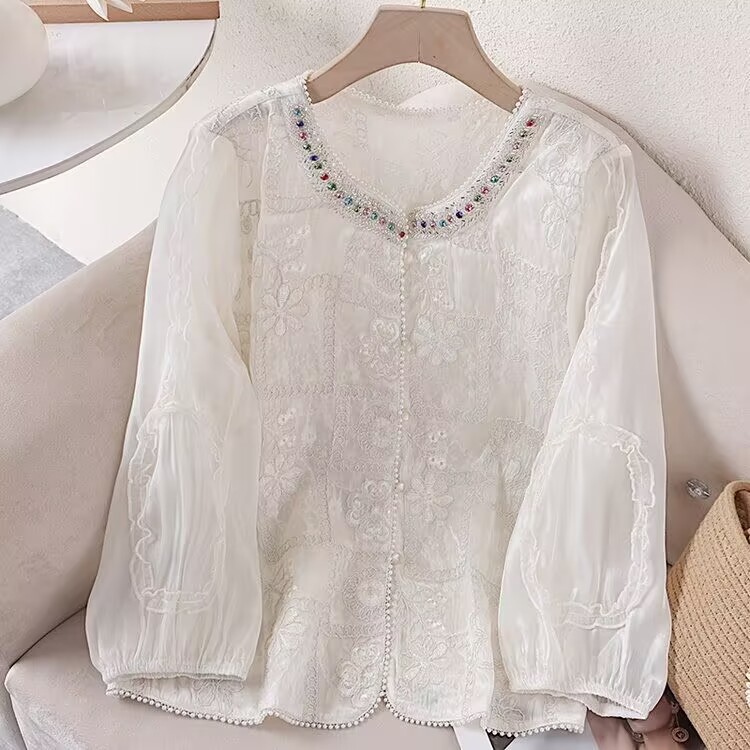 무거운 자수 선스크린 셔츠 여성의 2025 여름 새로운 패션 서양 스타일 슈퍼 잘 생긴 경량 작은 셔츠 우아한 탑