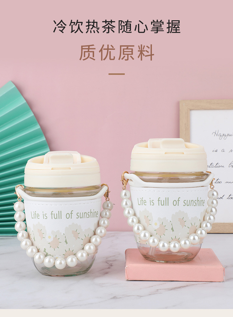 여학생을 위한 고급스러운 유리 물컵, 작고 신선하고 귀여운 더블 드링킹 컵, 진주 인 스타일 휴대용 커피 컵스토어 가기