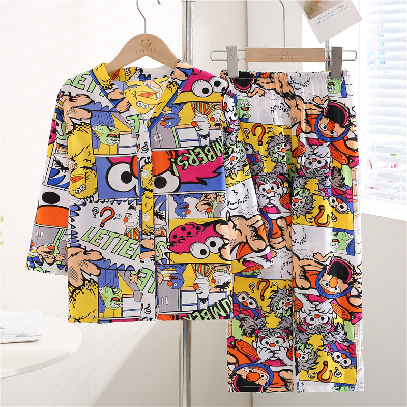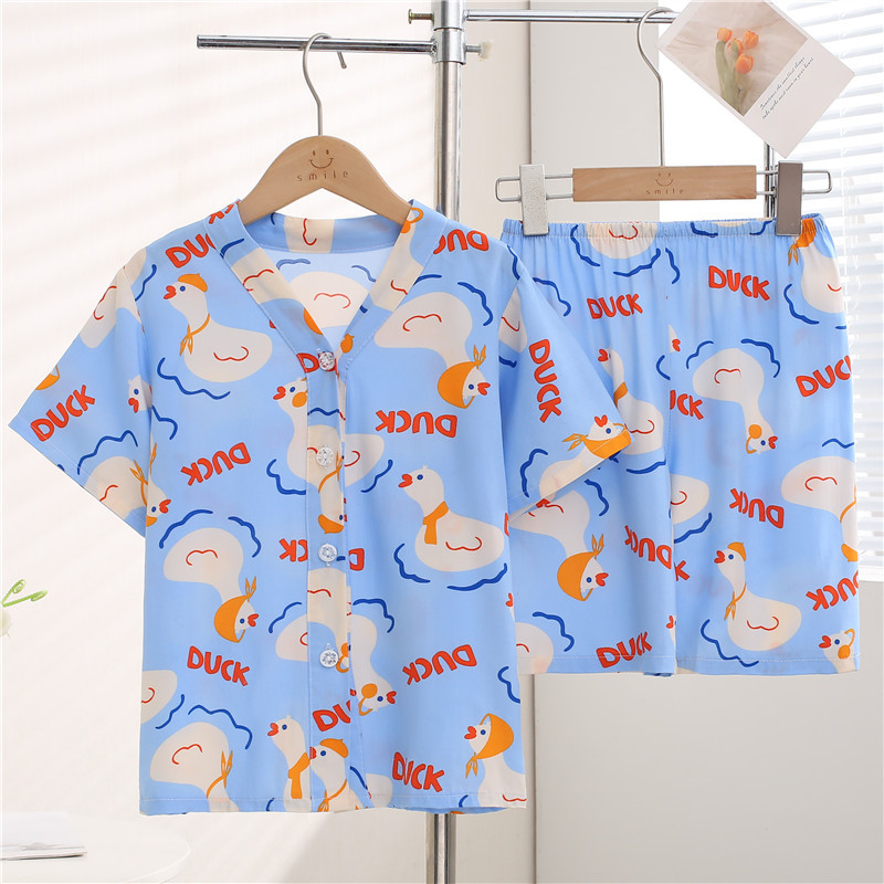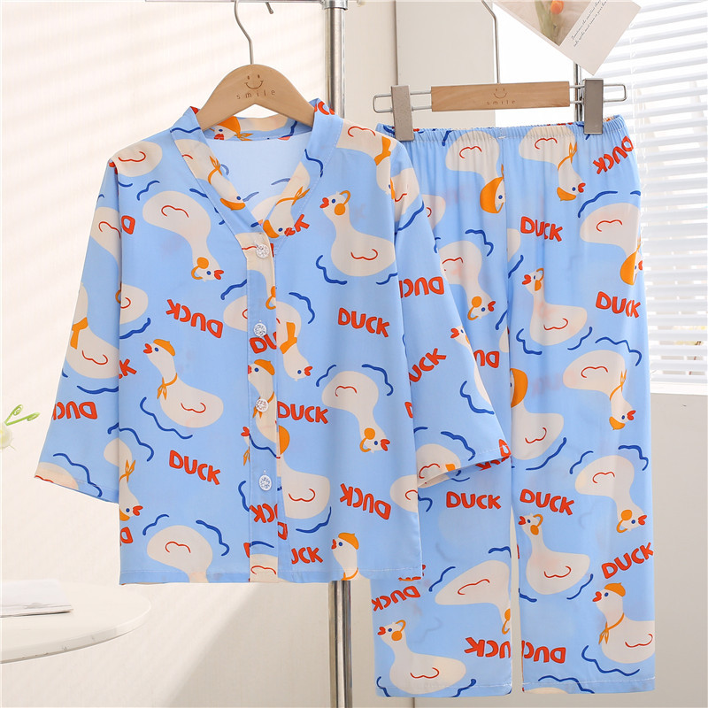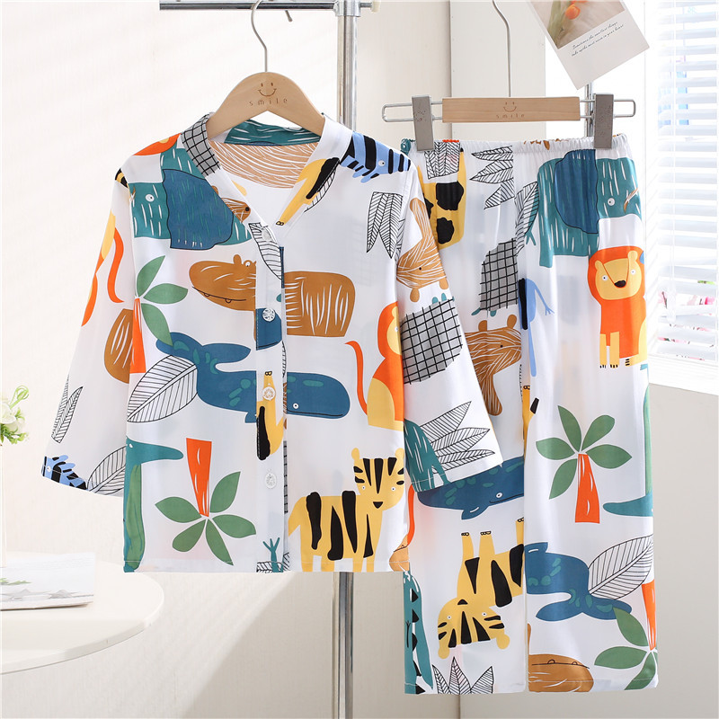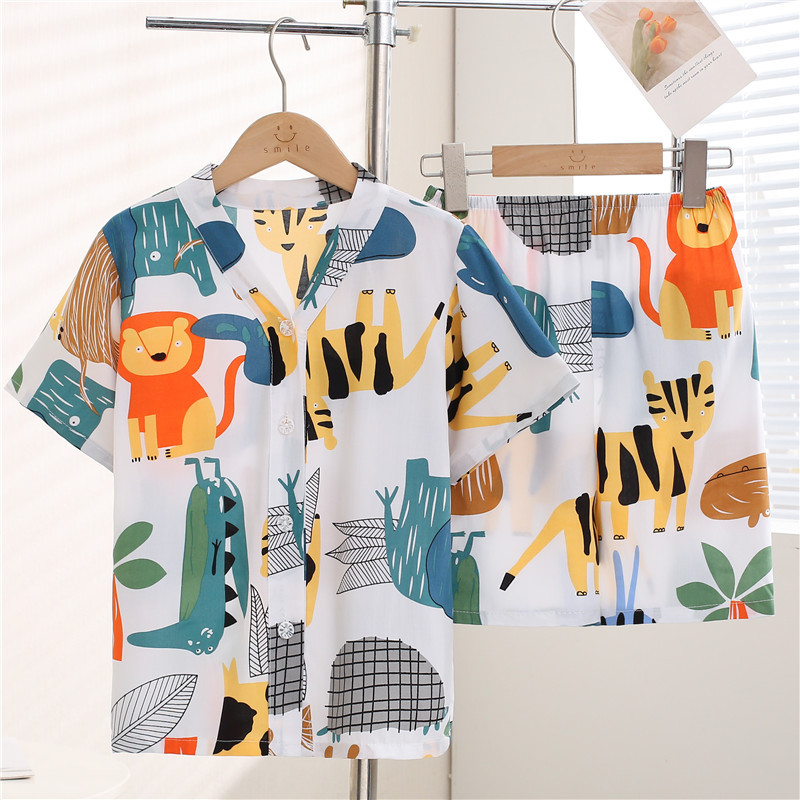 여름 새로운 어린이 가정 옷 소년 에어컨 옷 캐주얼 소녀 면 실크 세트 얇은 아기 잠옷