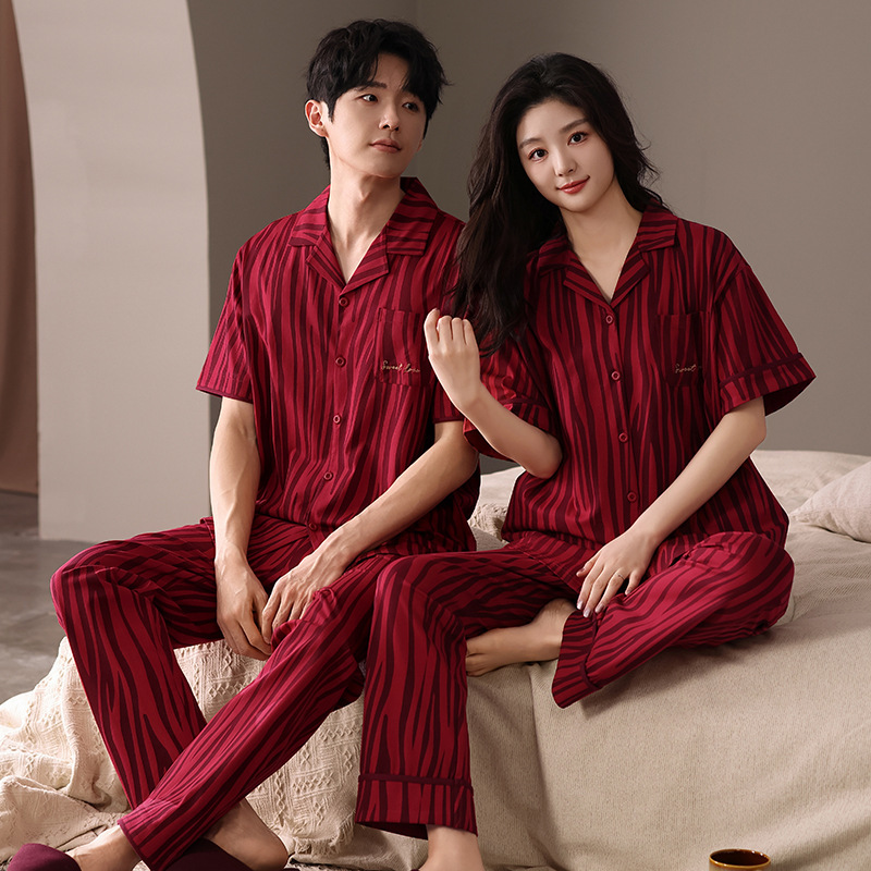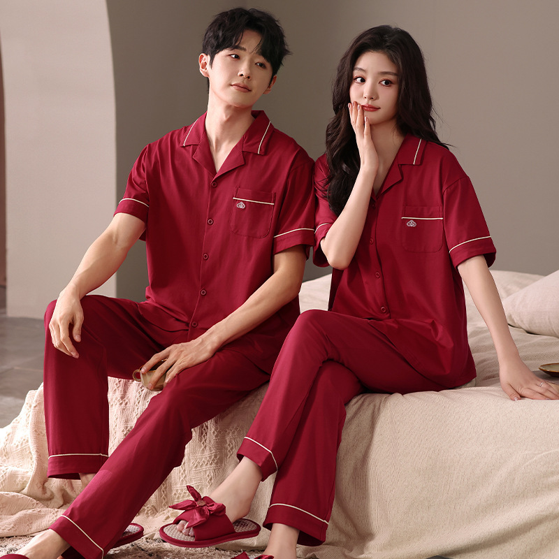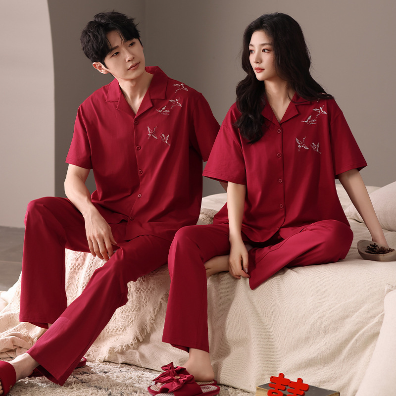 2025 여름 결혼식 순수 코튼 웨딩 레드 코튼 커플 잠옷 반팔 남성과 여성 결혼식 커플 홈웨어스토어 가기