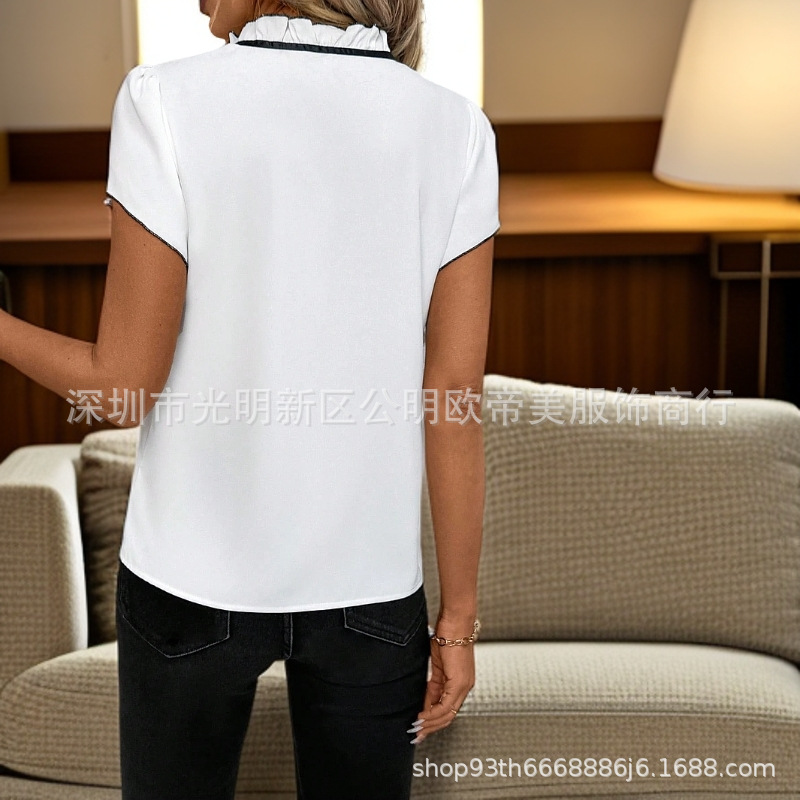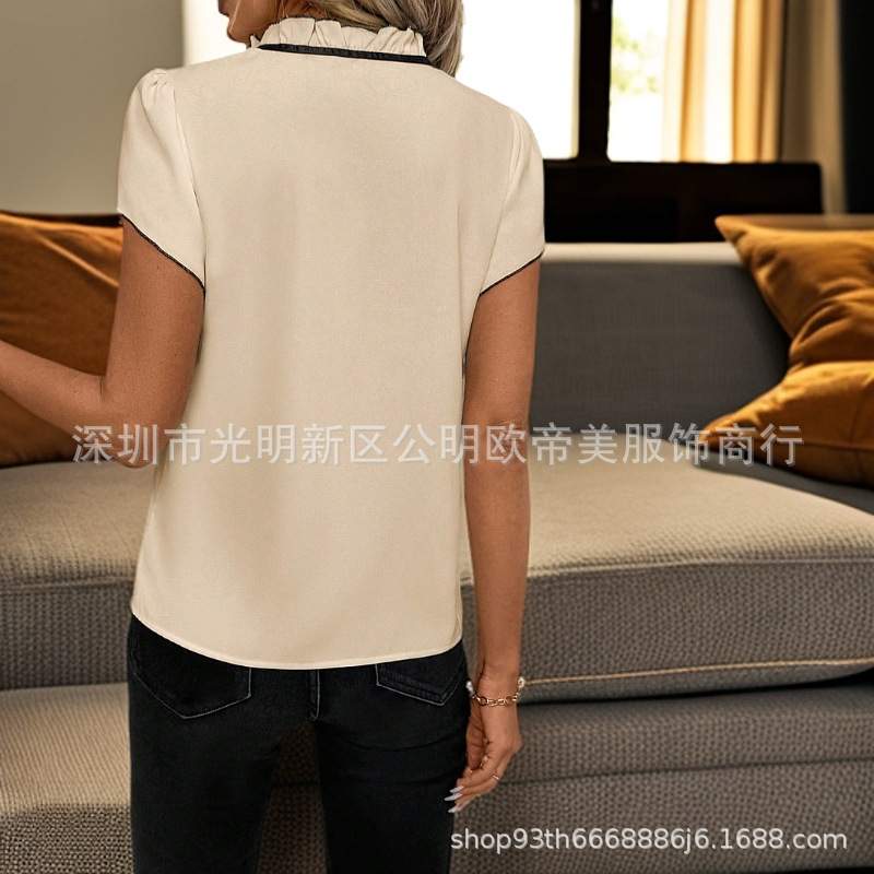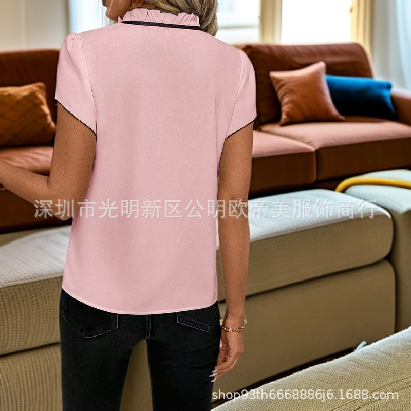 2025 여름 Amazon Cross-border TK 여성 우아한 솔리드 웨이브 엣지 타이 반팔 우아한 셔츠