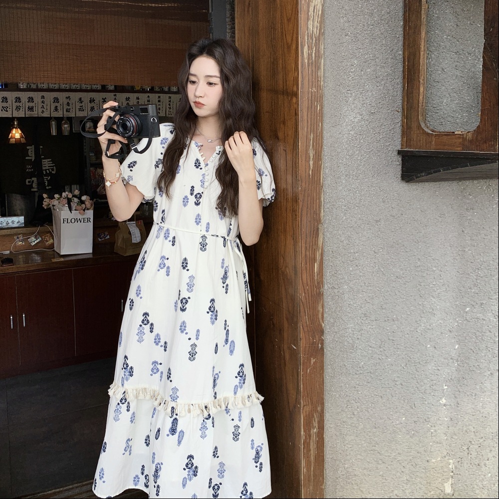 리얼 샷 화이트 플로랄 원피스 2025 새로운 홀리데이 스타일 보헤미안 버블 슬리브 곰팡이 레이스 롱 원피스스토어 가기