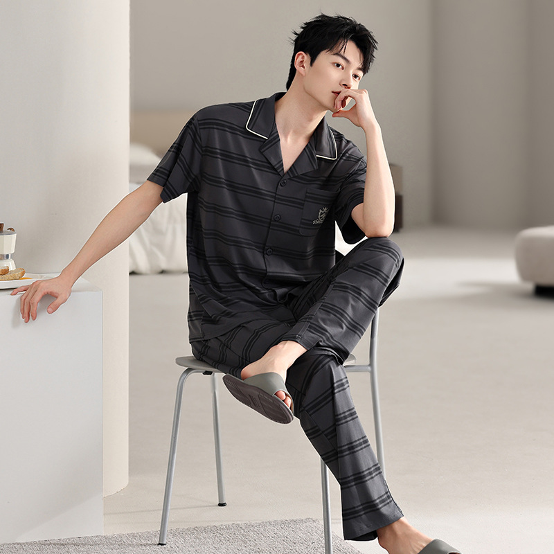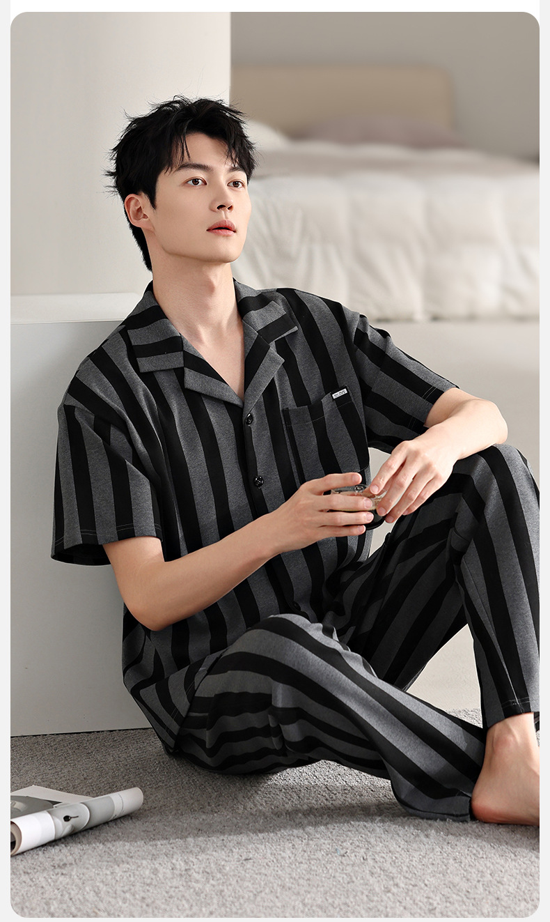클라우드 센스 풀 랙 쿨 코튼 남성용 잠옷 여름 얇은 옷깃 카디건 짧은 소매 바지 느슨한 캐주얼 플러스 사이즈 십대스토어 가기
