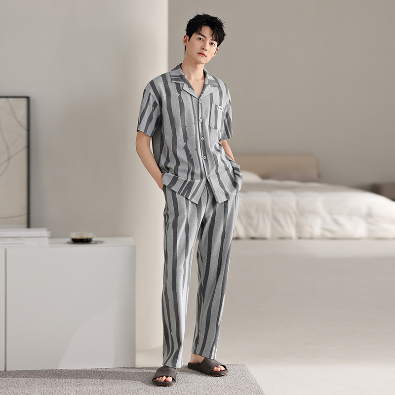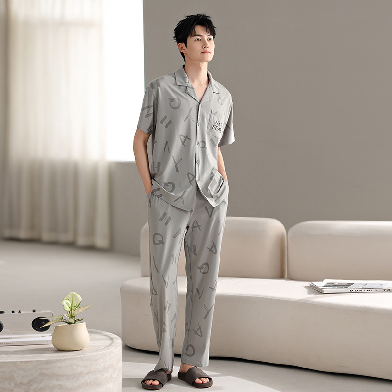 클라우드 센스 풀 랙 쿨 코튼 남성용 잠옷 여름 얇은 옷깃 카디건 짧은 소매 바지 느슨한 캐주얼 플러스 사이즈 십대