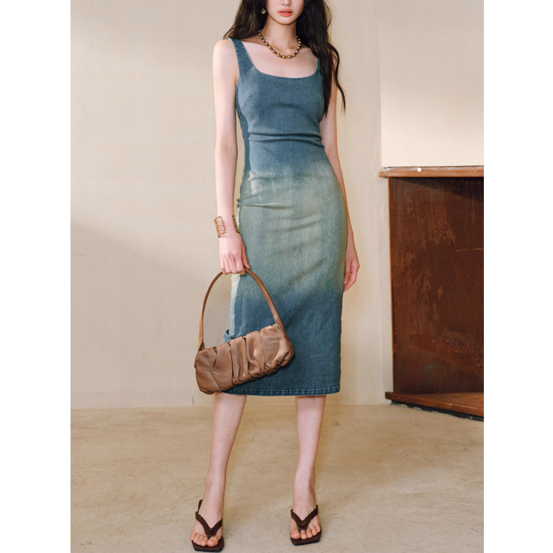 Shurou 데님 면화 그라디언트 비네트 | 중공업 효소 워시 튀긴 모래 | U-목 허리 조끼 원피스 프랑스 원피스스토어 가기