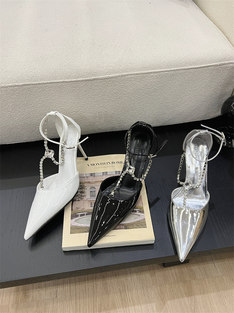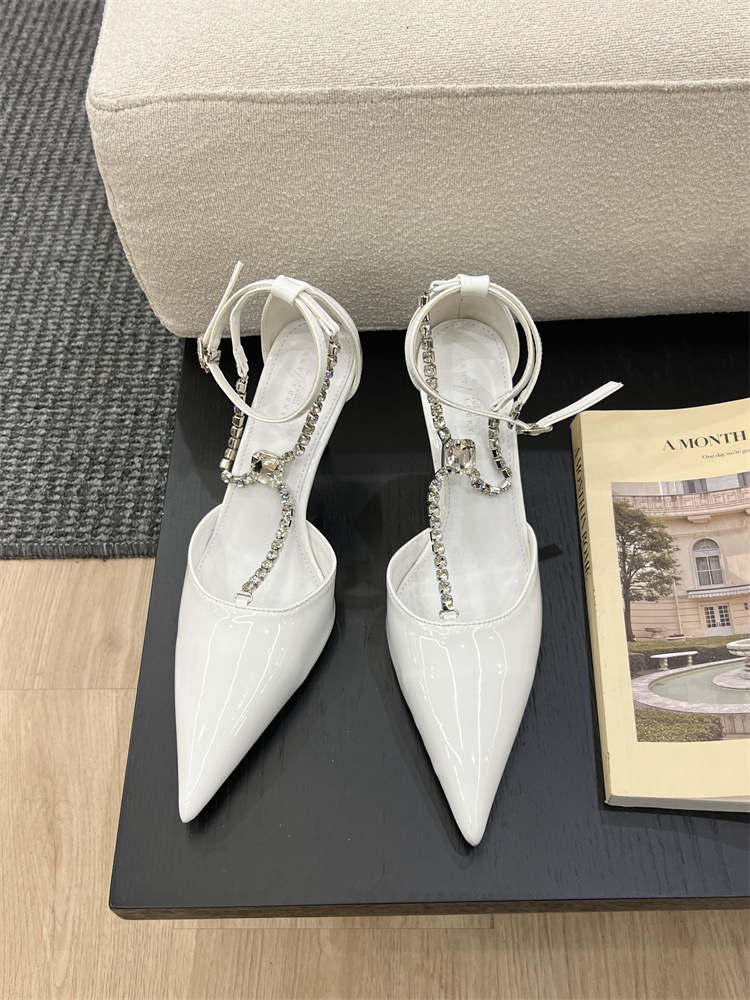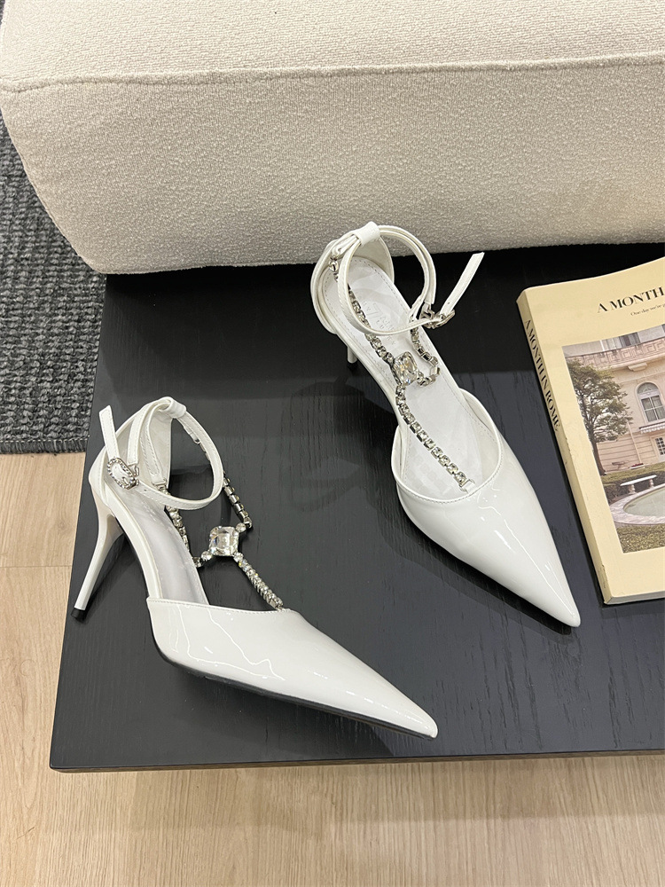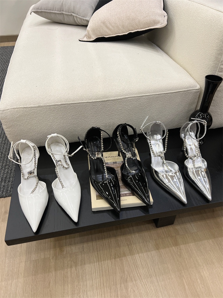 여성을위한 뾰족한 발가락 가죽 가죽 백 힐 샌들 2024 여름 섹시한 발가락 라인 석 T 스트랩 스틸레토 하이힐스토어 가기