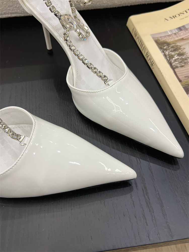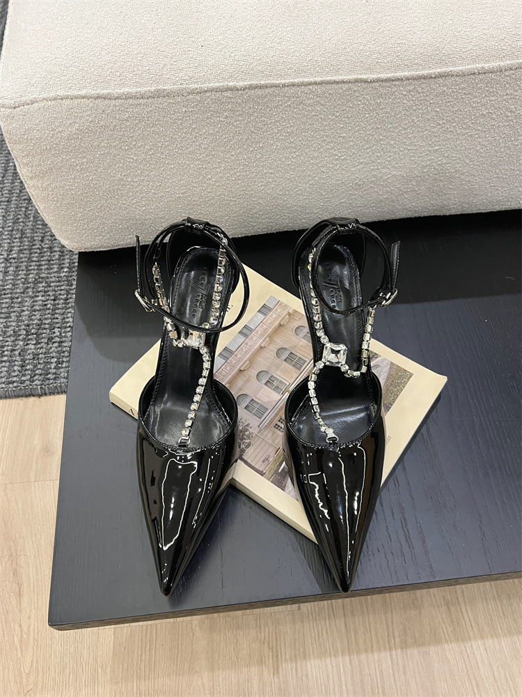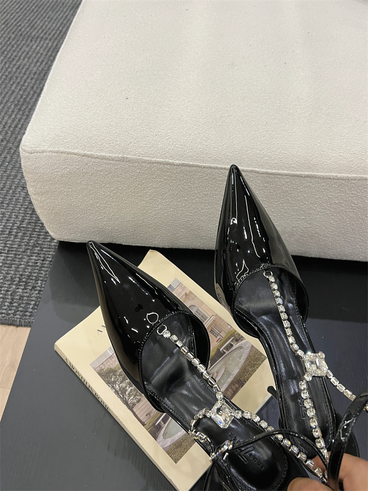여성을위한 뾰족한 발가락 가죽 가죽 백 힐 샌들 2024 여름 섹시한 발가락 라인 석 T 스트랩 스틸레토 하이힐