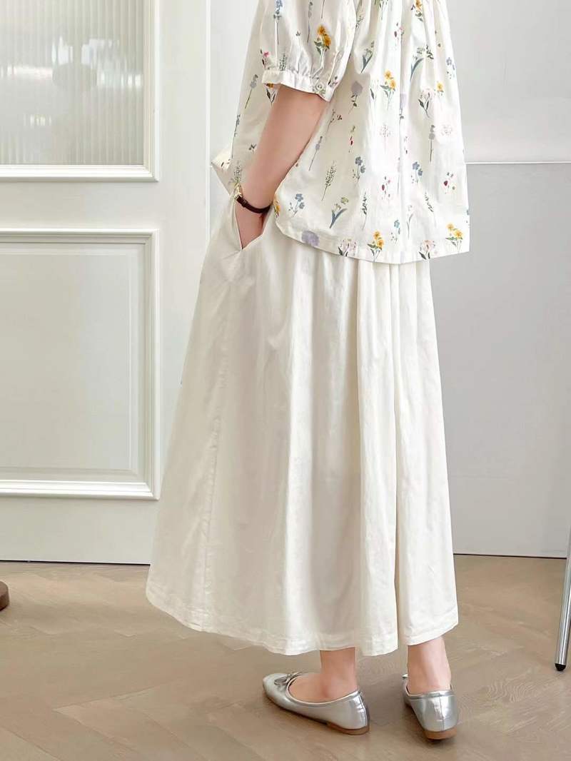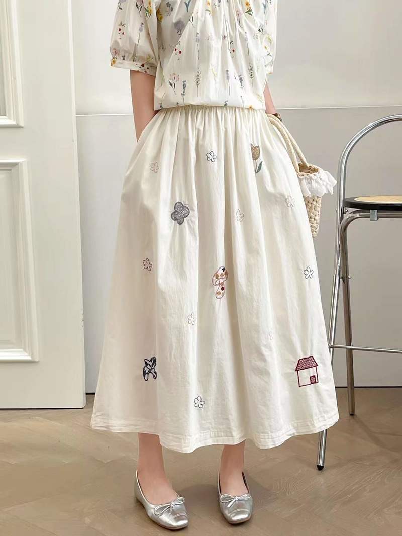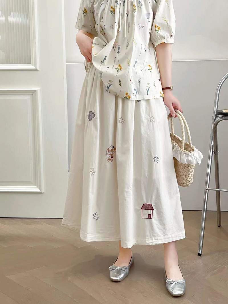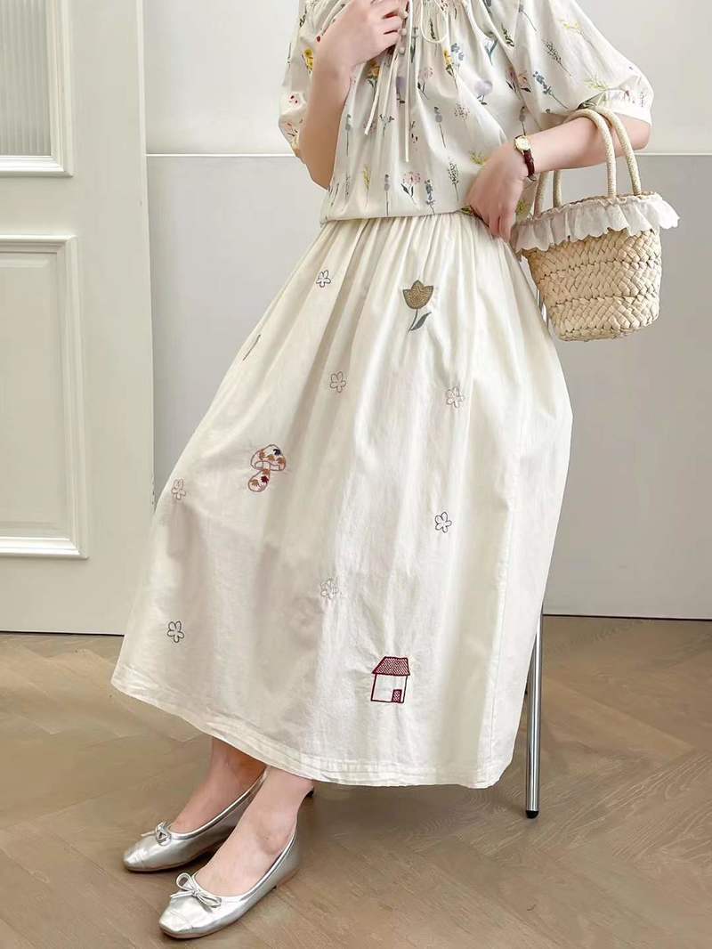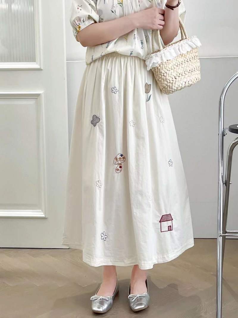 2025 여름 새로운 만화 자수 작은 집 느슨한 숙녀 탄성 허리 치마 도매 조수스토어 가기