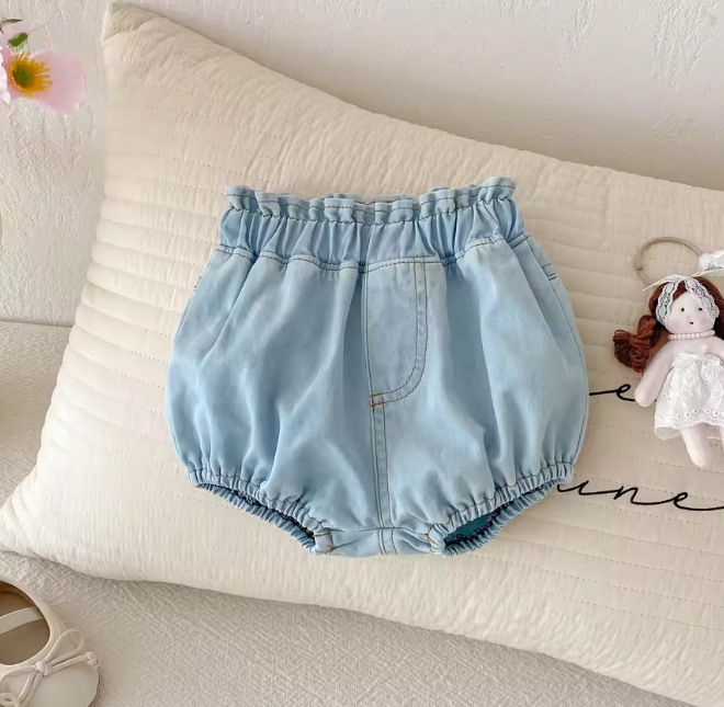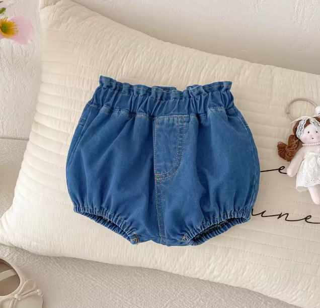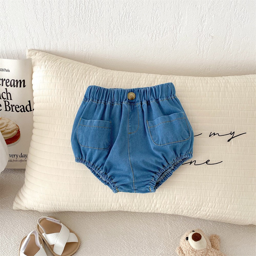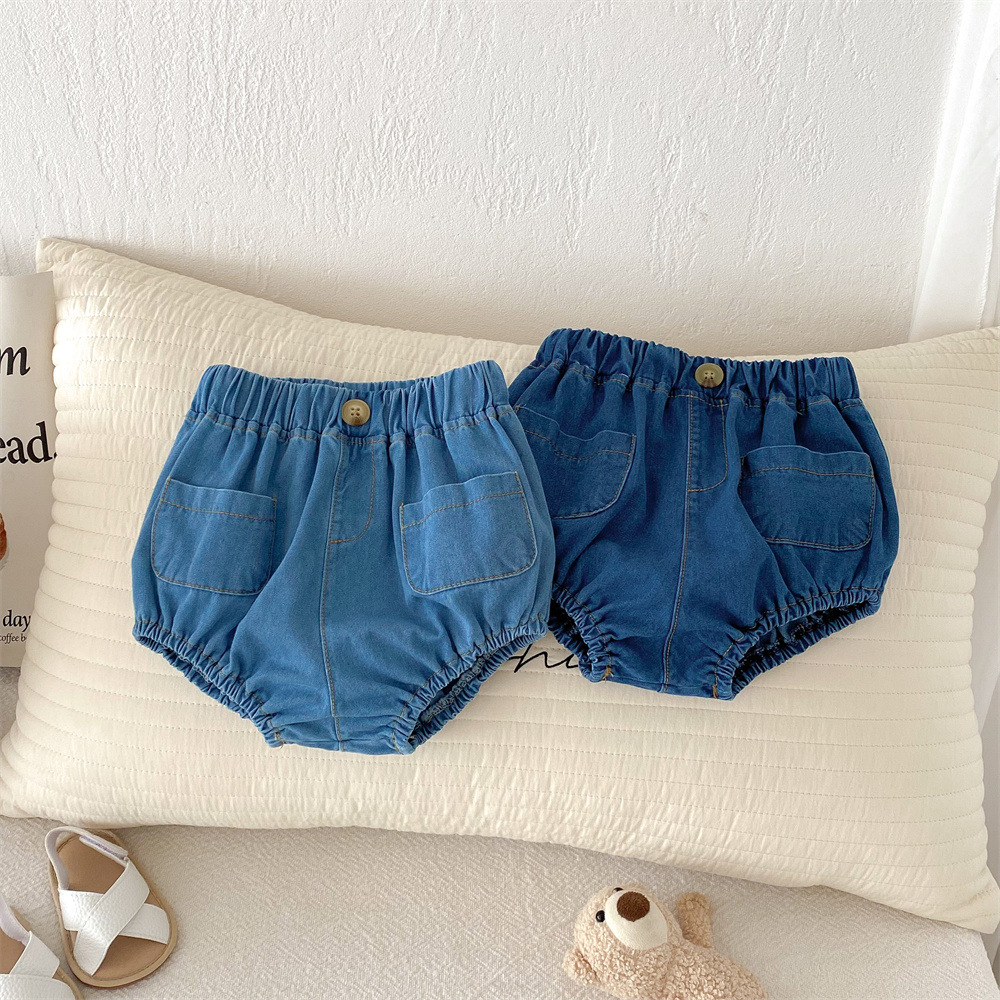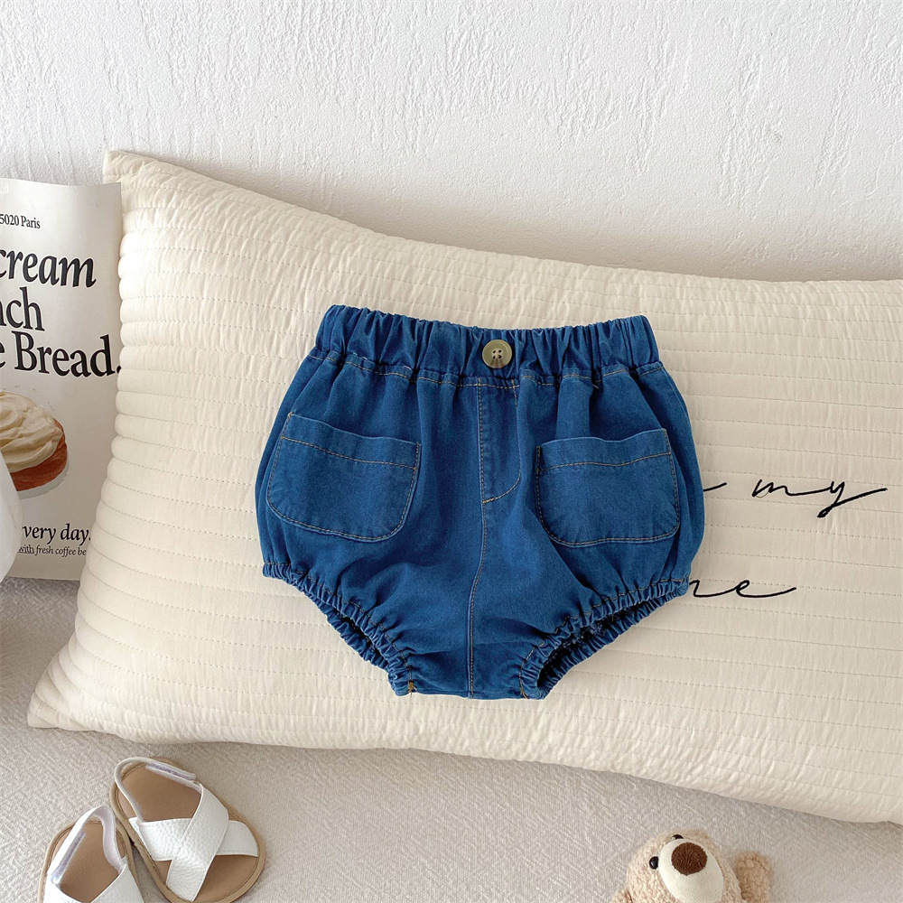 Ins 여름 한국어 버전 남성과 여성을위한 어린이 데님 반바지 아기 앞주머니 대형 pp 바지 면화 통기성 신생아 바지