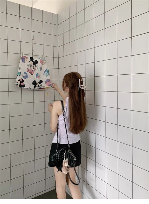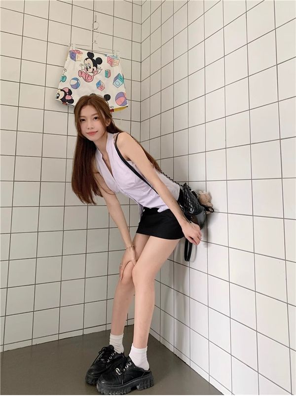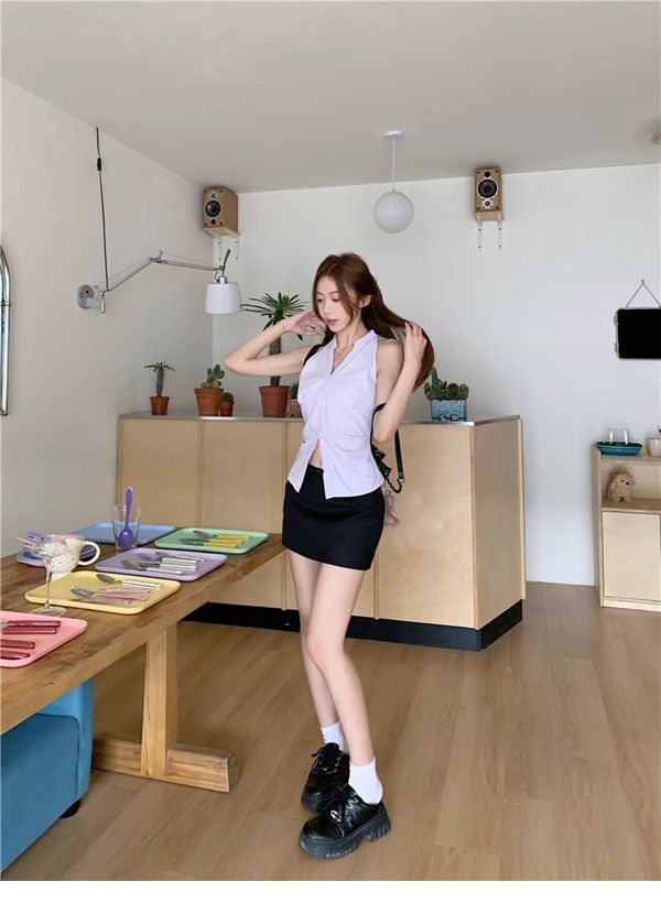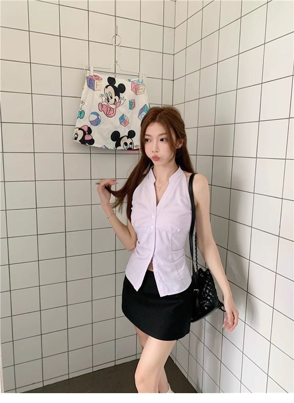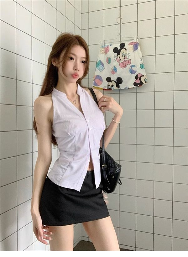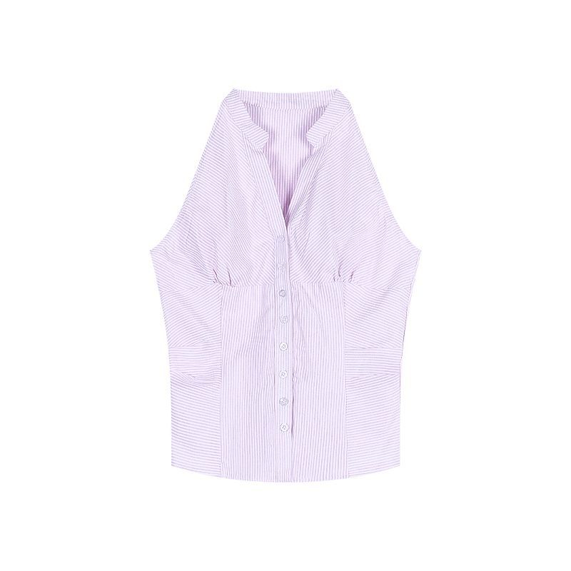 목에 매달린 한국 줄무늬 민소매 셔츠 여성용 여름 주름 허리 우아한 셔츠 디자인 센스 슬림 핏 쇼트 탑스토어 가기