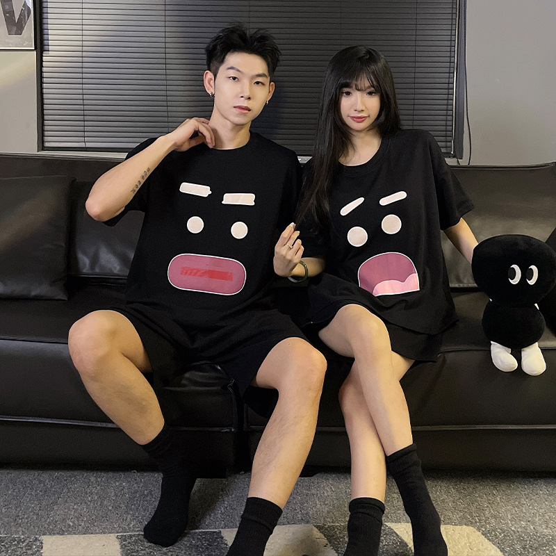 가슴 패드가 달린 잠옷 여성 여름 모조 면 짧은 소매 커플 만화 세트 남성 잠옷은 캐주얼 홈 옷을 입을 수 있습니다.스토어 가기