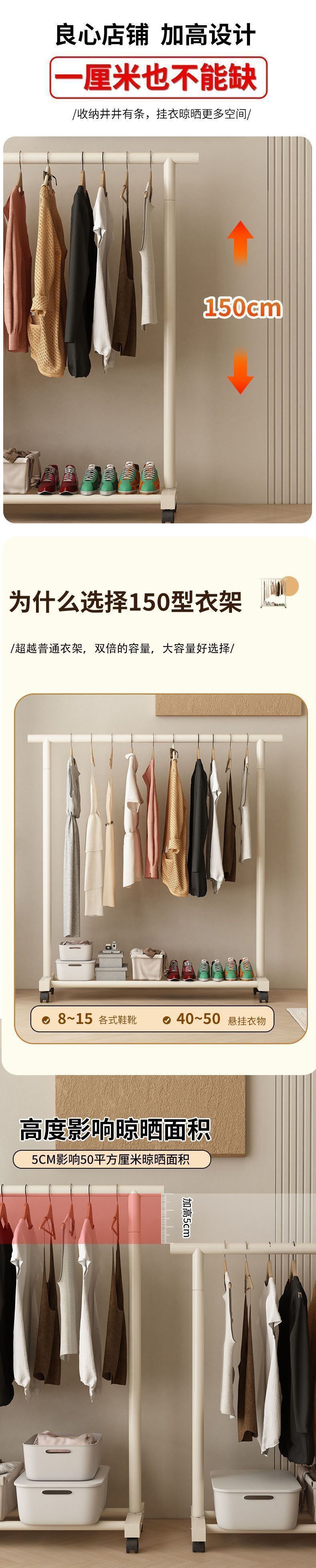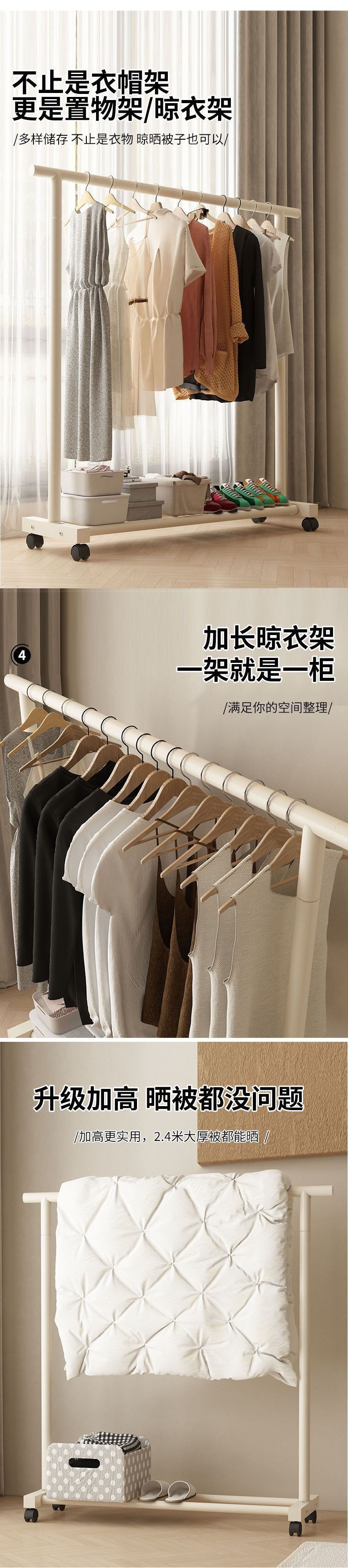 가정용 침실을 위한 매우 두꺼운 코트 랙 바닥 스탠딩 모바일 크림 스타일 옷 걸이 간단한 기숙사 옷 걸이 발코니 수직스토어 가기