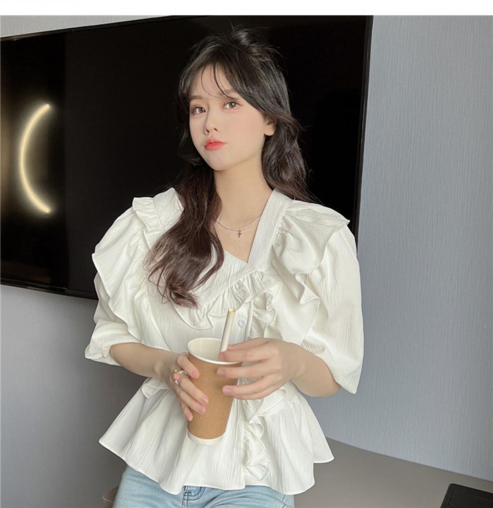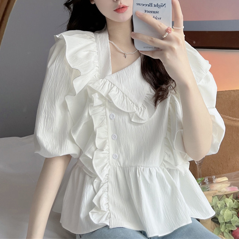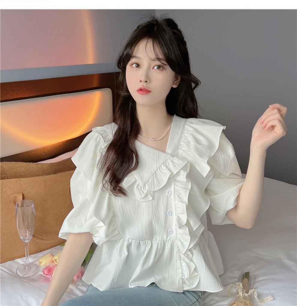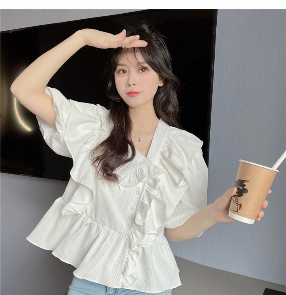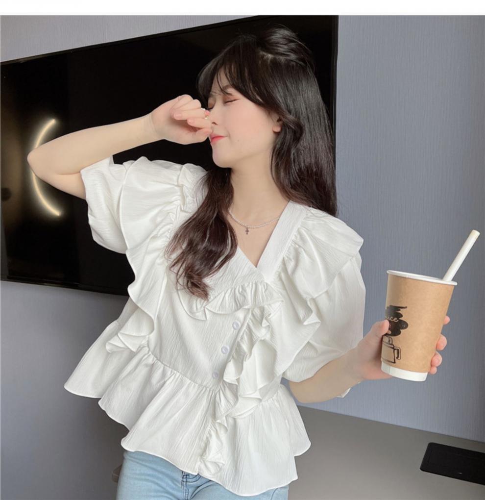 프렌치 러플 플러스 사이즈 쉬폰 반팔 티셔츠 여성용 여름 배 커버 슬림 퍼프 슬리브 인형 셔츠 탑스토어 가기