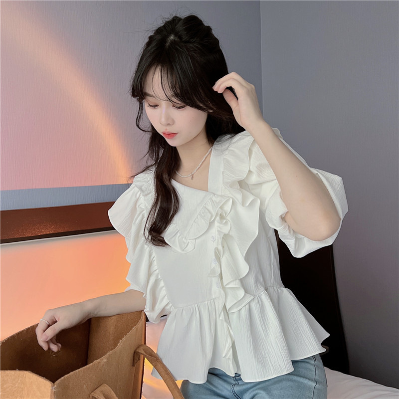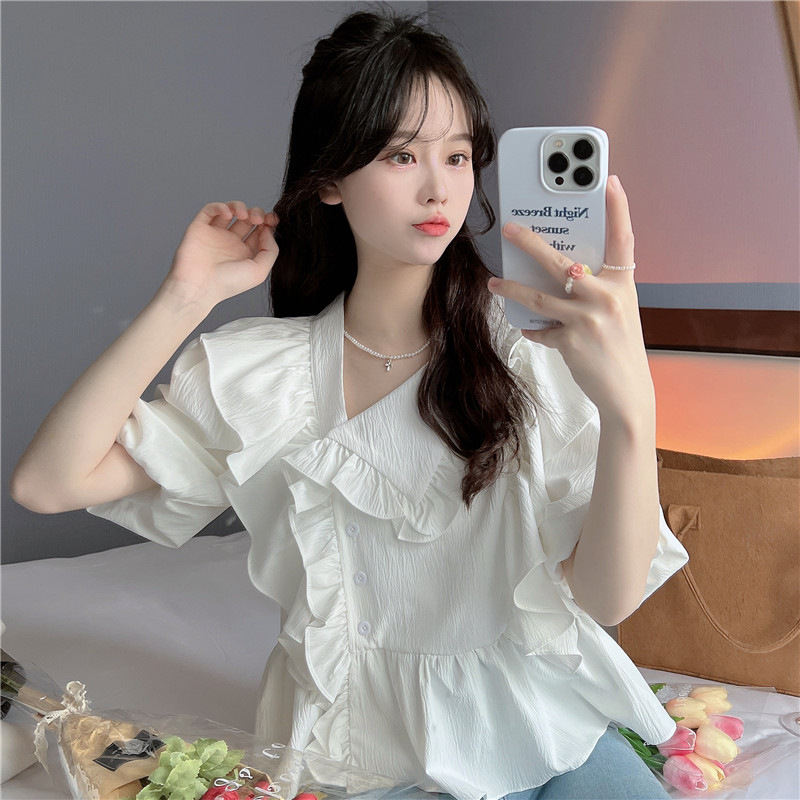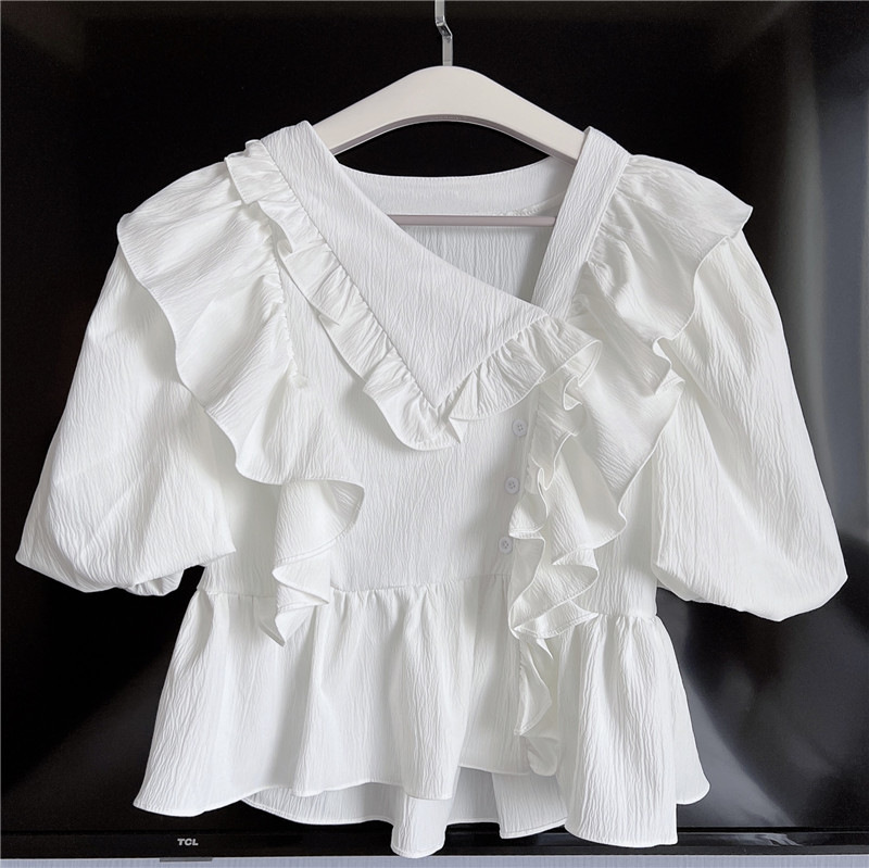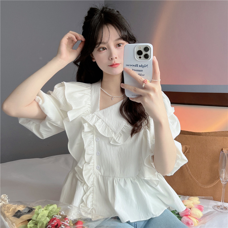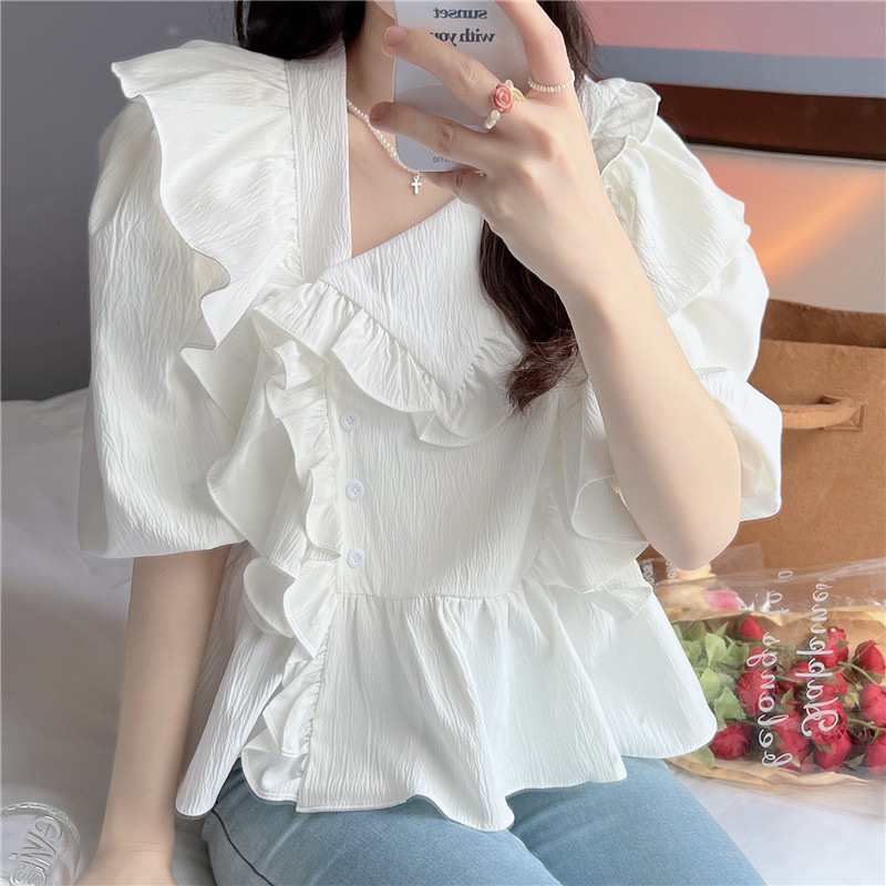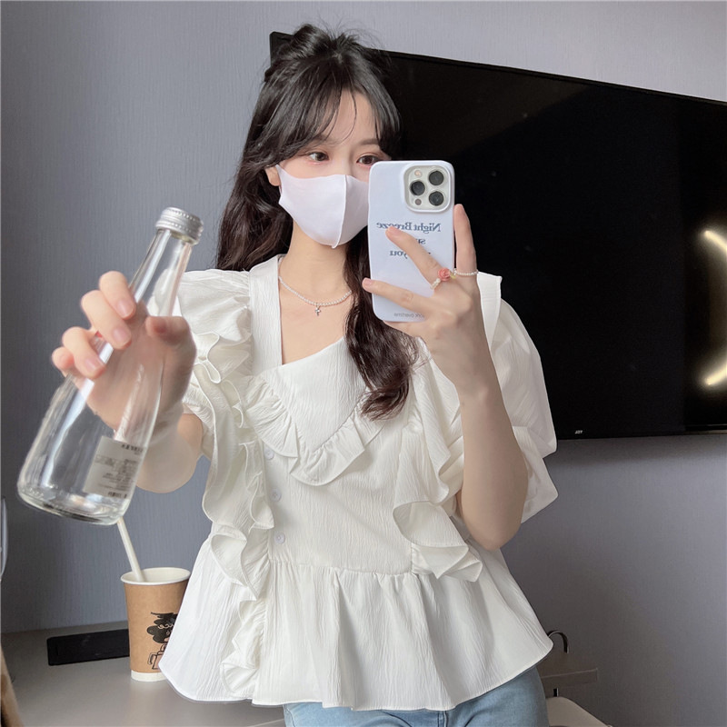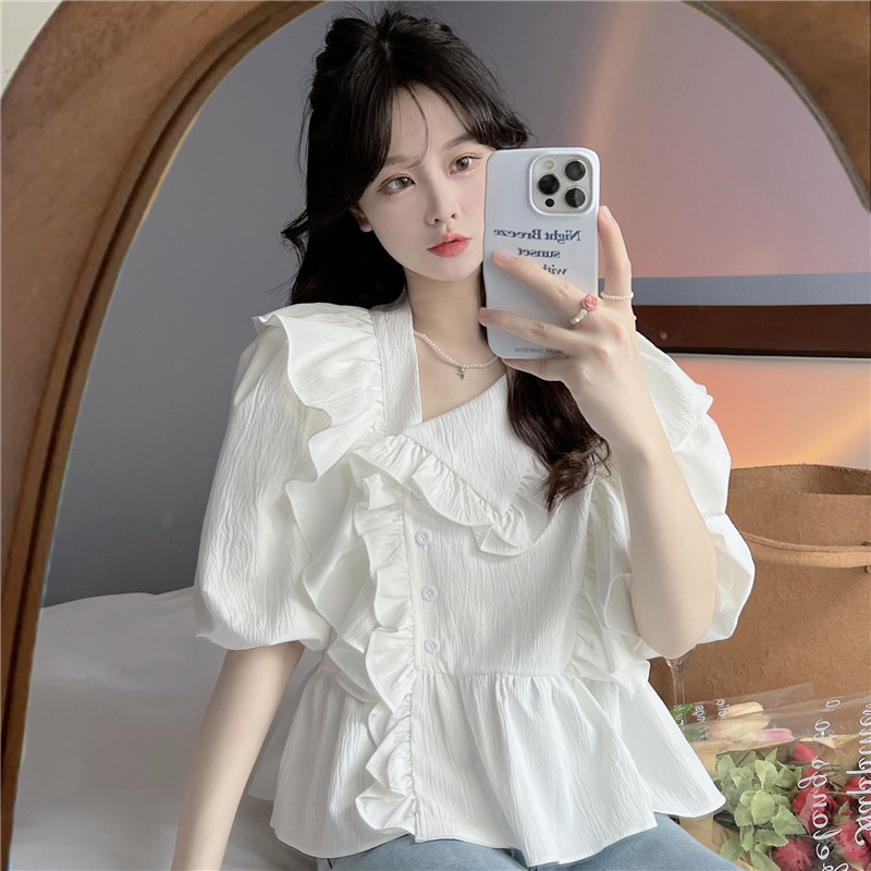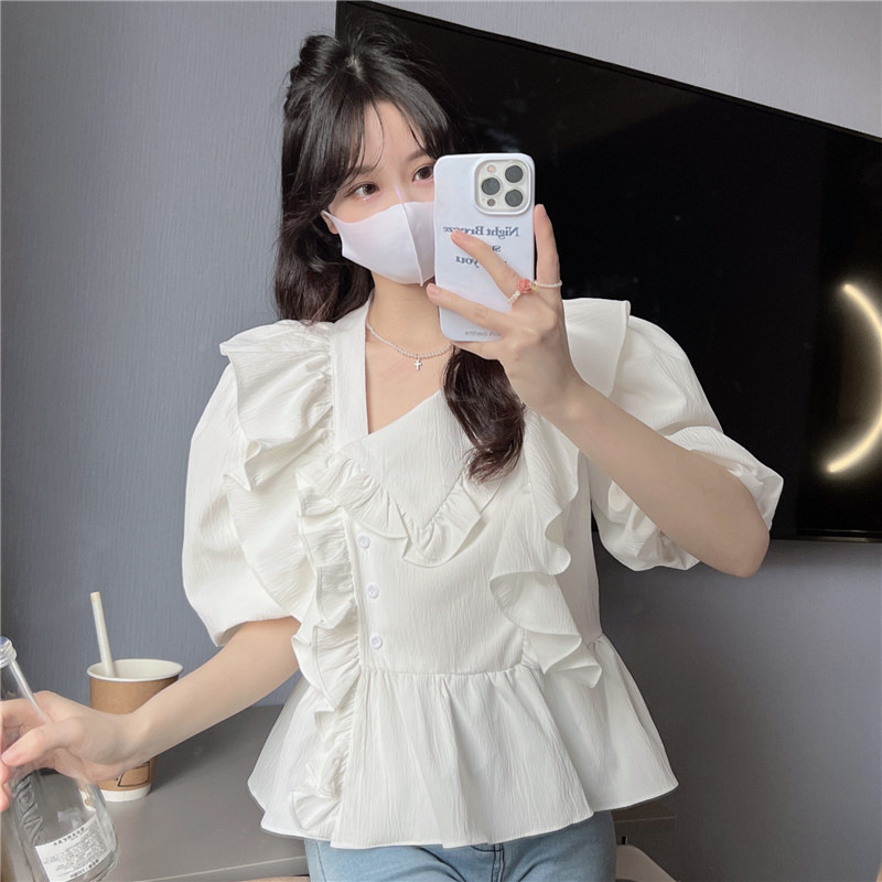 프렌치 러플 플러스 사이즈 쉬폰 반팔 티셔츠 여성용 여름 배 커버 슬림 퍼프 슬리브 인형 셔츠 탑스토어 가기