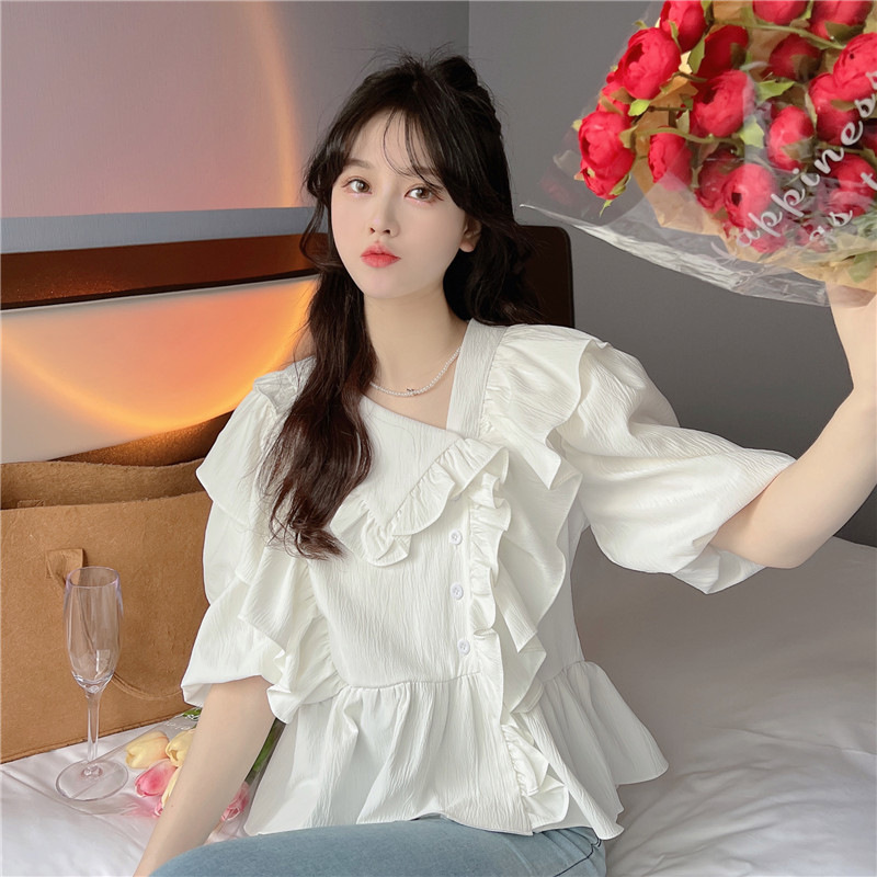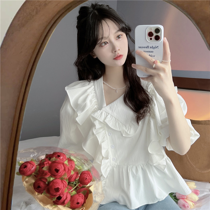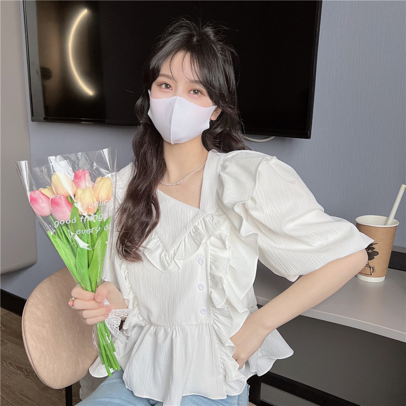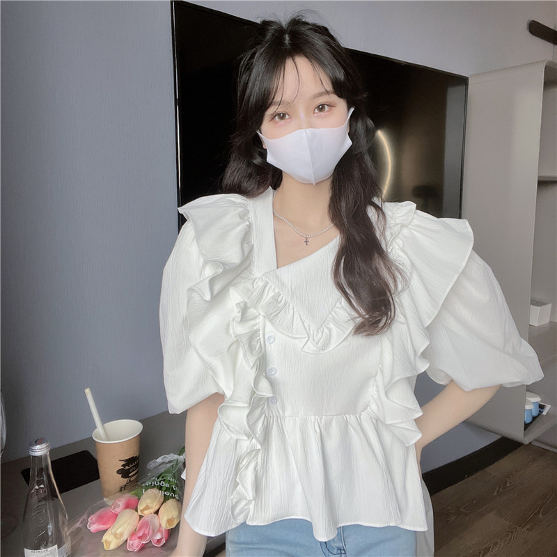 프렌치 러플 플러스 사이즈 쉬폰 반팔 티셔츠 여성용 여름 배 커버 슬림 퍼프 슬리브 인형 셔츠 탑