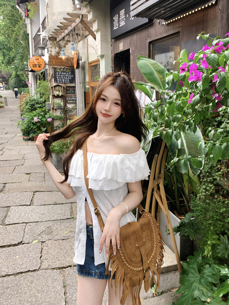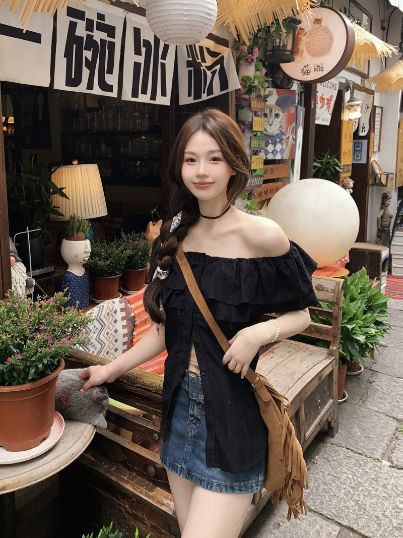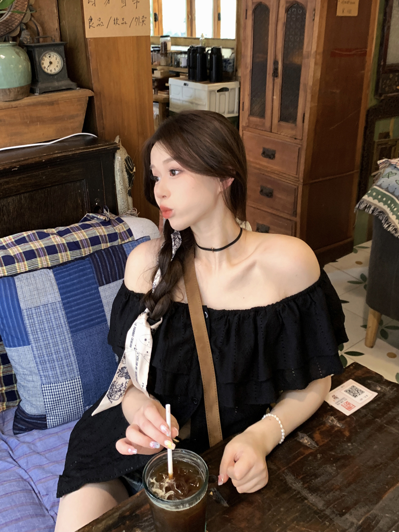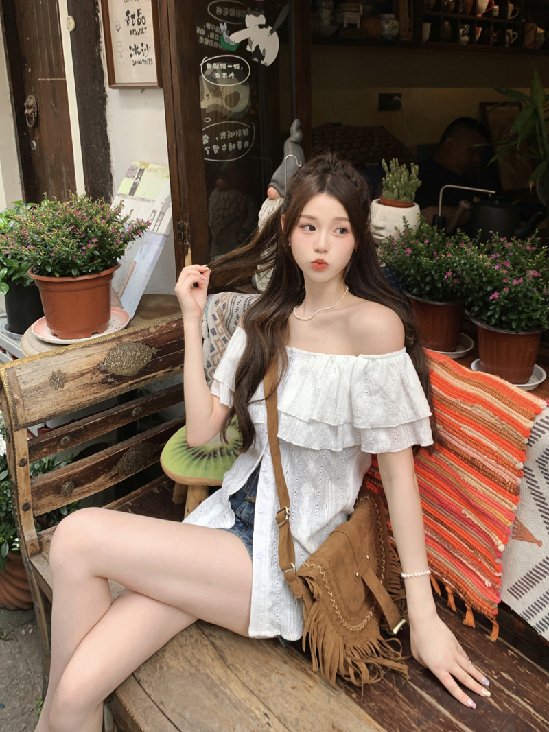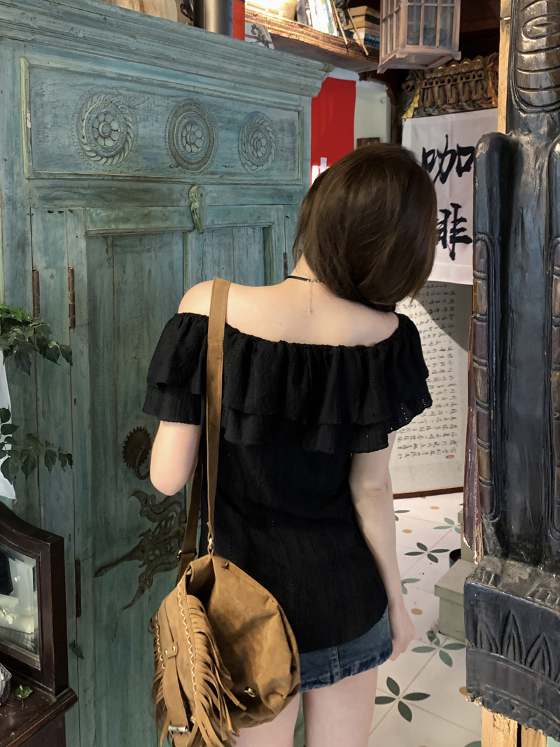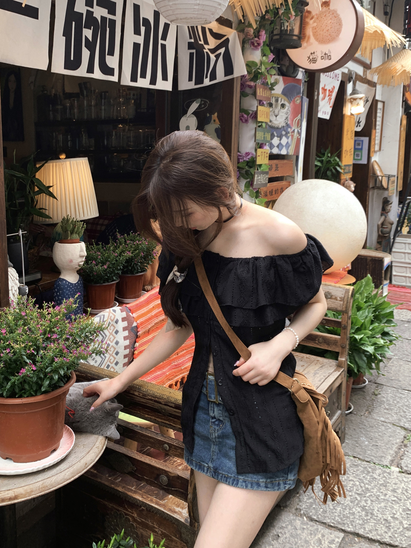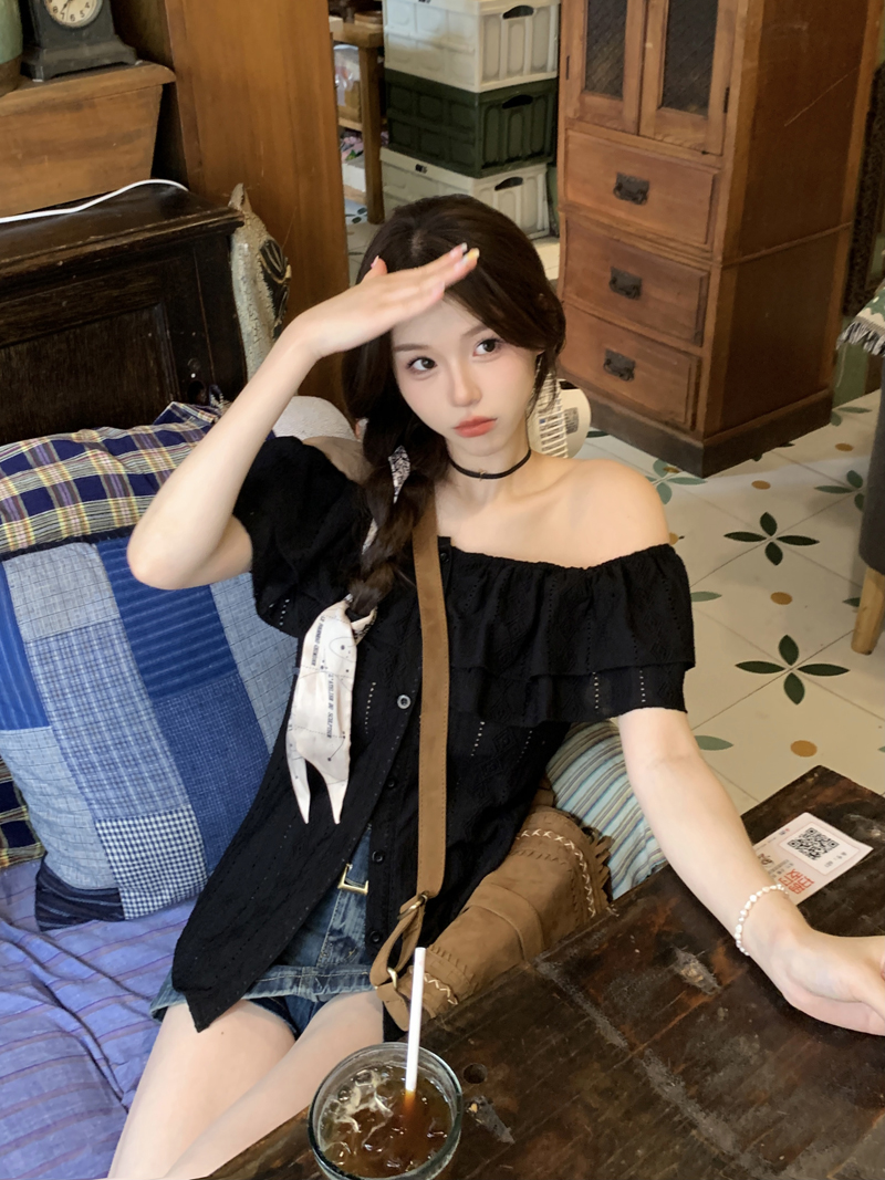 여름용 여성용 오프 숄더 반팔 셔츠 가벼운 요리 프랑스 스플릿 슬리밍 디자인 틈새 달콤하고 매운 오프 숄더 탑