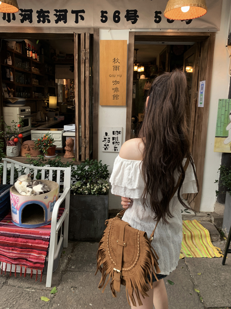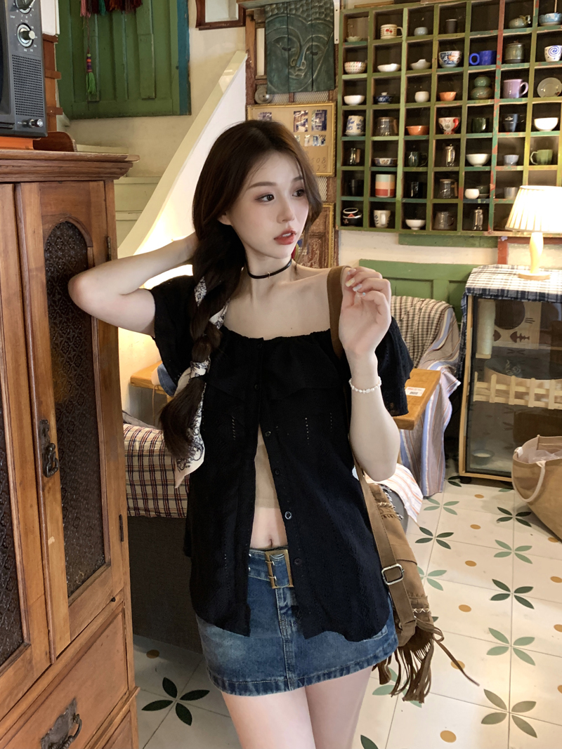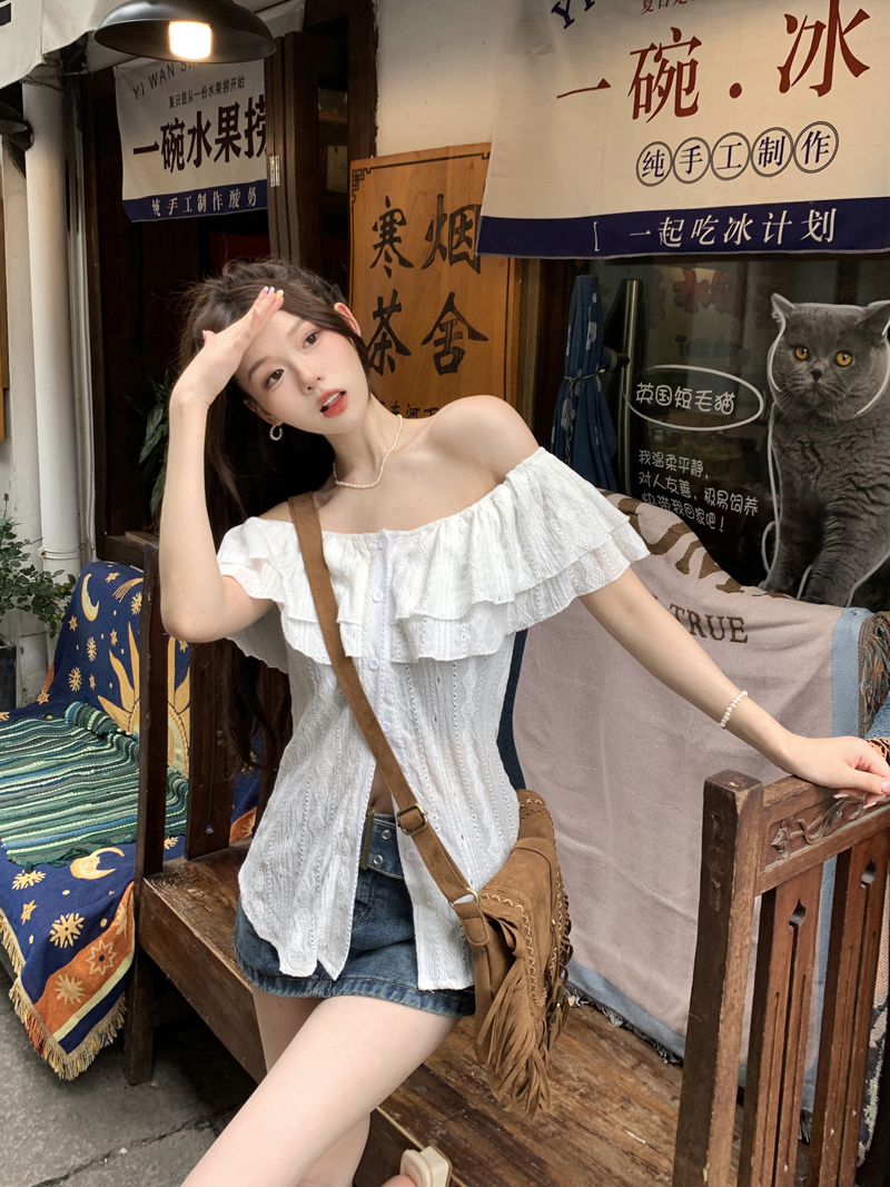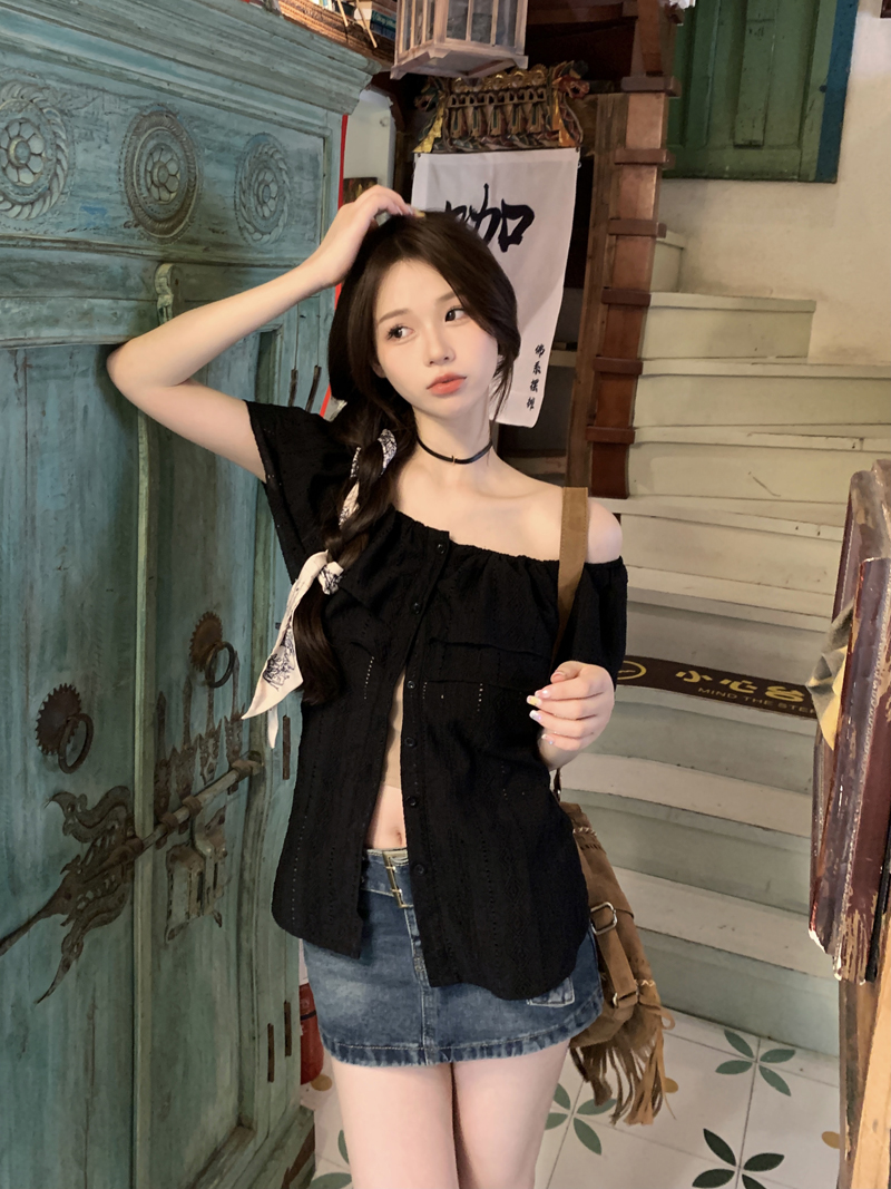 여름용 여성용 오프 숄더 반팔 셔츠 가벼운 요리 프랑스 스플릿 슬리밍 디자인 틈새 달콤하고 매운 오프 숄더 탑스토어 가기