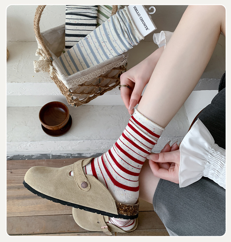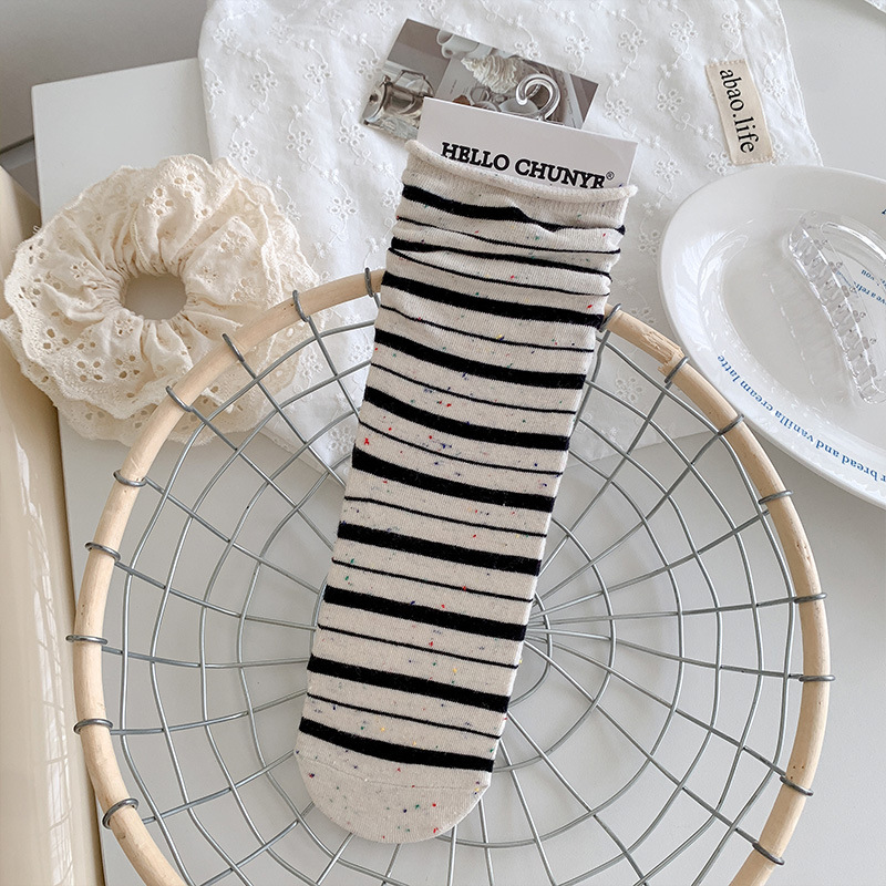 한국 스타일 양말 여성 학술 스타일 도트 원사 롤 가장자리 줄무늬 스택 양말 봄과 여름 얇은 내부 트렌디 양말 미드 튜브 코튼 양말