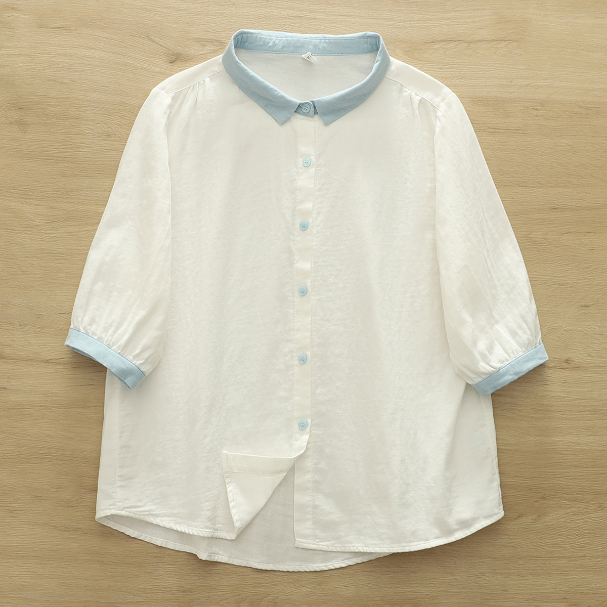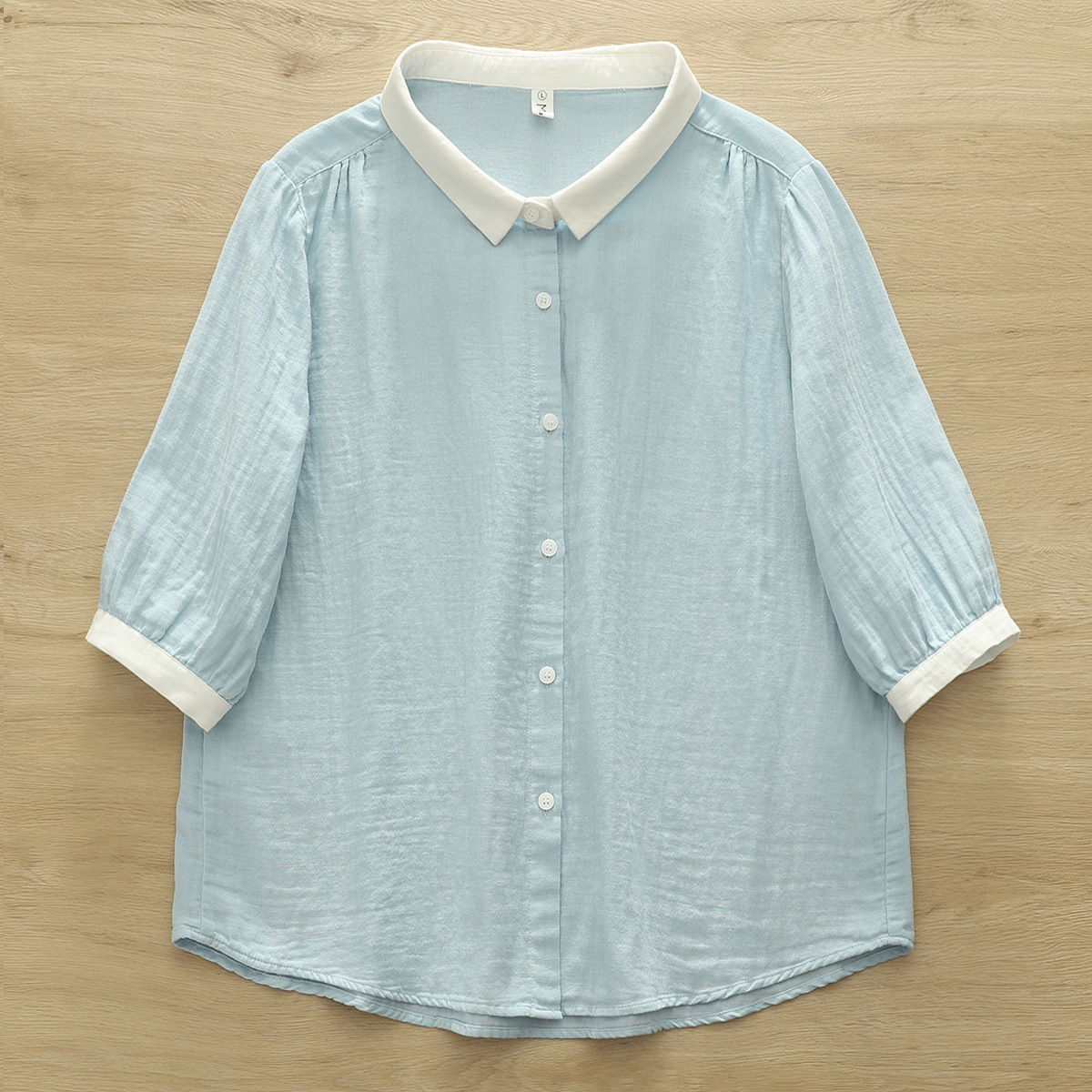 한국 스타일 컬러 블록 통기성 코튼 원사 단일 가슴 5 소매 셔츠 여성의 2025 여름 새로운 슬림 룩 탑
