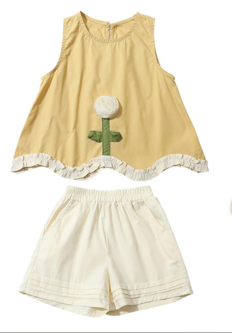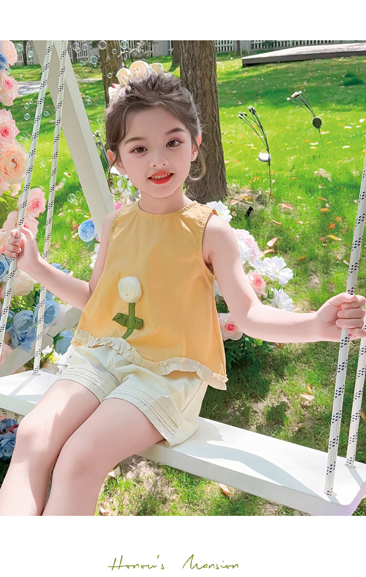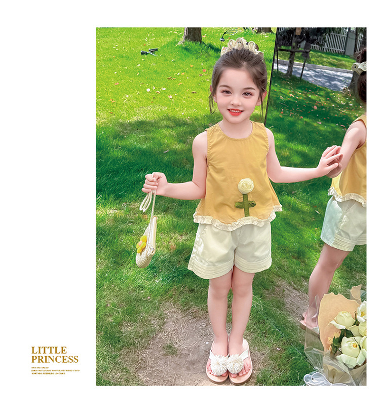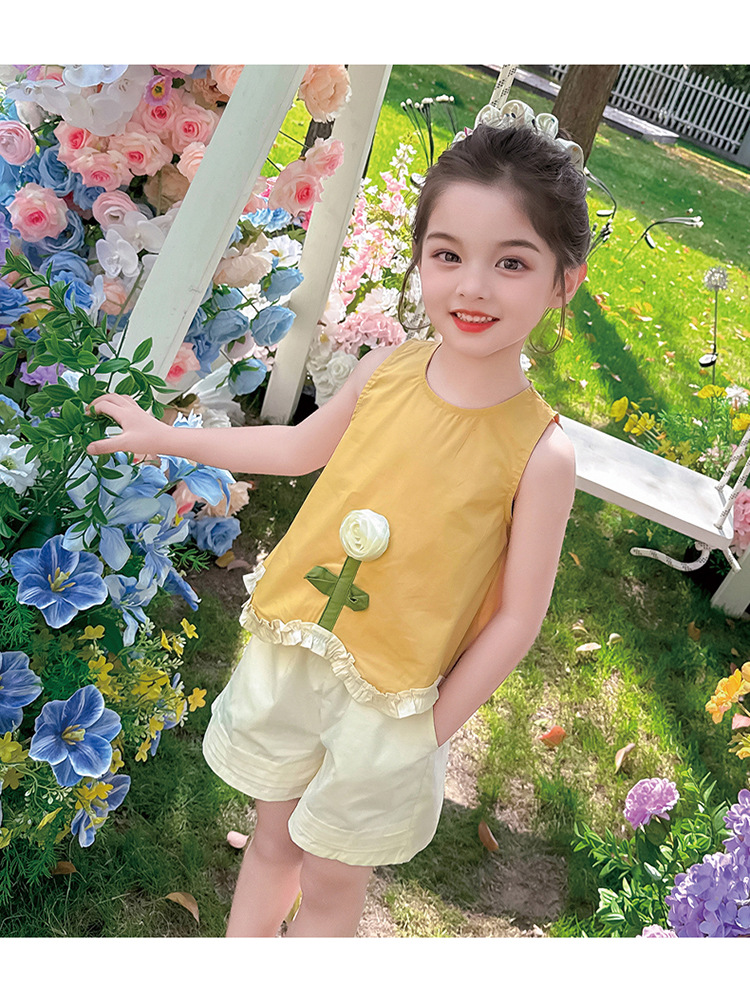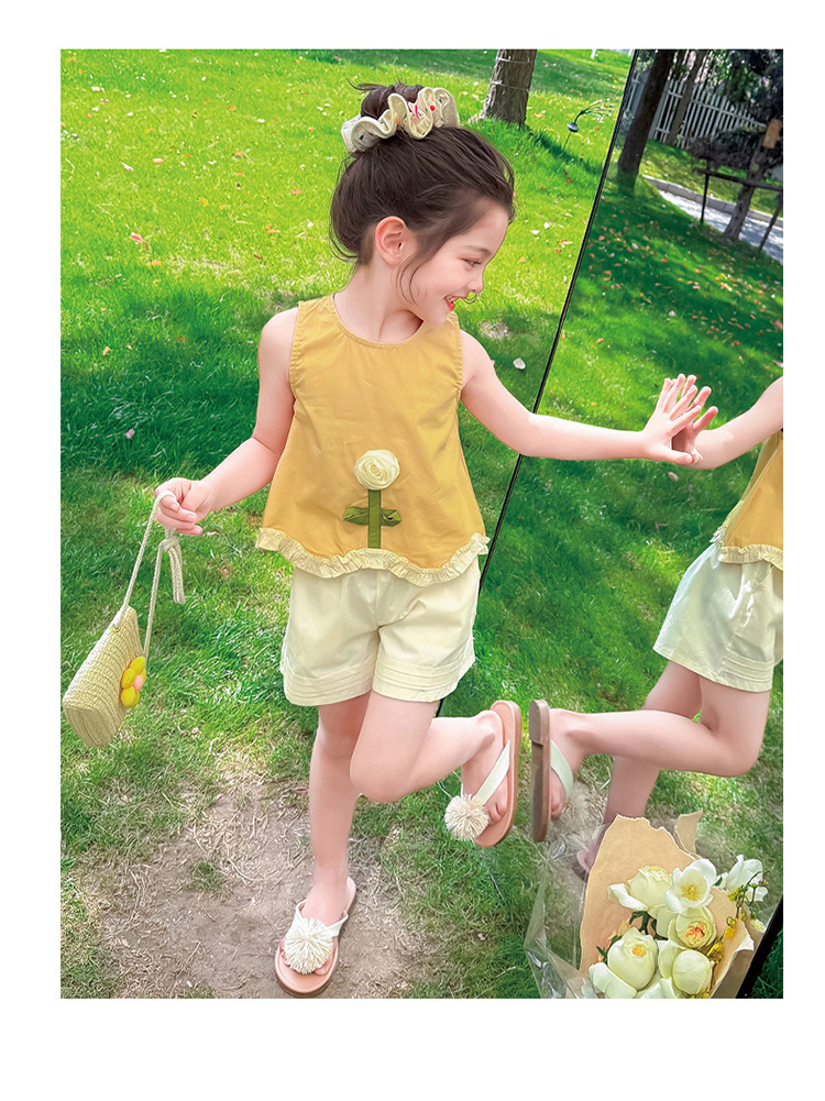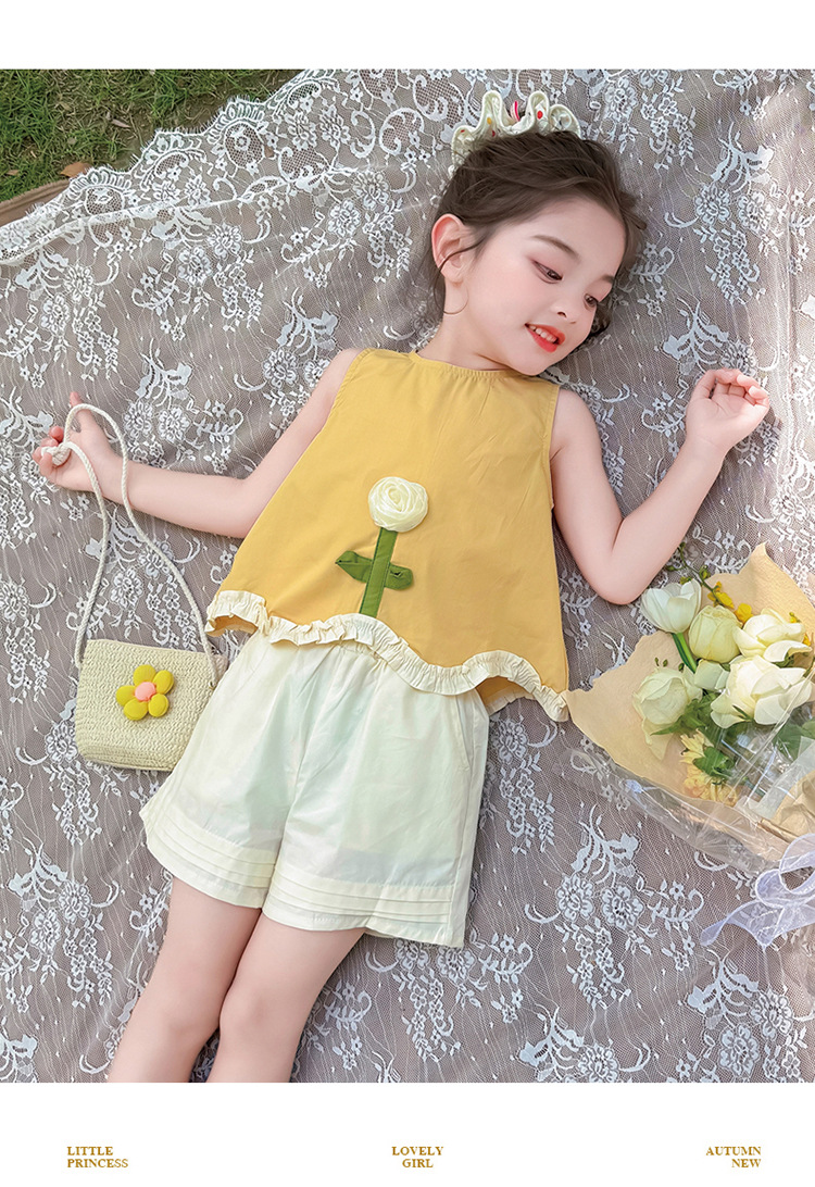 소녀의 세련된 3 차원 꽃 귀 가장자리 세트 2025 여름 새로운 패션 소녀의 세련된 투피스 세트