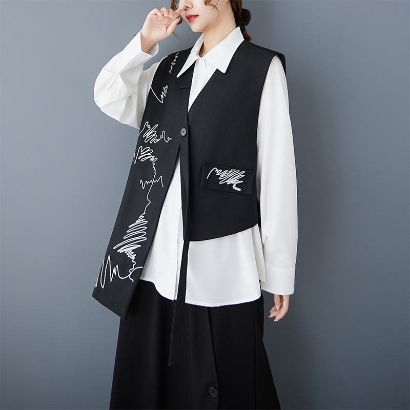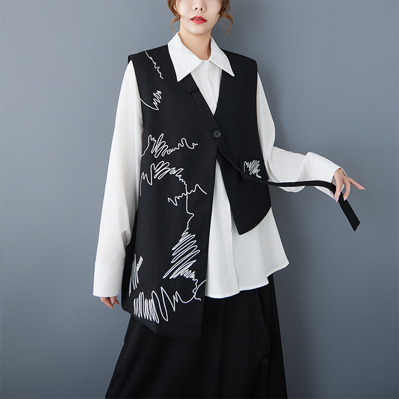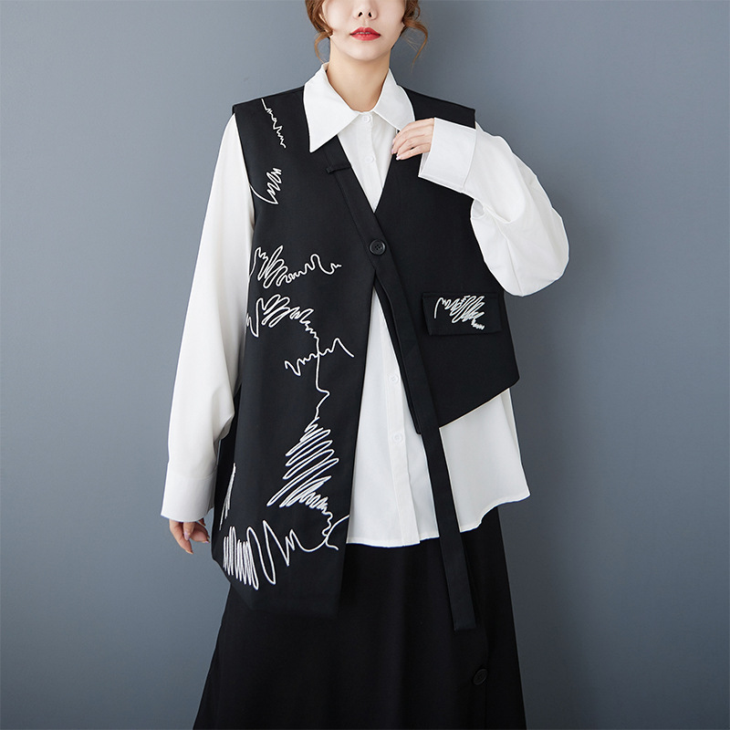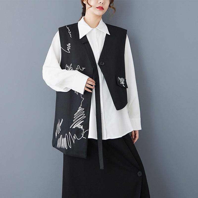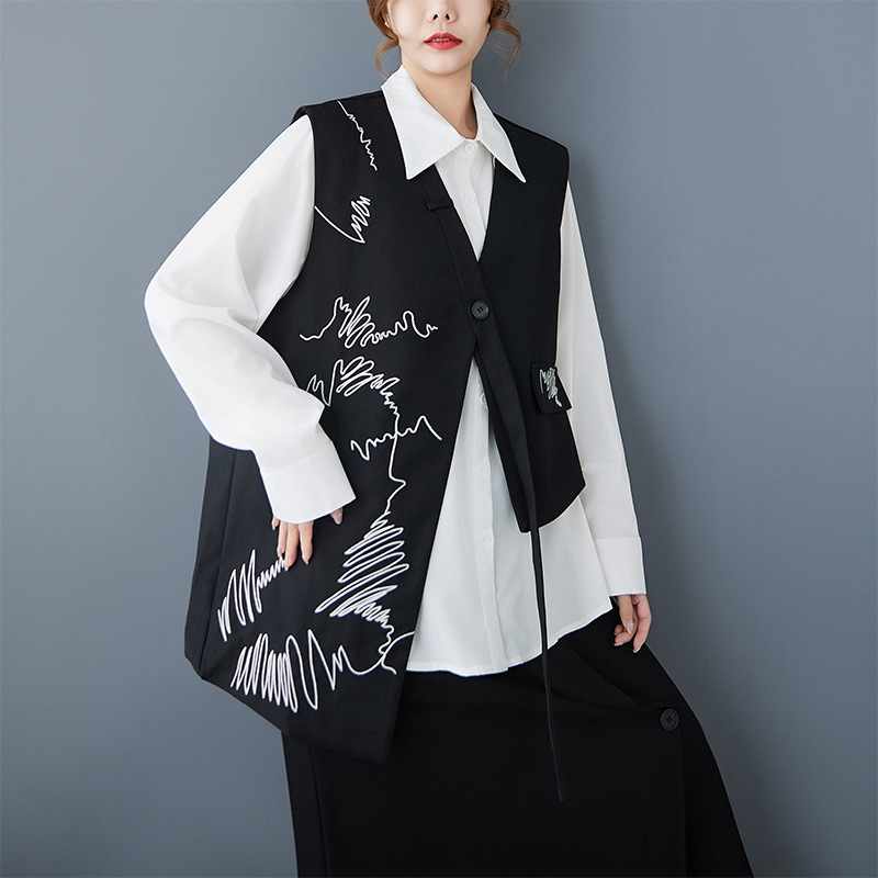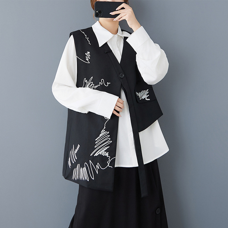2025 봄 새로운 복고풍 검은색 조끼 디자인 불규칙한 맞춤형 자수 느슨한 패션 다재다능한 여성