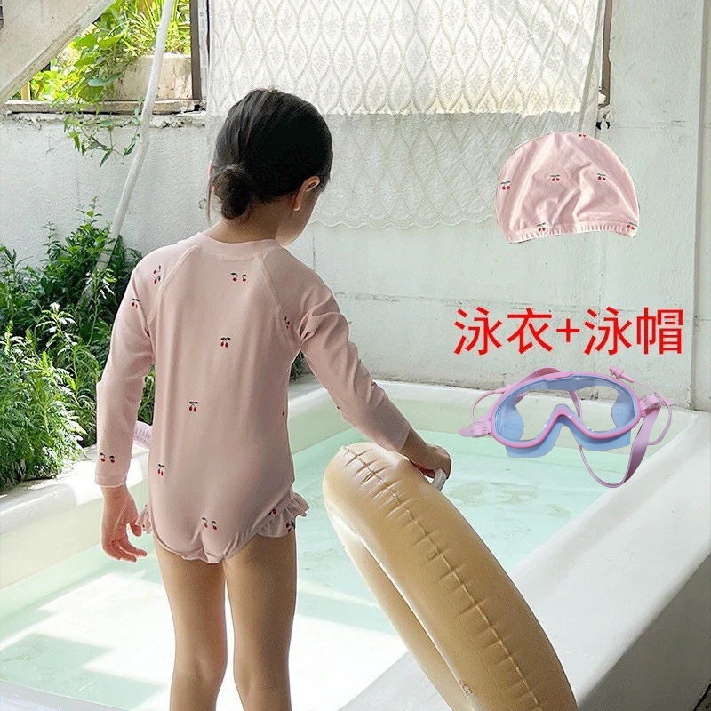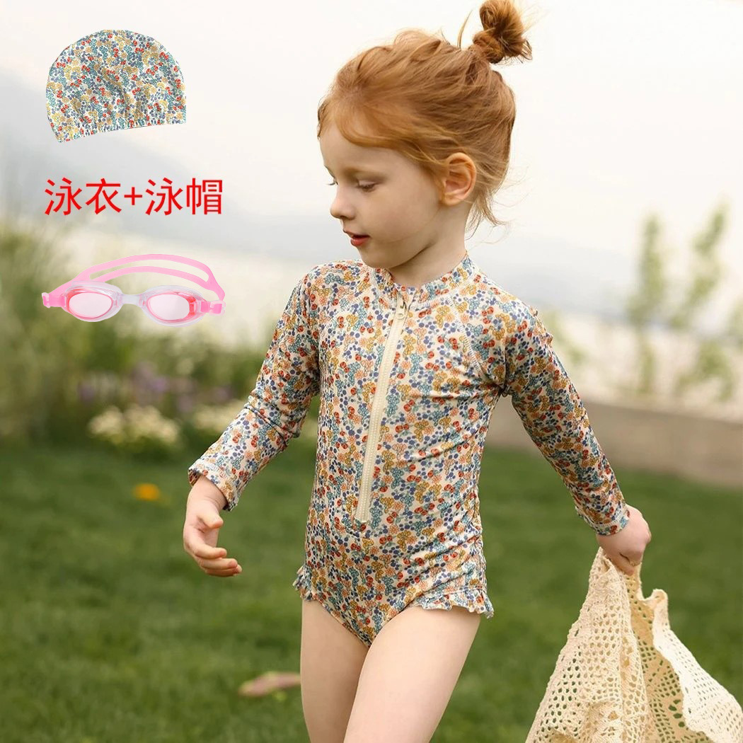 2025 여름 여아 크로스보더 속건성 긴팔 수영복 아기 및 중소형 아동용 세련된 꽃무늬 대외 무역 원피스 수영복