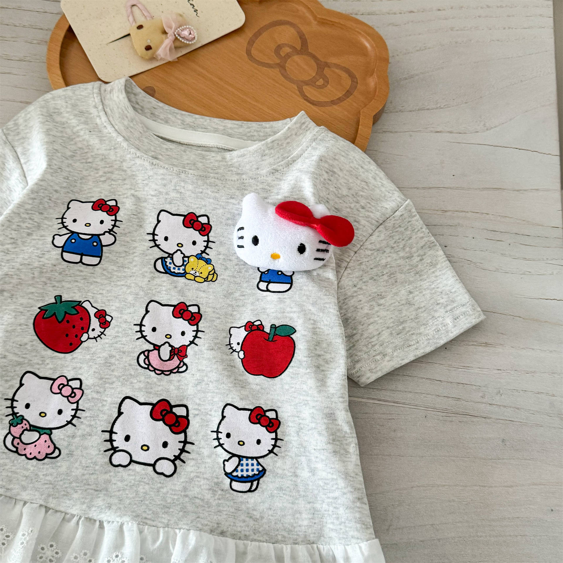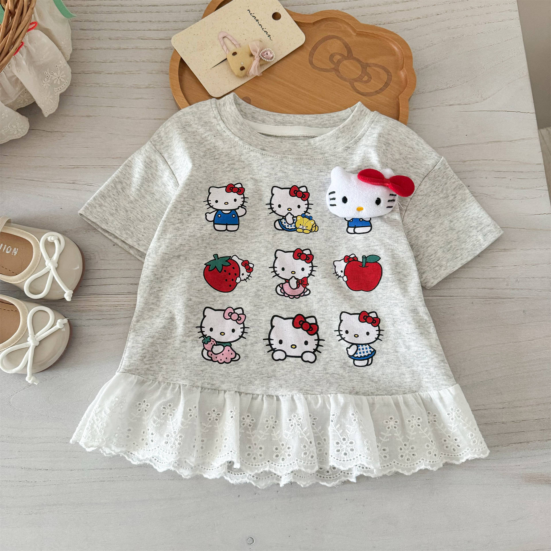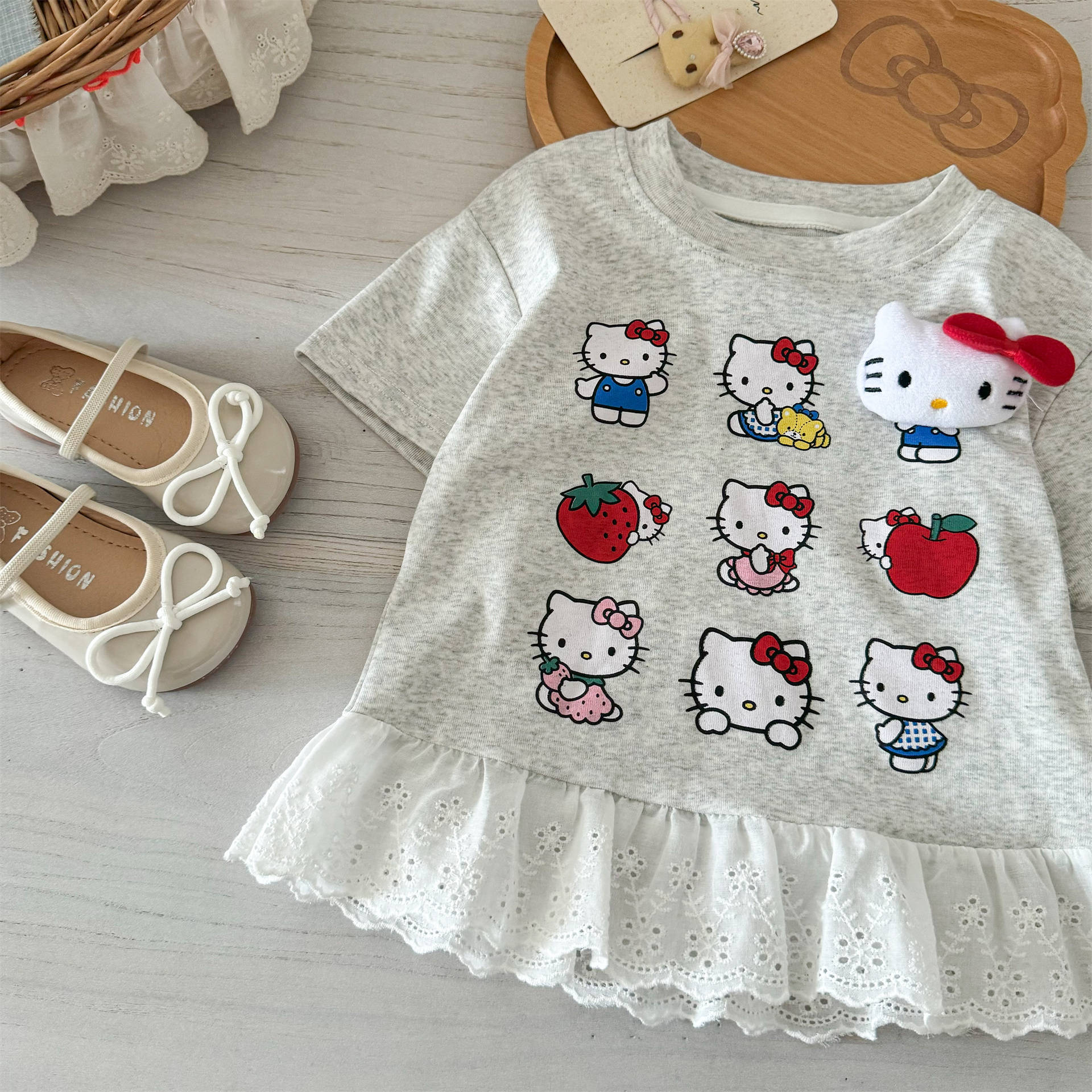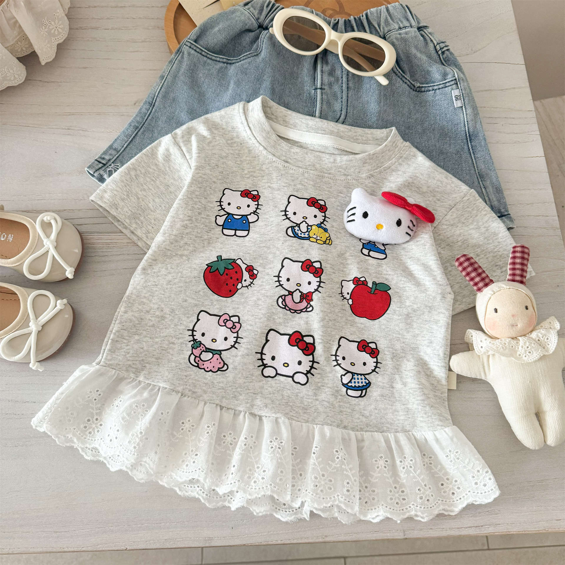 어린이 면 서양식 티셔츠 2025 여름 새로운 레이스 소녀 인쇄 귀여운 최고 달콤한 짧은 소매 티셔츠 트렌디