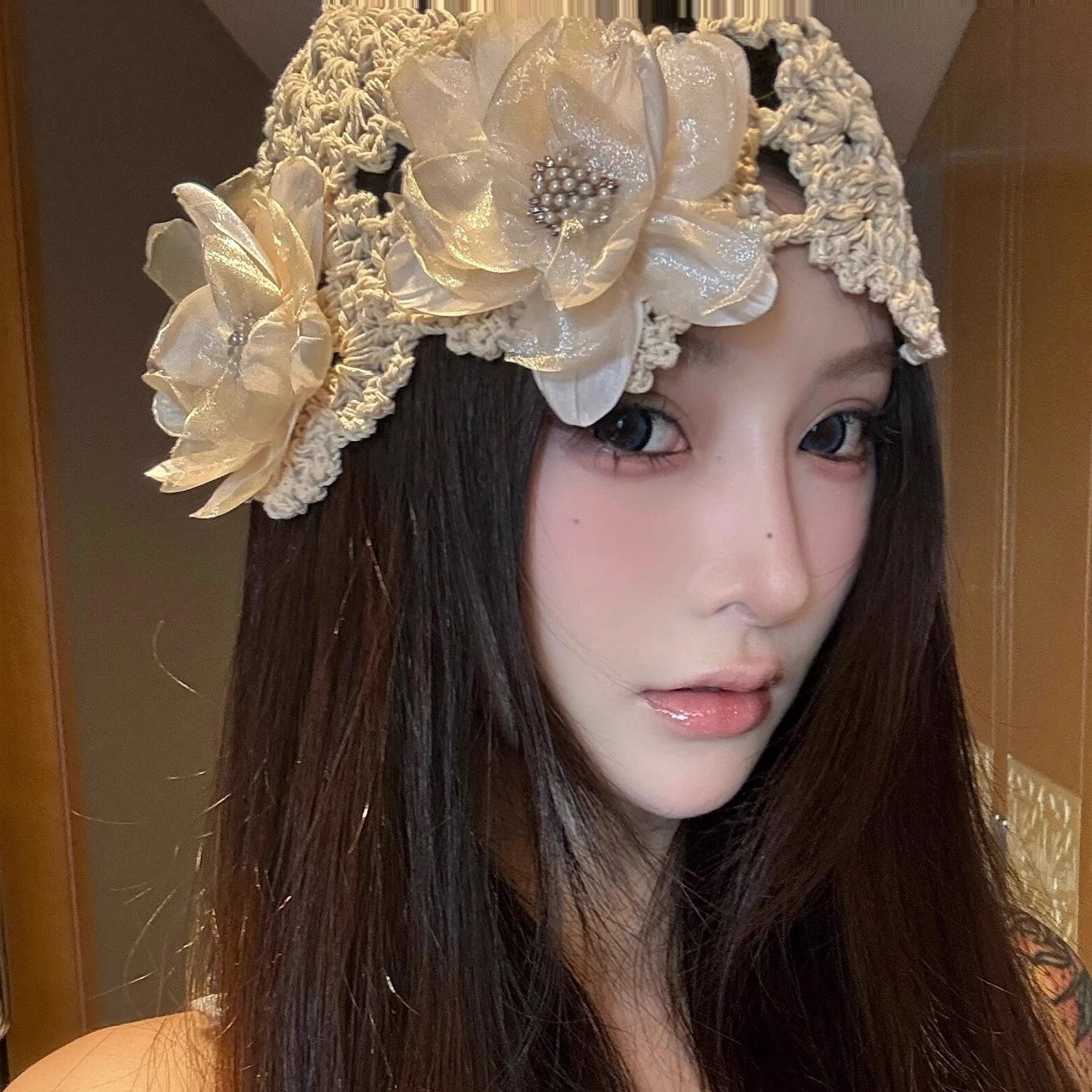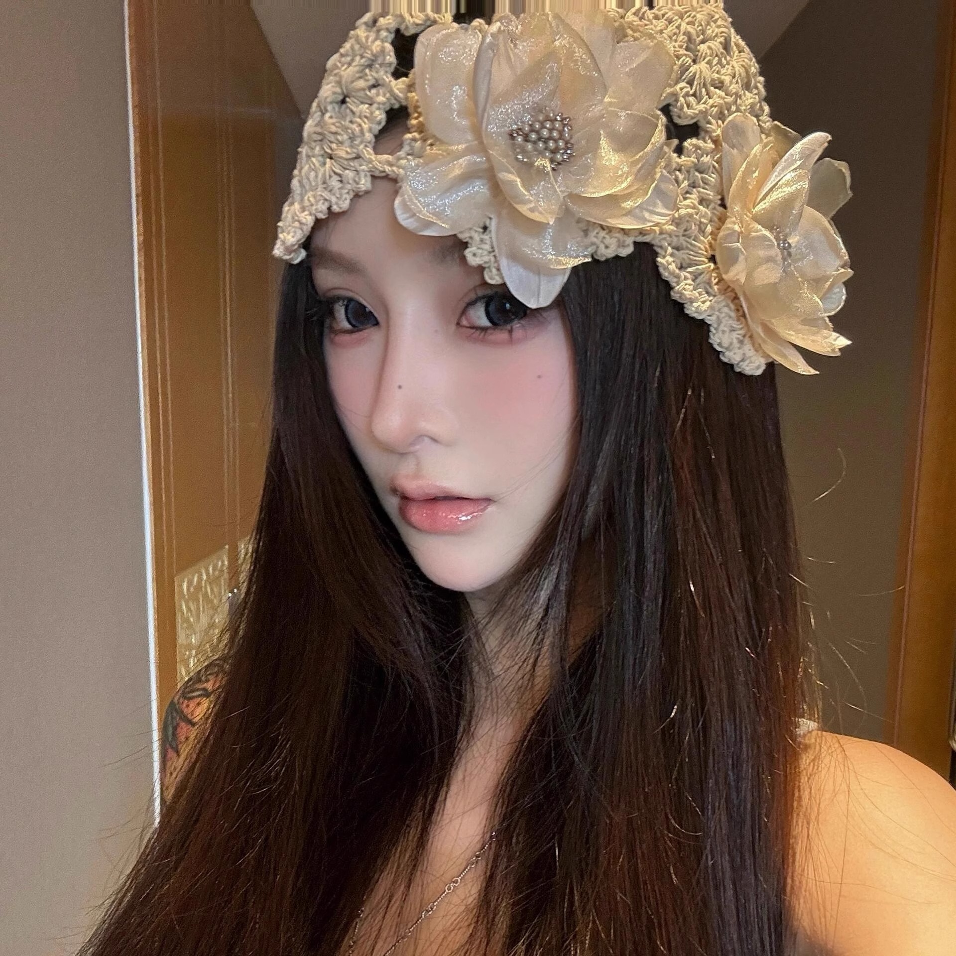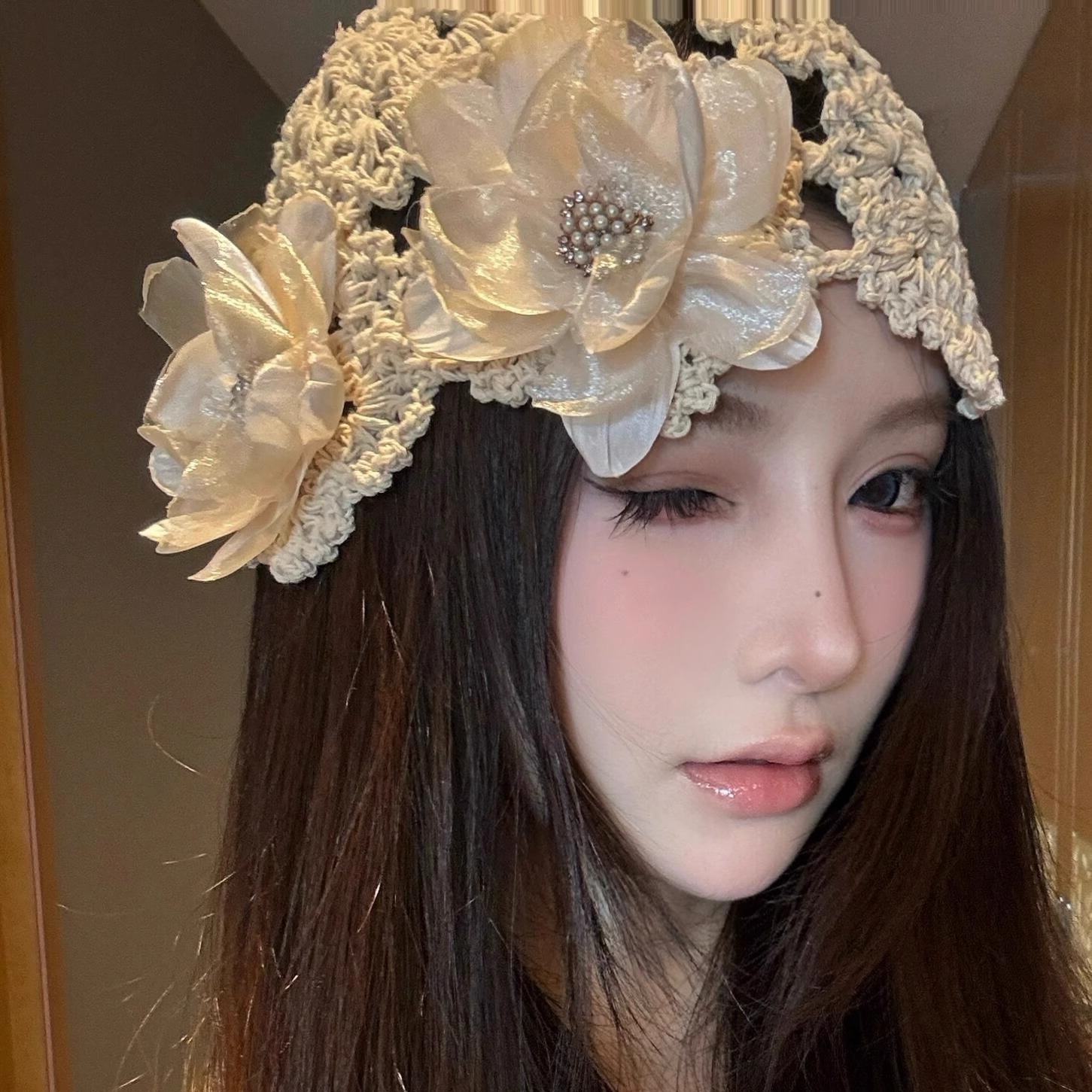 한국식 틈새 빈티지 예술적 진주 꽃 풀오버 캡 여성 수제 니트 할로우 아웃 올매치 크로 셰 모자