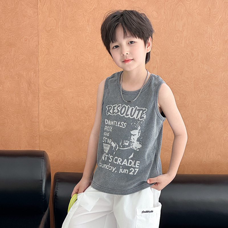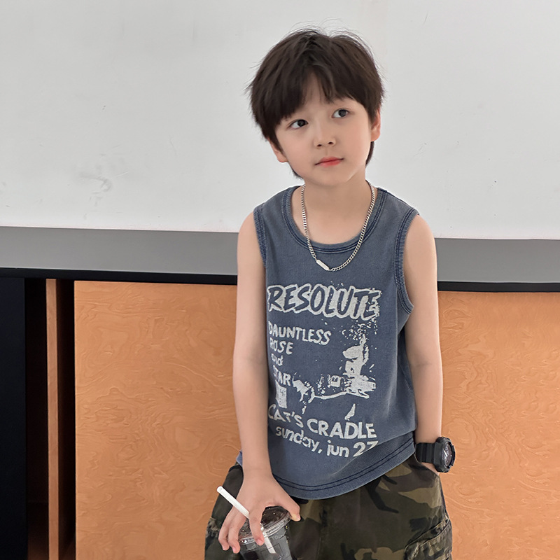 【재고정리 세일】아동용 레트로 레터링 샌드워싱 면조끼 트렌디 2025 여름 남아용 루즈핏 통기성 상의