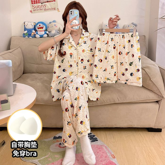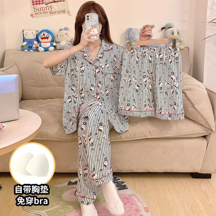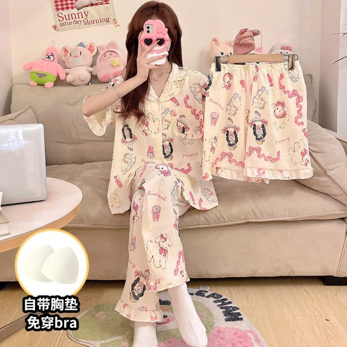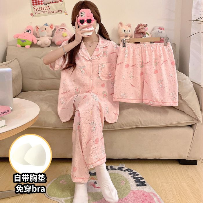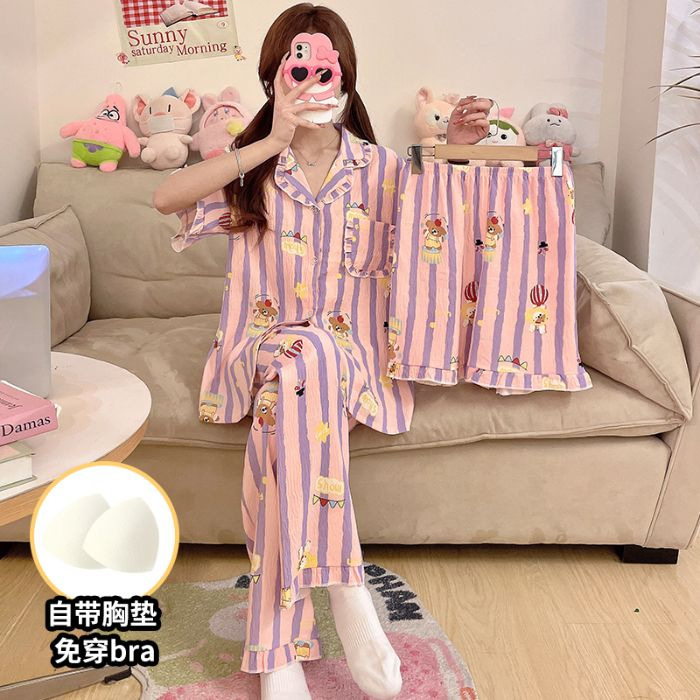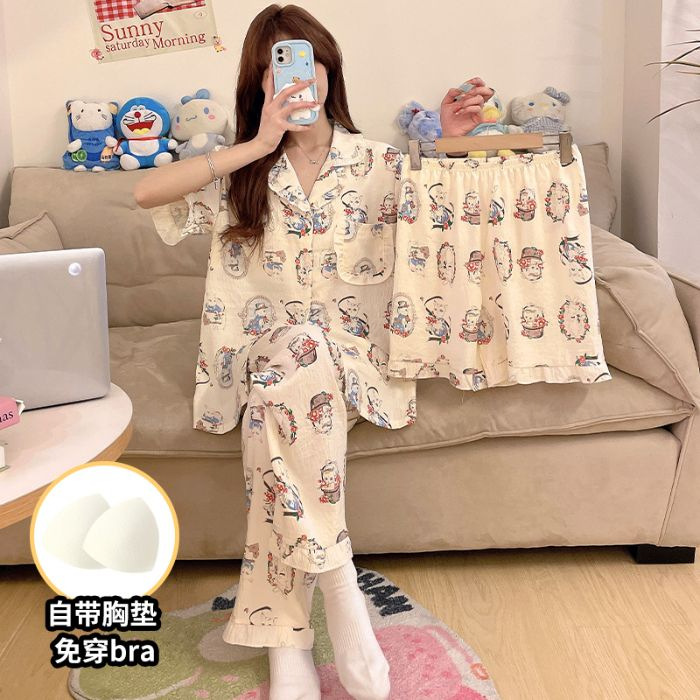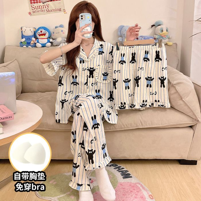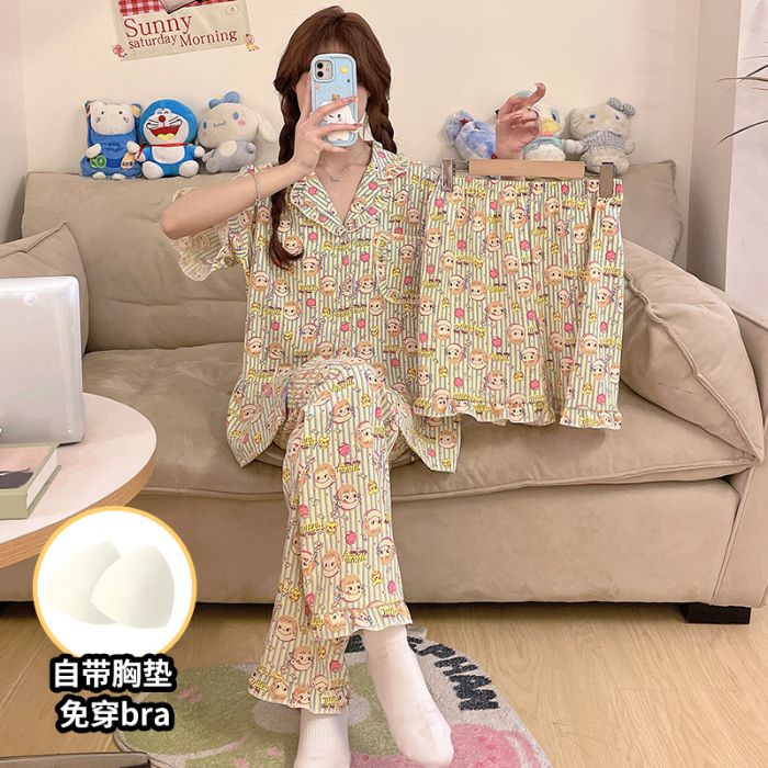 클라우드 코튼 파자마 여성용 봄과 여름 의류 반팔 바지 반바지 3 피스 세트 가슴 패드 잠옷