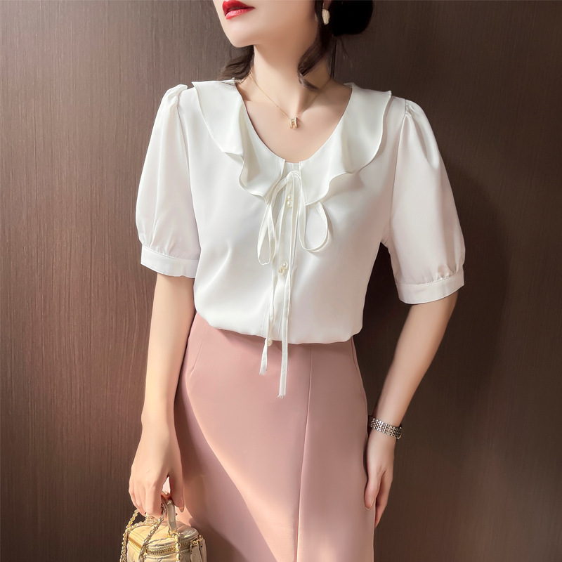 여성을위한 간단한 우아한 퍼프 소매 달콤한 레이스 업 V-넥 디자인 셔츠 2025 여름 세련된 쉬폰 셔츠 탑