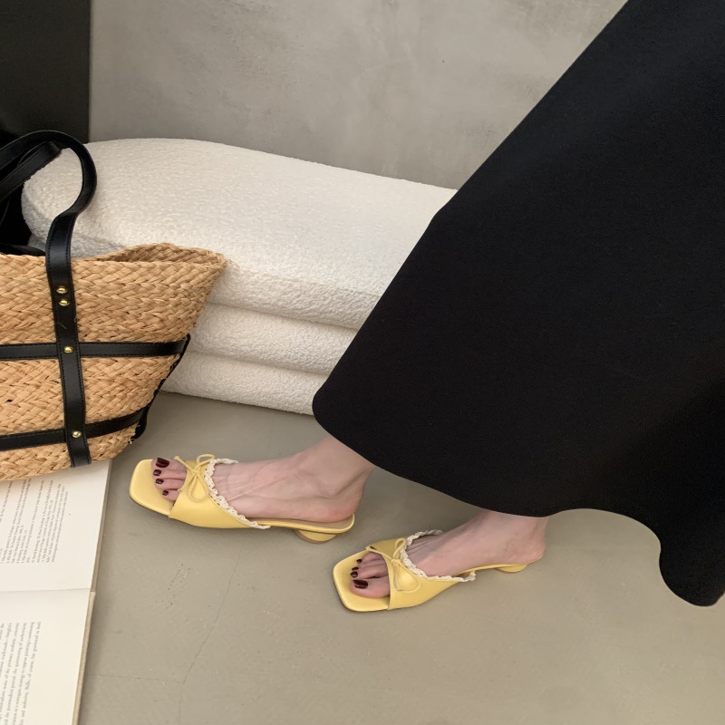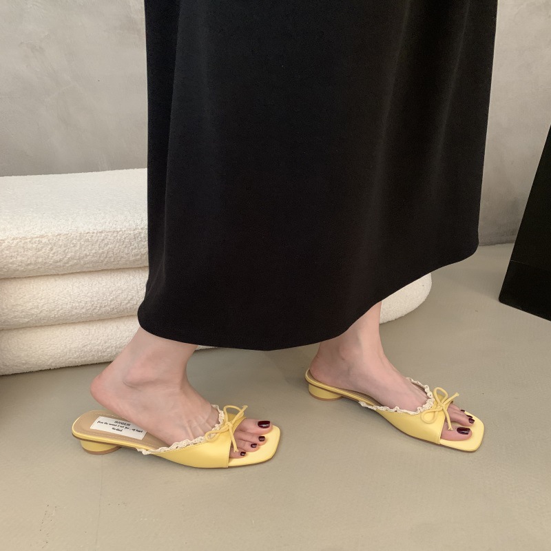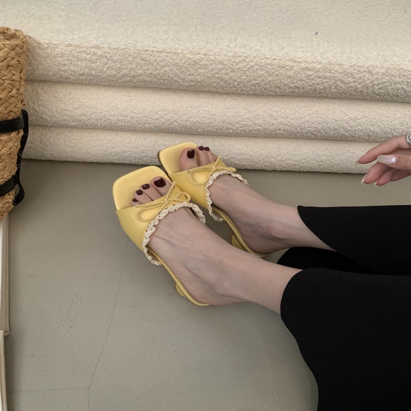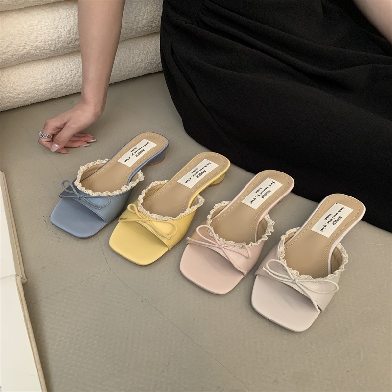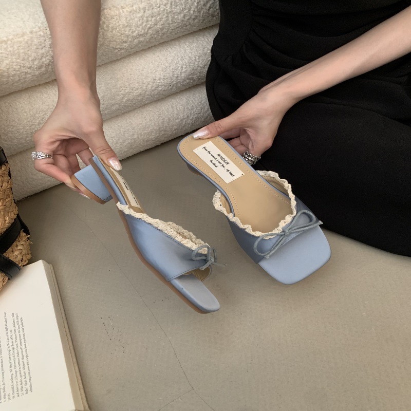 외부 착용 2025 여름 새로운 광장 머리 두꺼운 힐 달콤한 슬라이드 슬라이드 슬리퍼 여성을위한 부드러운 레이스 요정 활 샌들