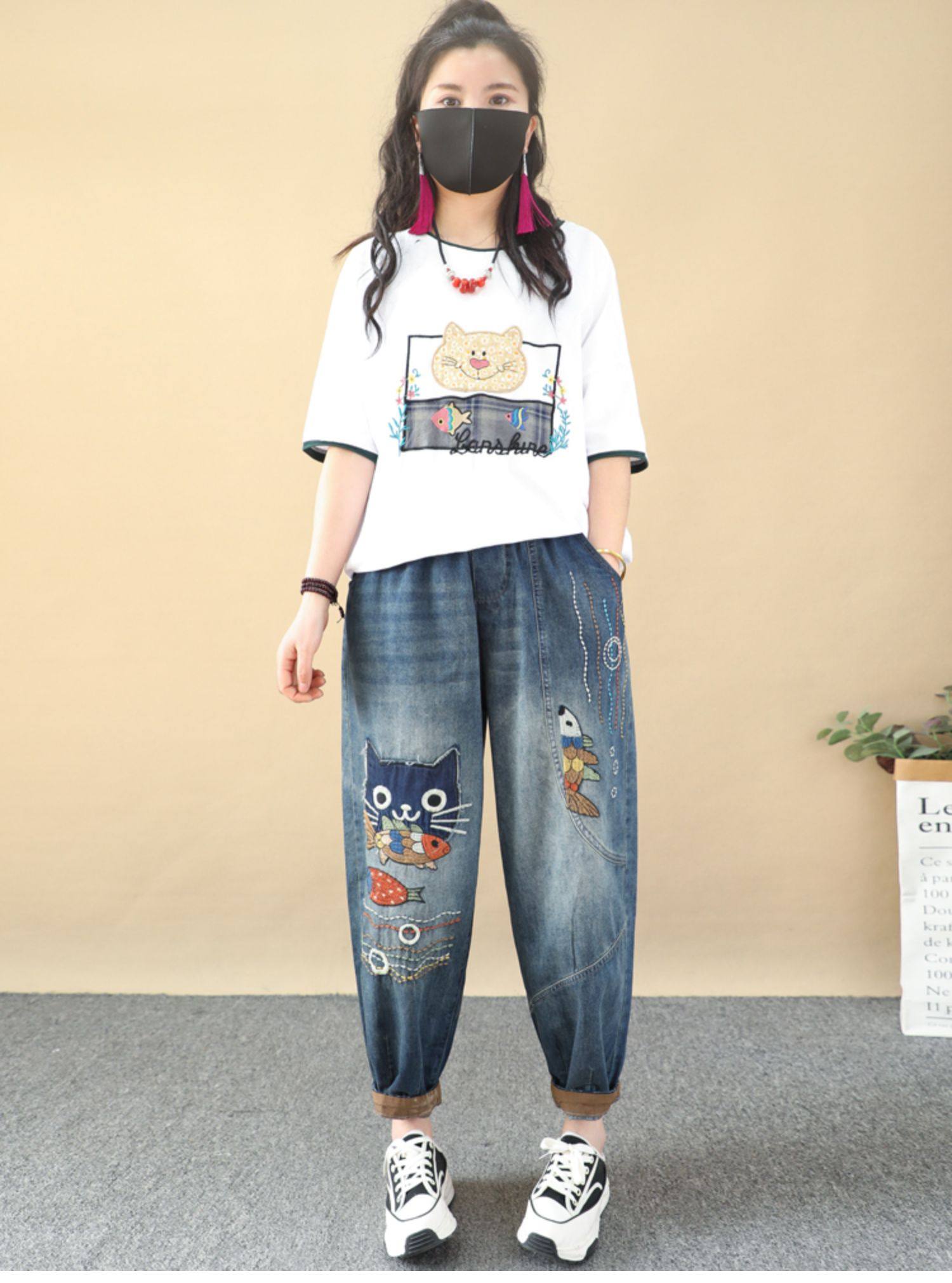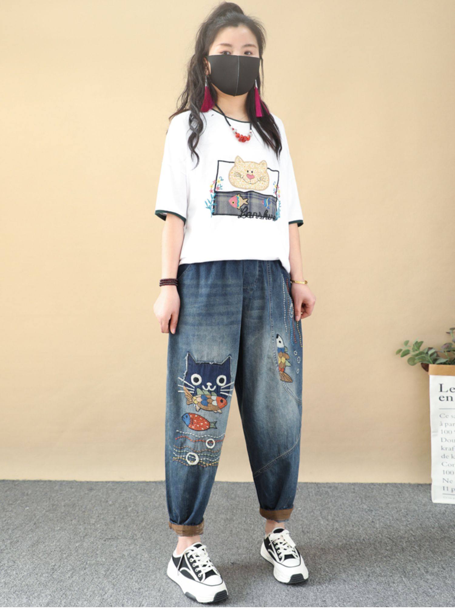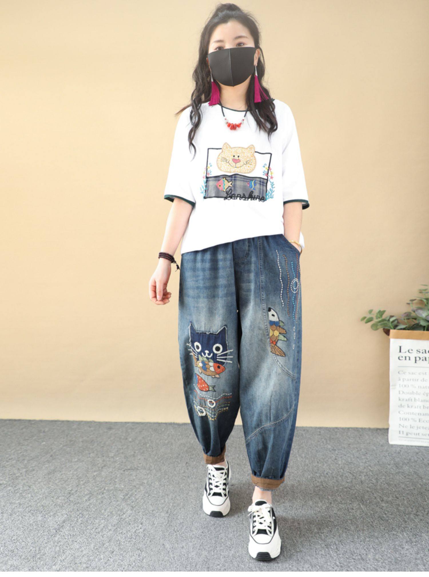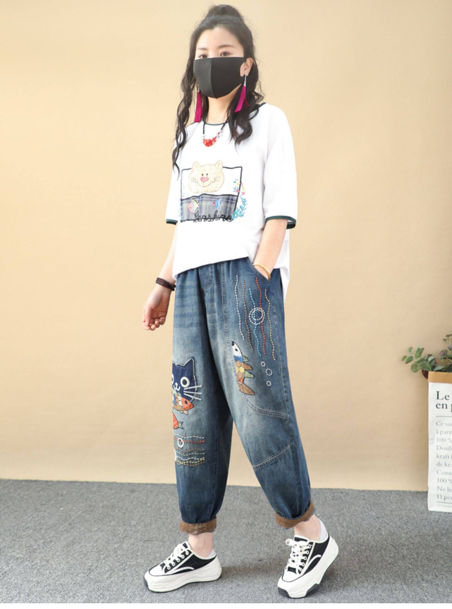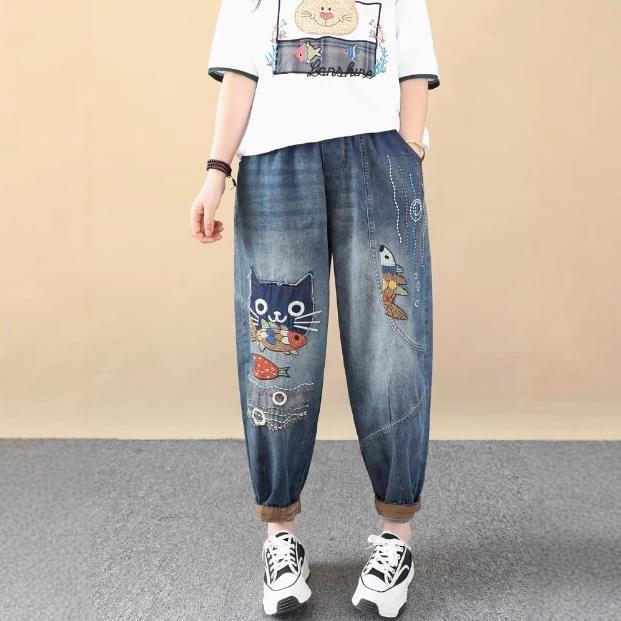 빈티지 만화 올빼미 패드 자수 청바지 여성용 루즈 플러스 사이즈 슬림핏 자른 아빠 하렘 바지스토어 가기