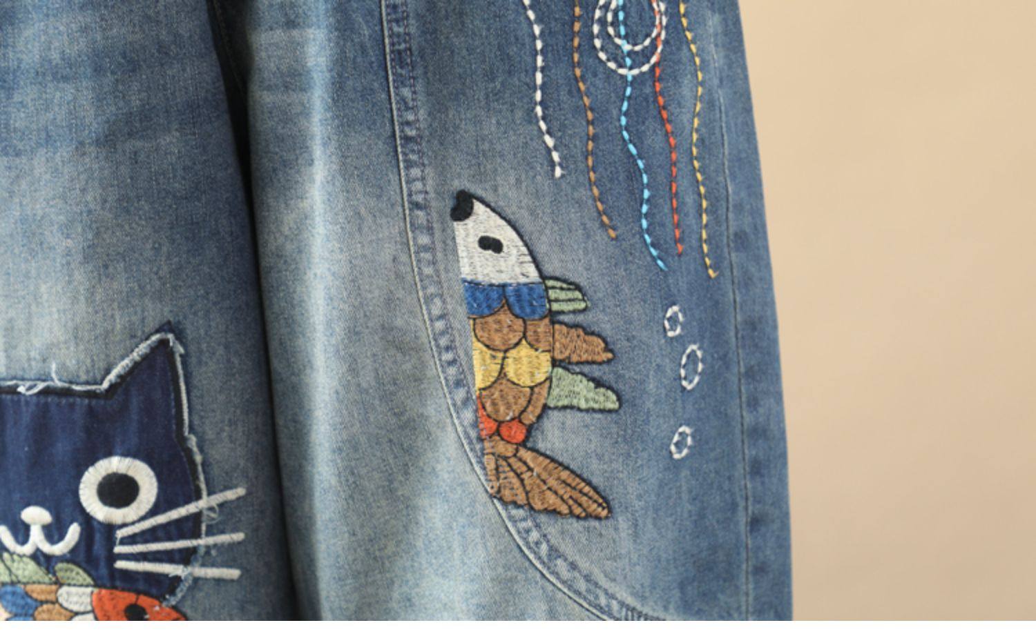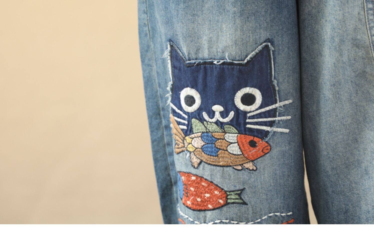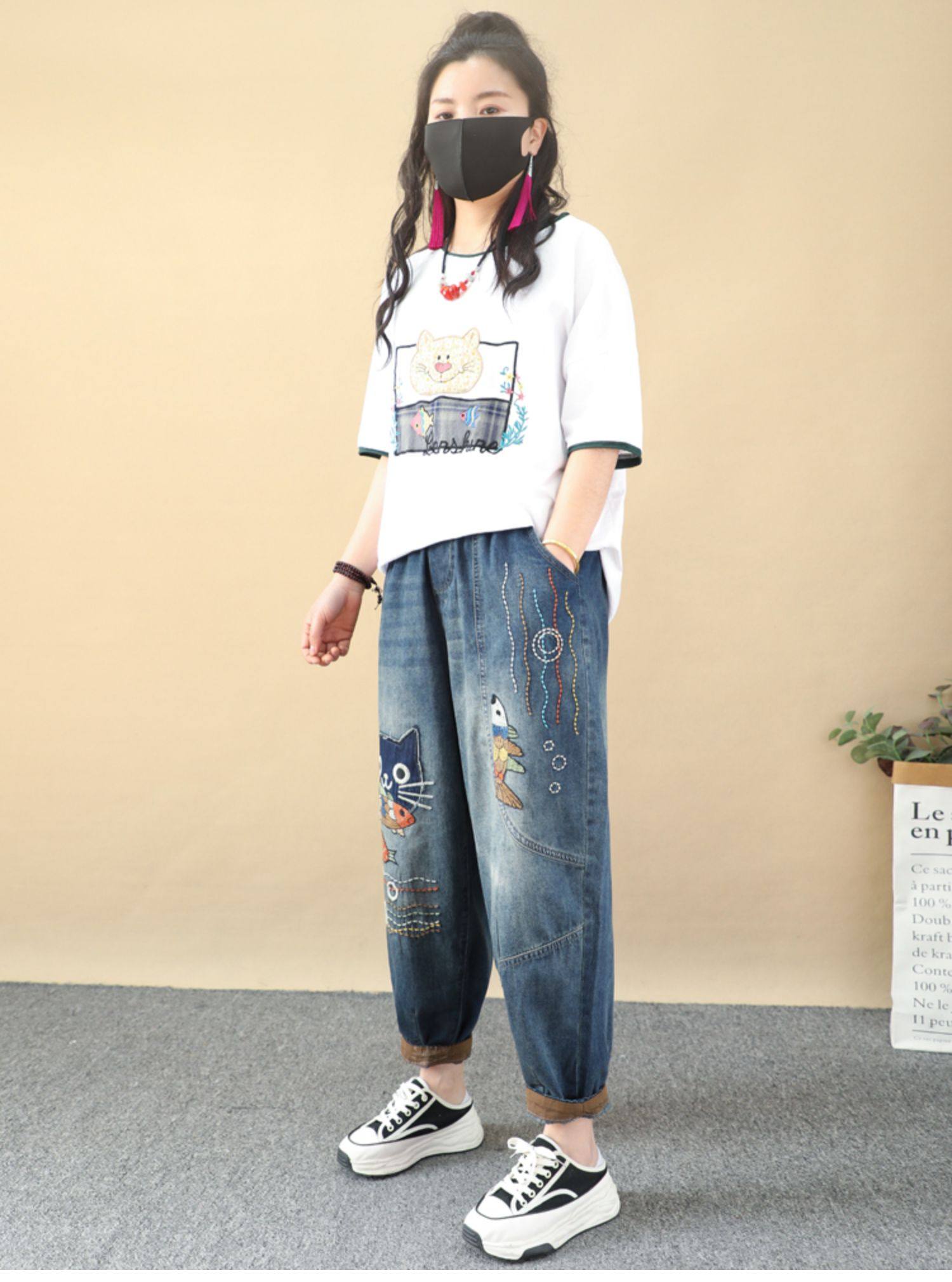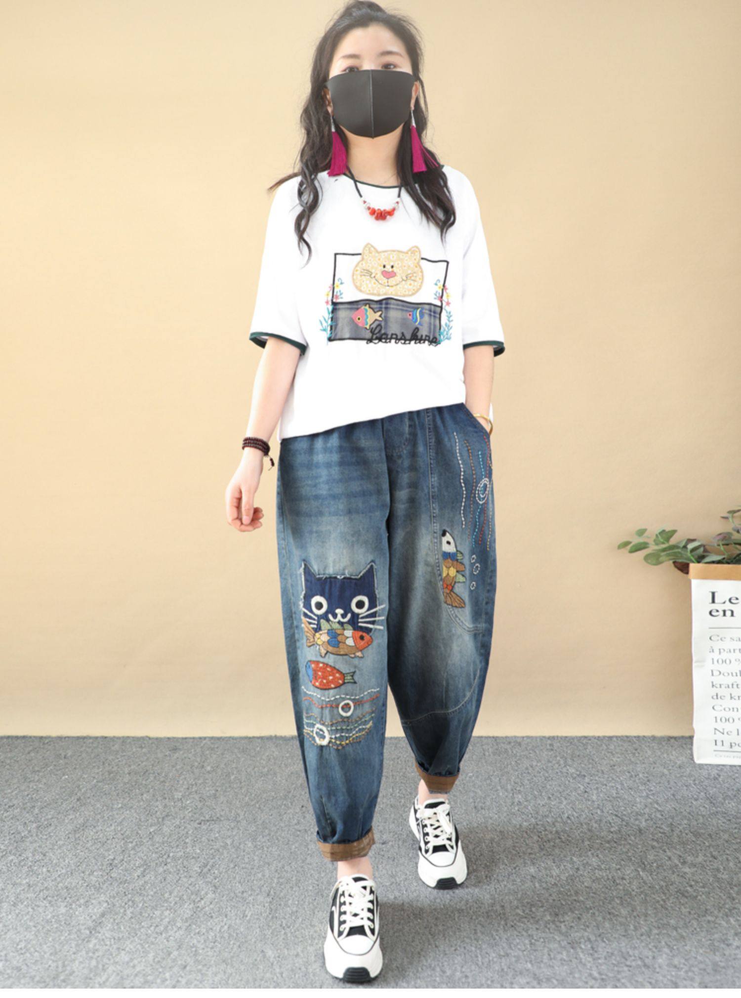빈티지 만화 올빼미 패드 자수 청바지 여성용 루즈 플러스 사이즈 슬림핏 자른 아빠 하렘 바지스토어 가기