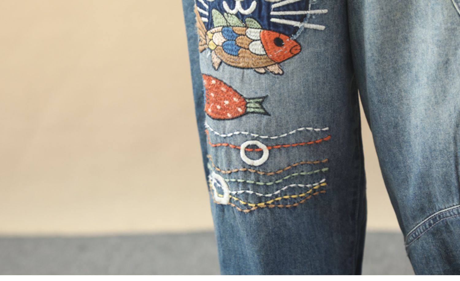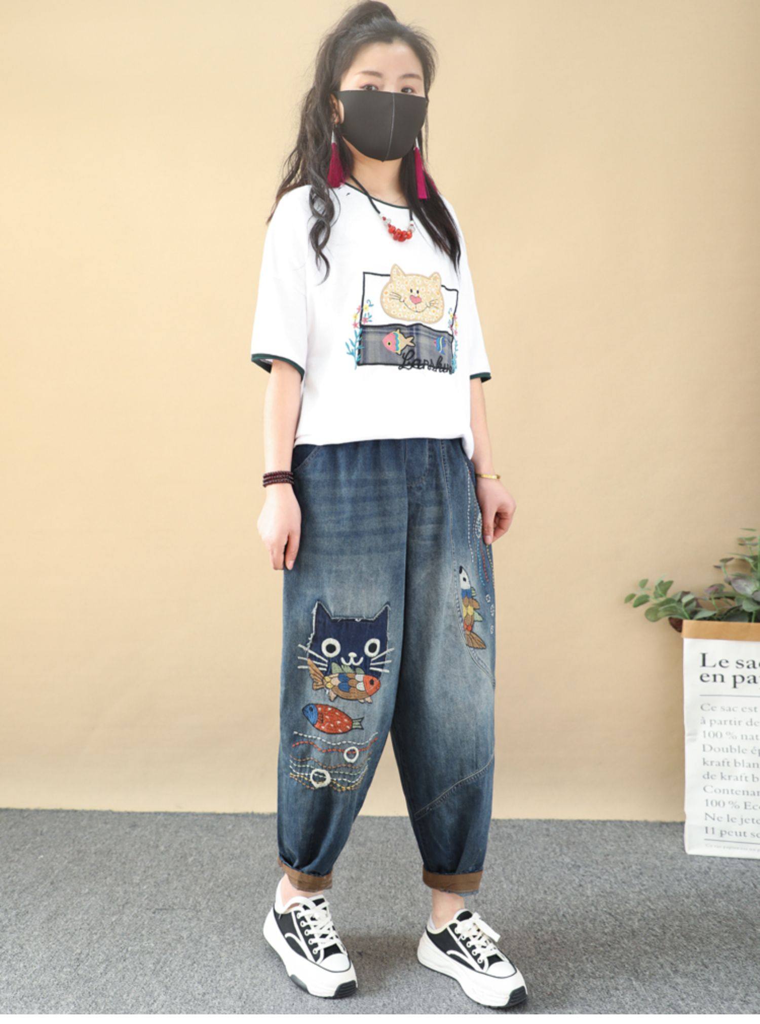 빈티지 만화 올빼미 패드 자수 청바지 여성용 루즈 플러스 사이즈 슬림핏 자른 아빠 하렘 바지