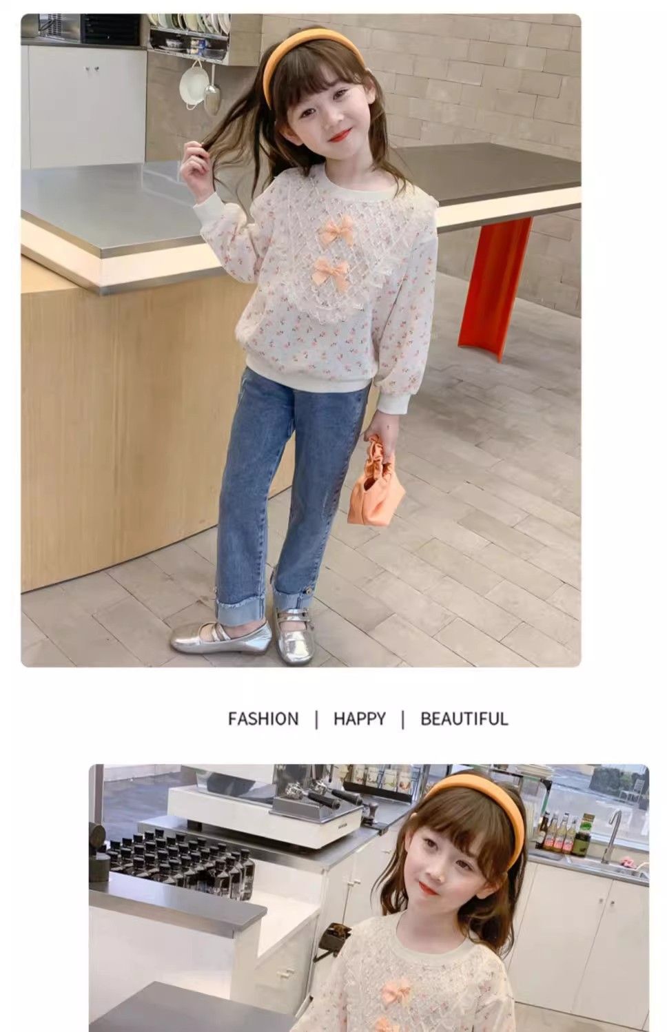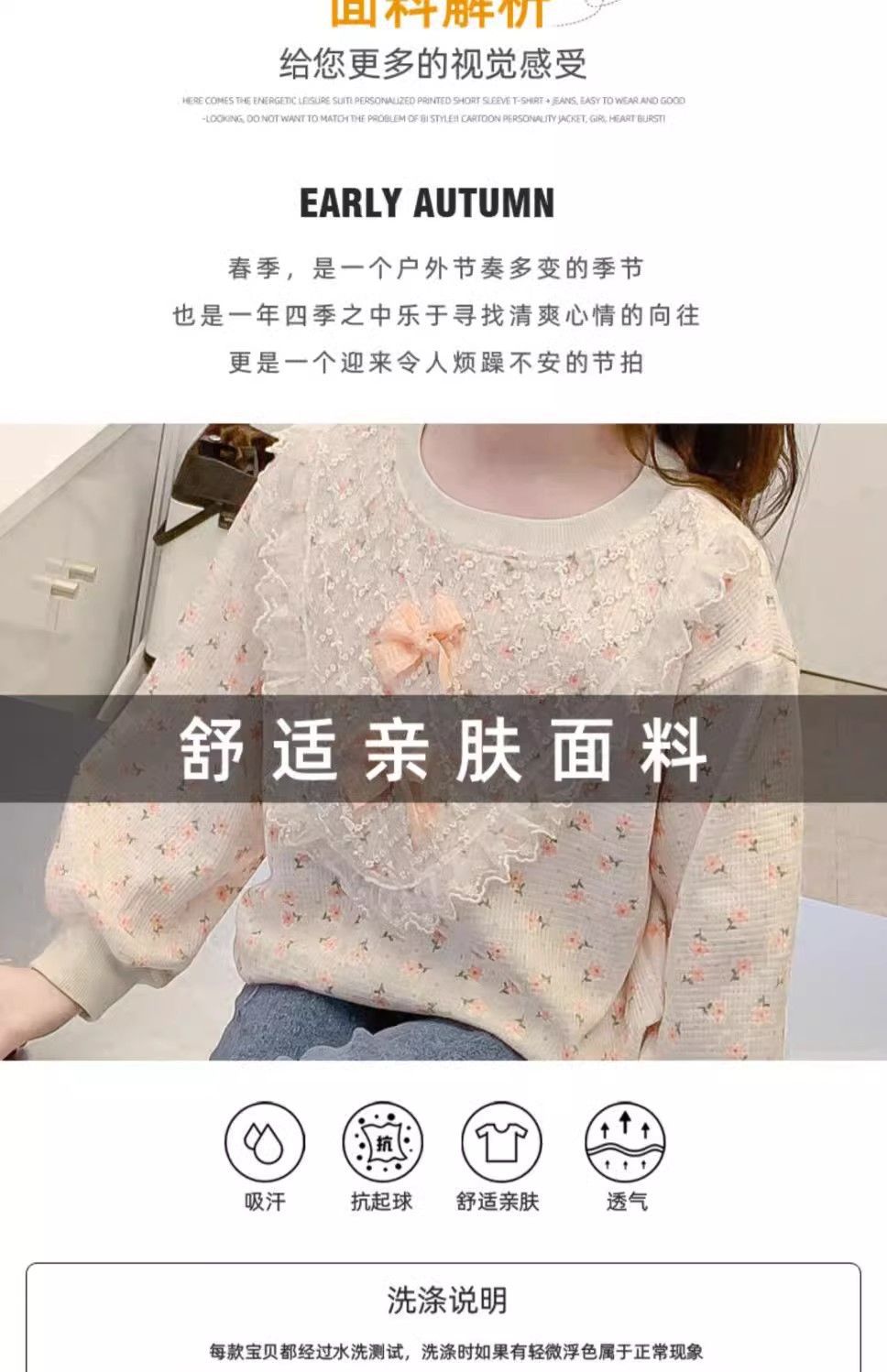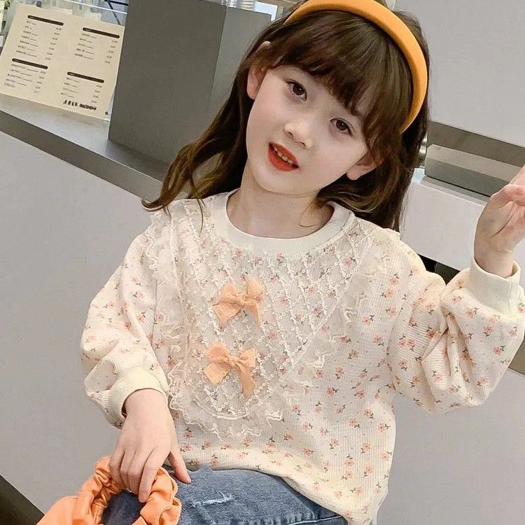 여아 스웨트 셔츠 새로운 스타일 여아 봄, 가을 긴팔 꽃무늬 리본 레이스 중대형 아동용 귀여운 상의