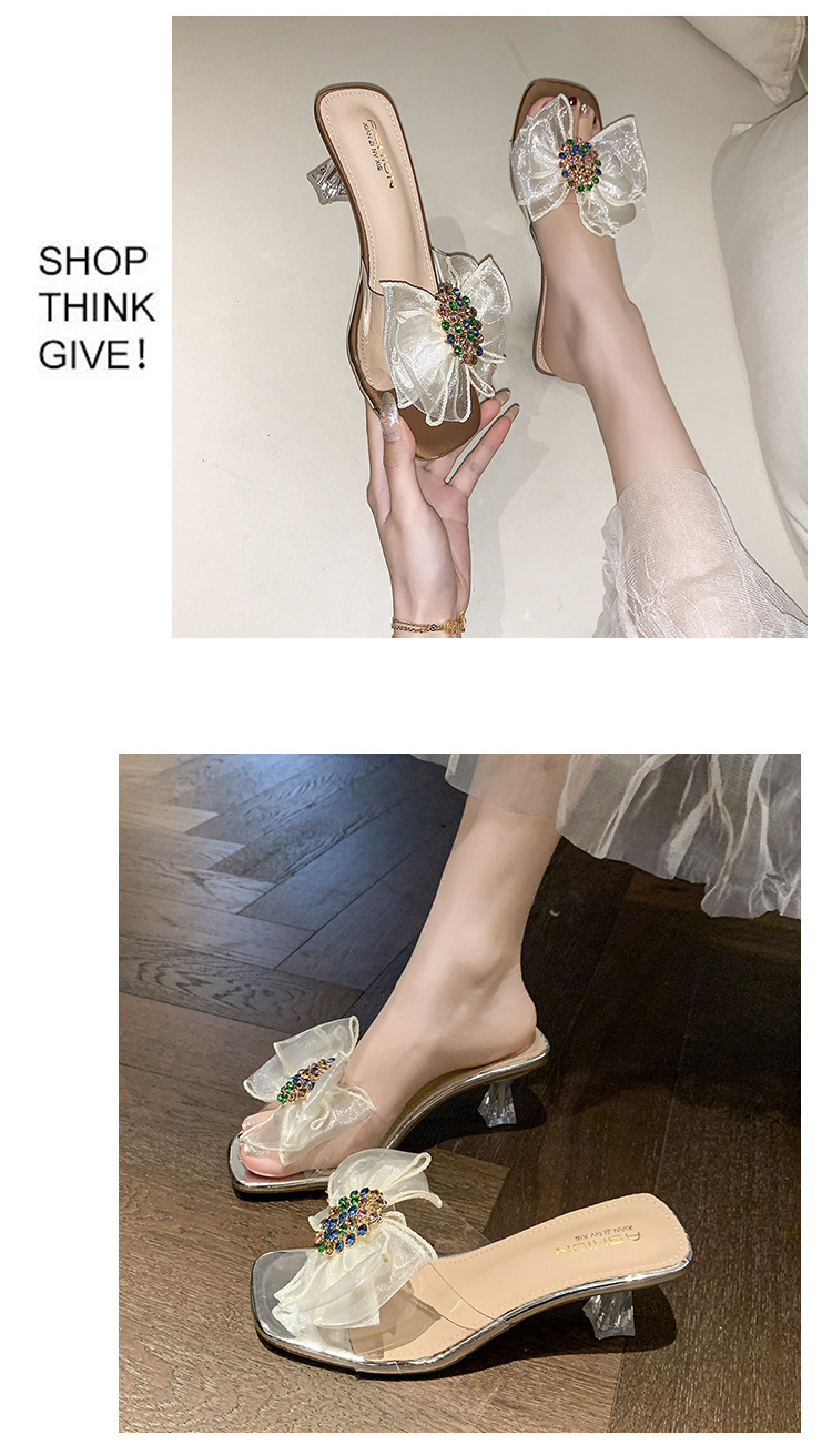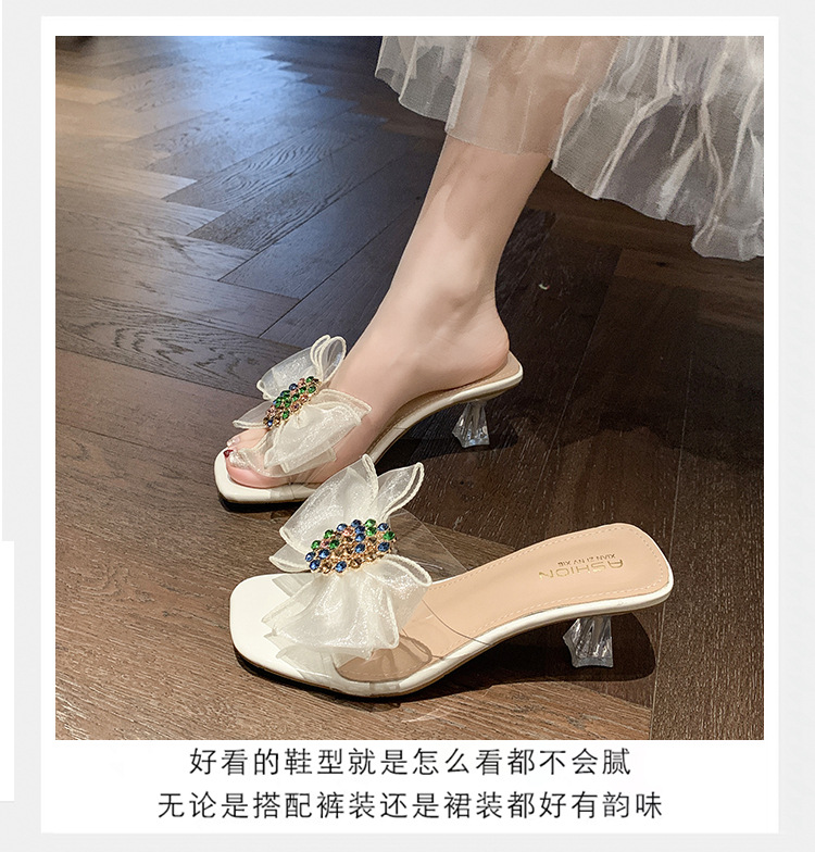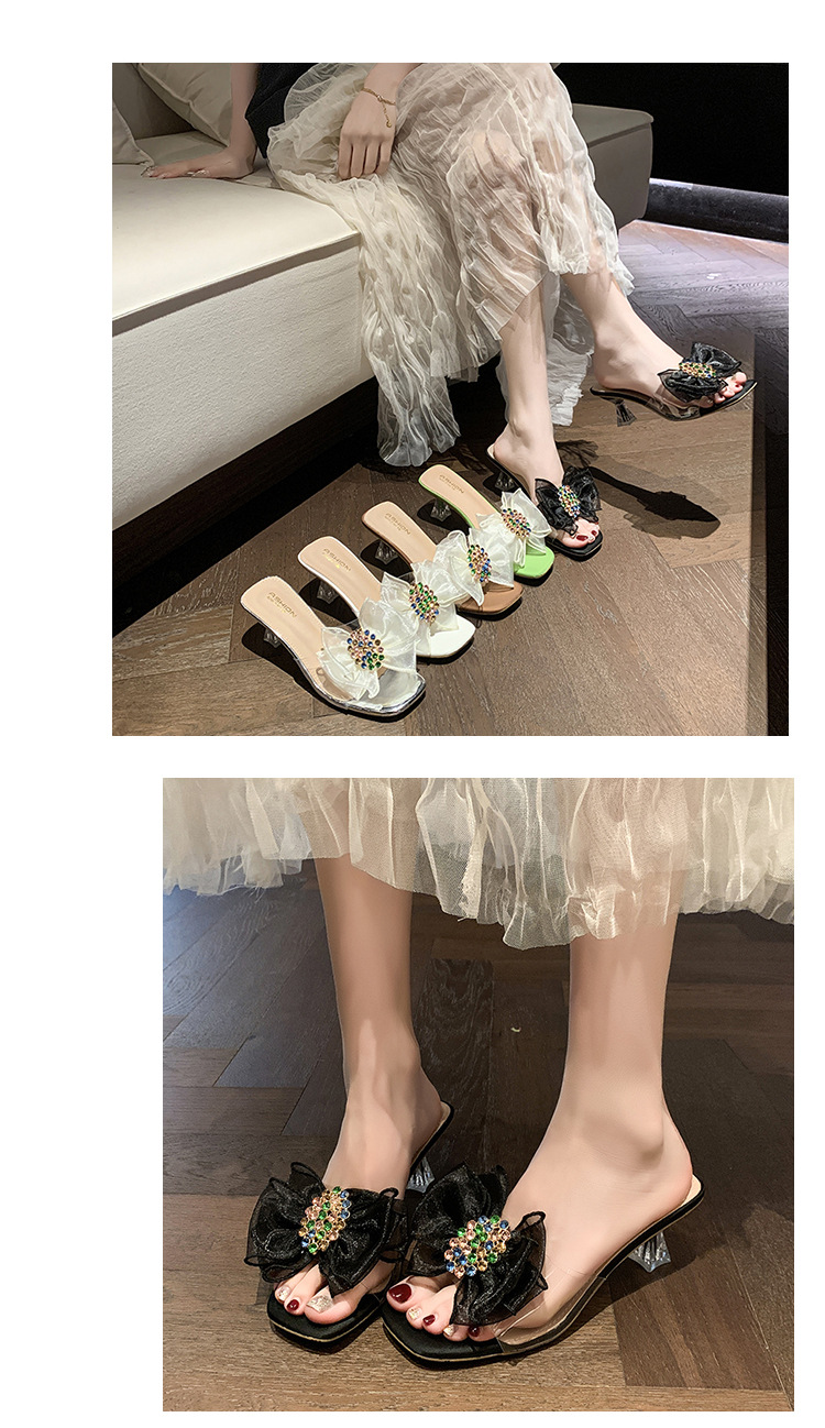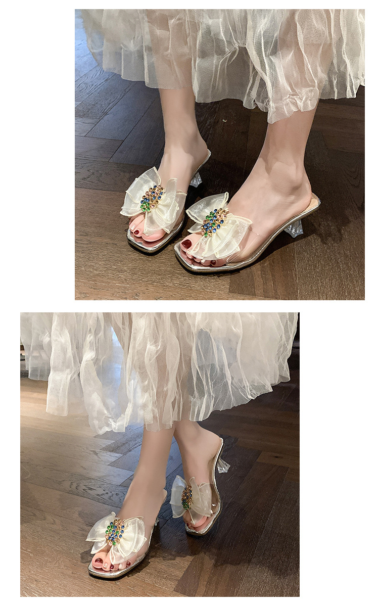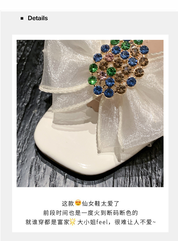 여성용 리본캣힐 샌들, 여름 아우터, 오픈토 스퀘어토, 프렌치페어리 슬리퍼, 라지사이즈 라인스톤 하이힐