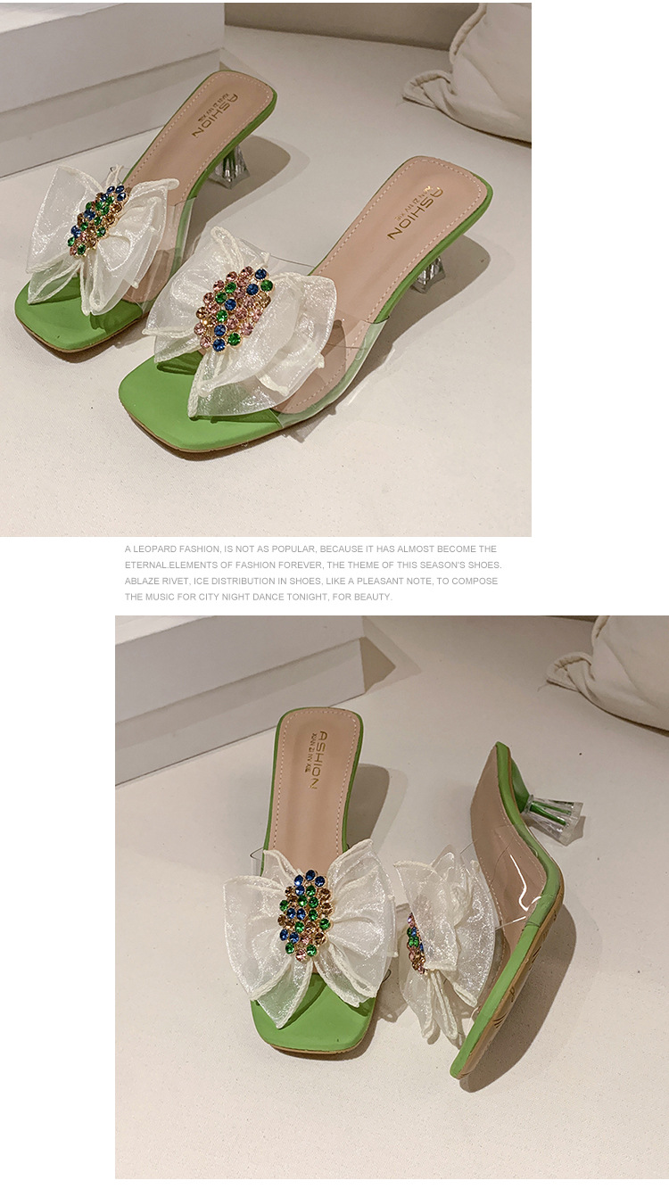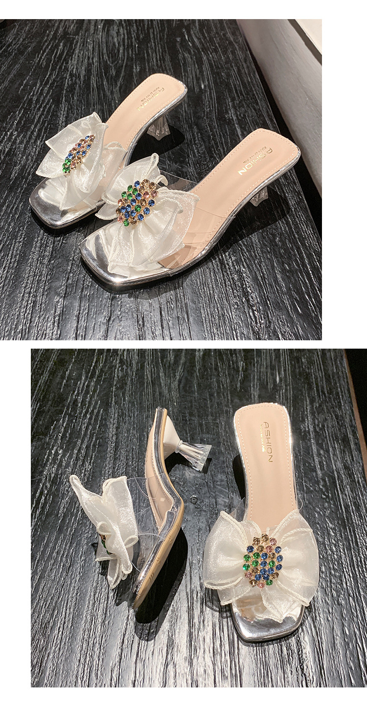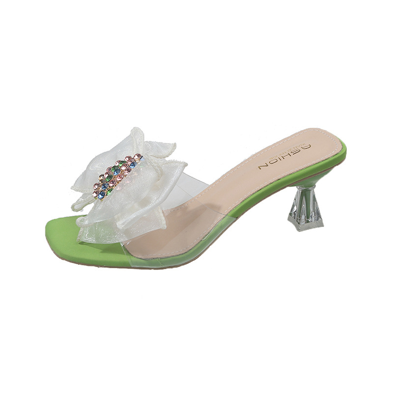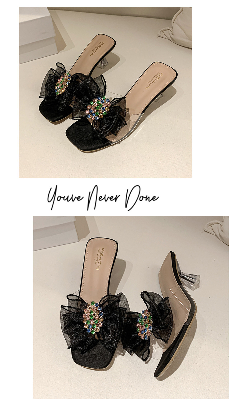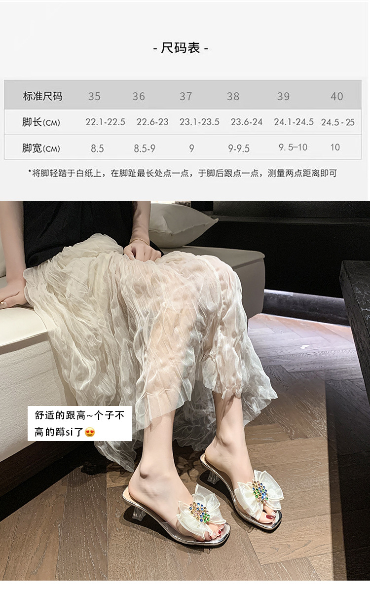 여성용 리본캣힐 샌들, 여름 아우터, 오픈토 스퀘어토, 프렌치페어리 슬리퍼, 라지사이즈 라인스톤 하이힐
