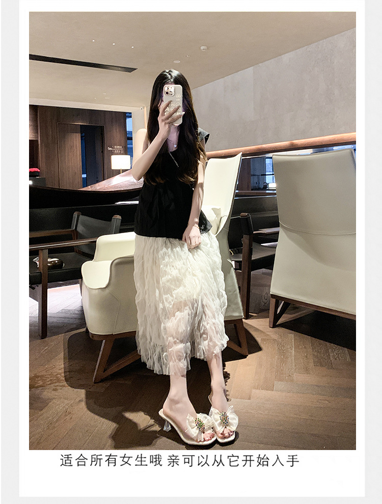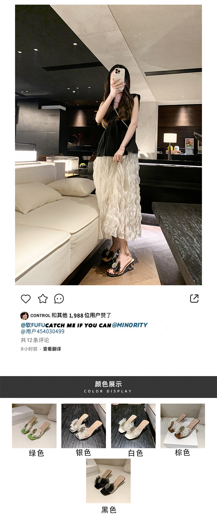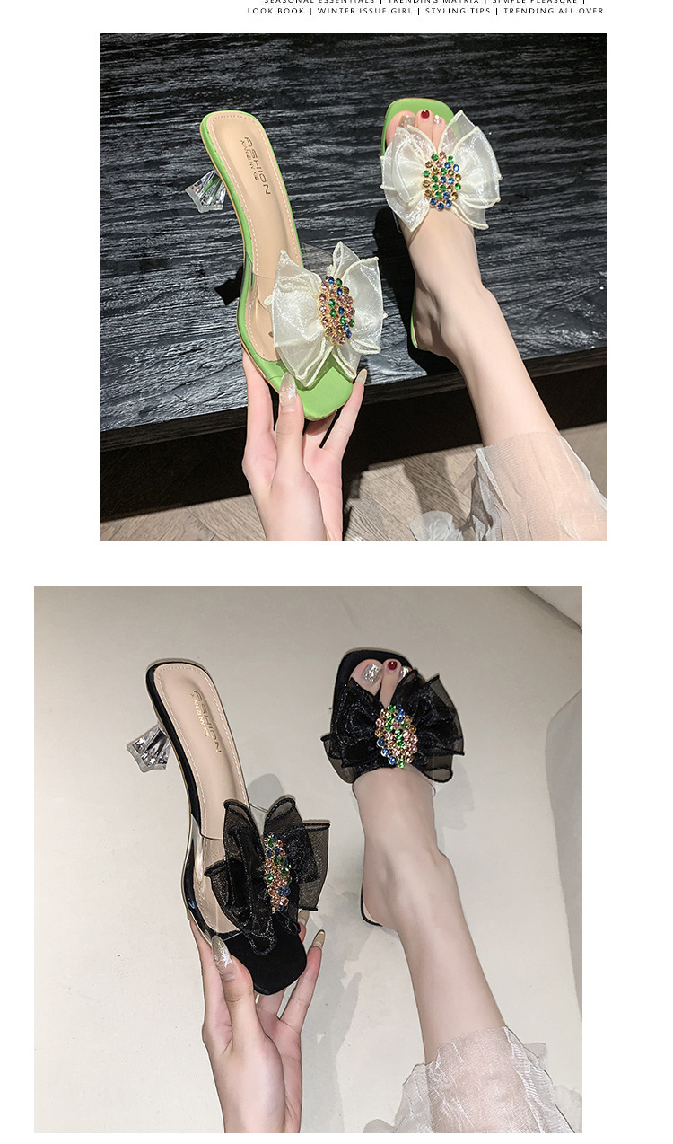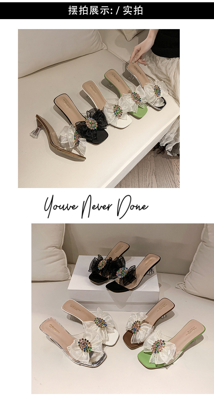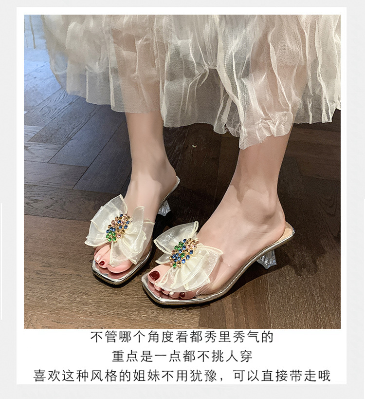 여성용 리본캣힐 샌들, 여름 아우터, 오픈토 스퀘어토, 프렌치페어리 슬리퍼, 라지사이즈 라인스톤 하이힐