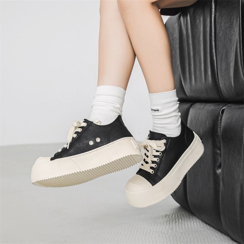 검은 두꺼운 밑창 높이 증가 캐주얼 보드 신발 2025 봄 큰 머리 아이 같은 가죽 신발 연인 보드 신발 디자인 감각스토어 가기