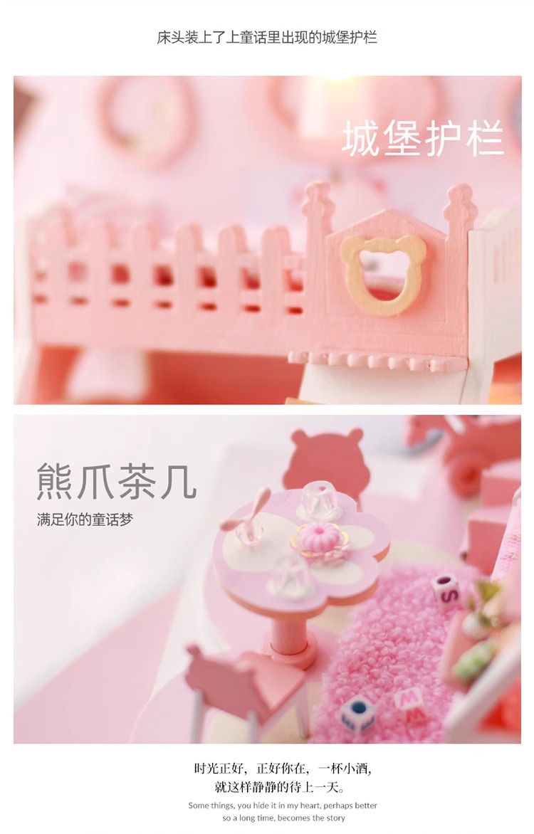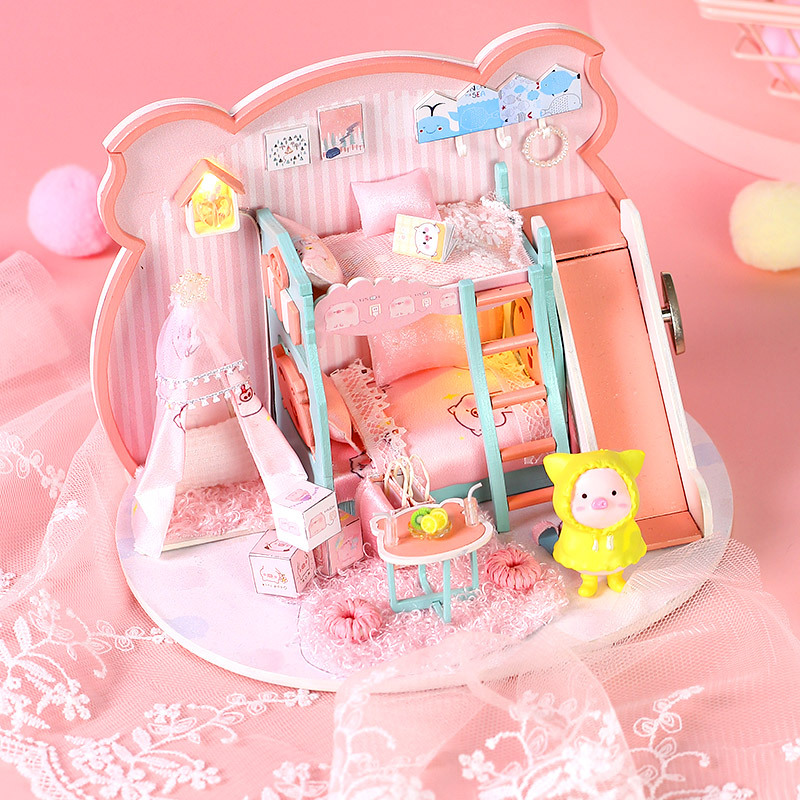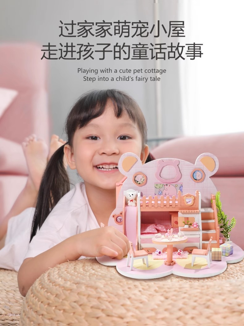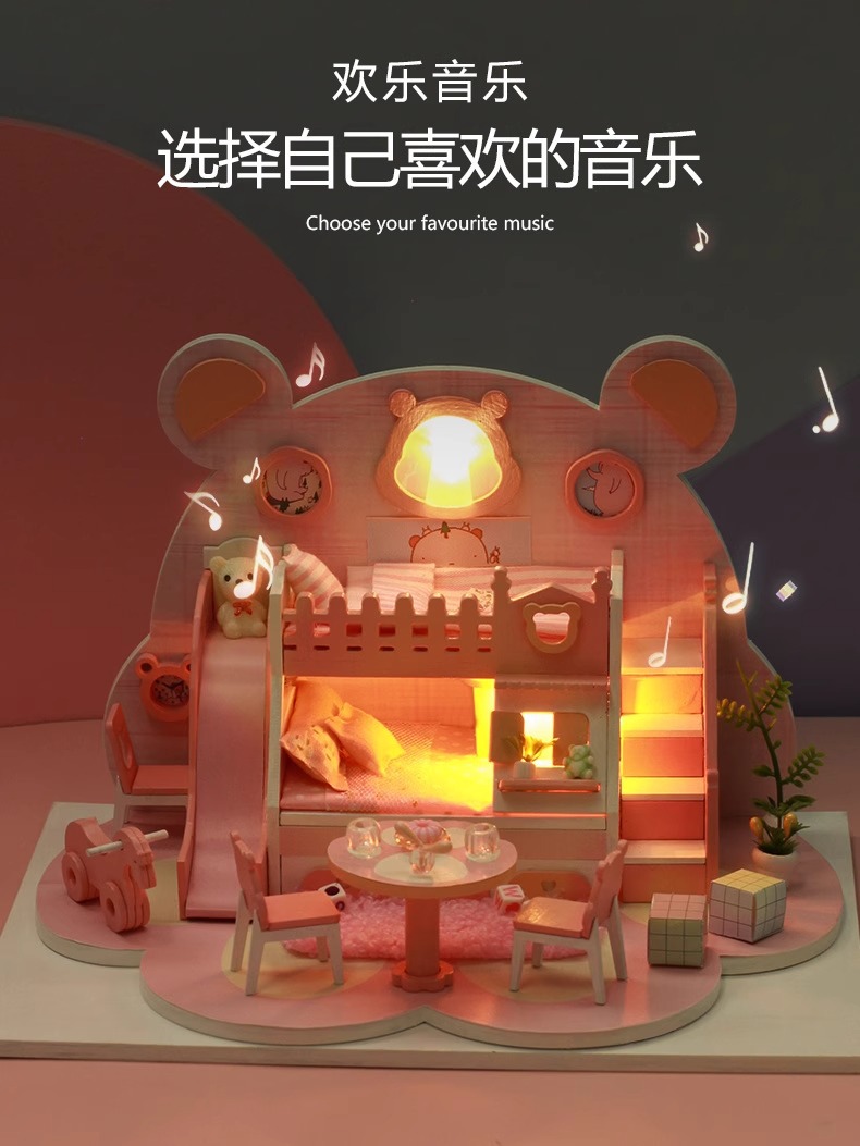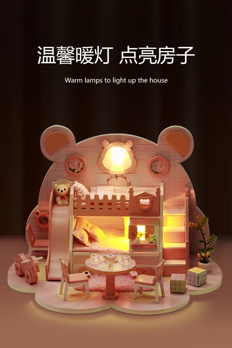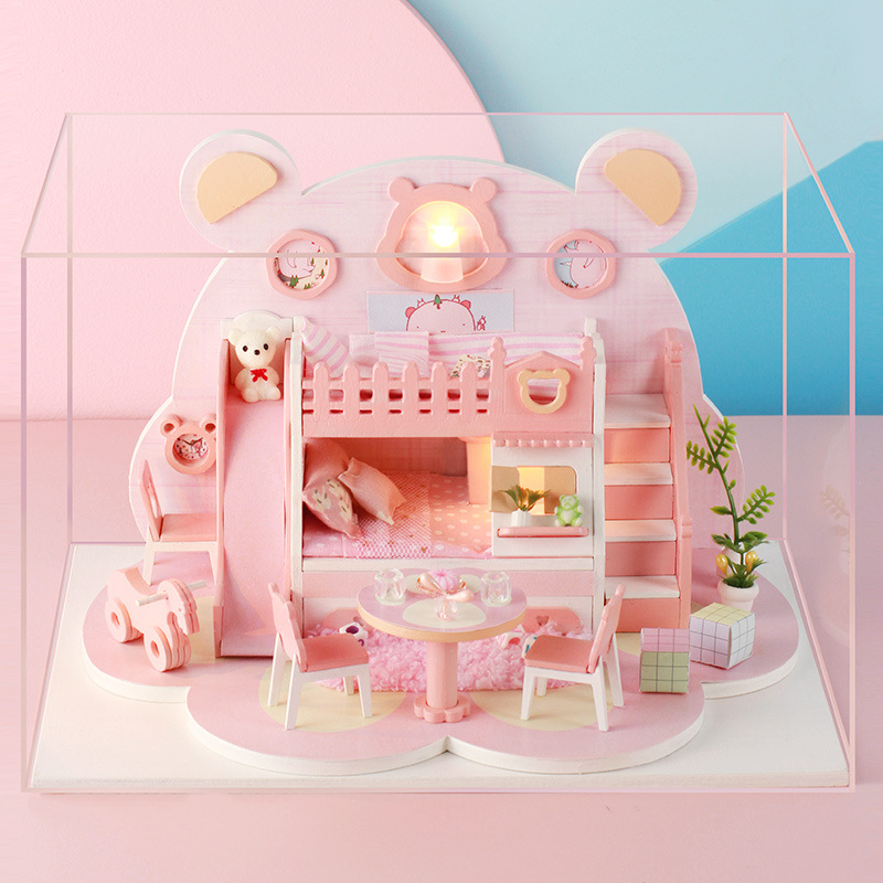 Zhiwo Cottage 어린이 수제 간단한 조립 Bear Dream Factory 소녀를위한 침대가있는 미니 하우스 모델