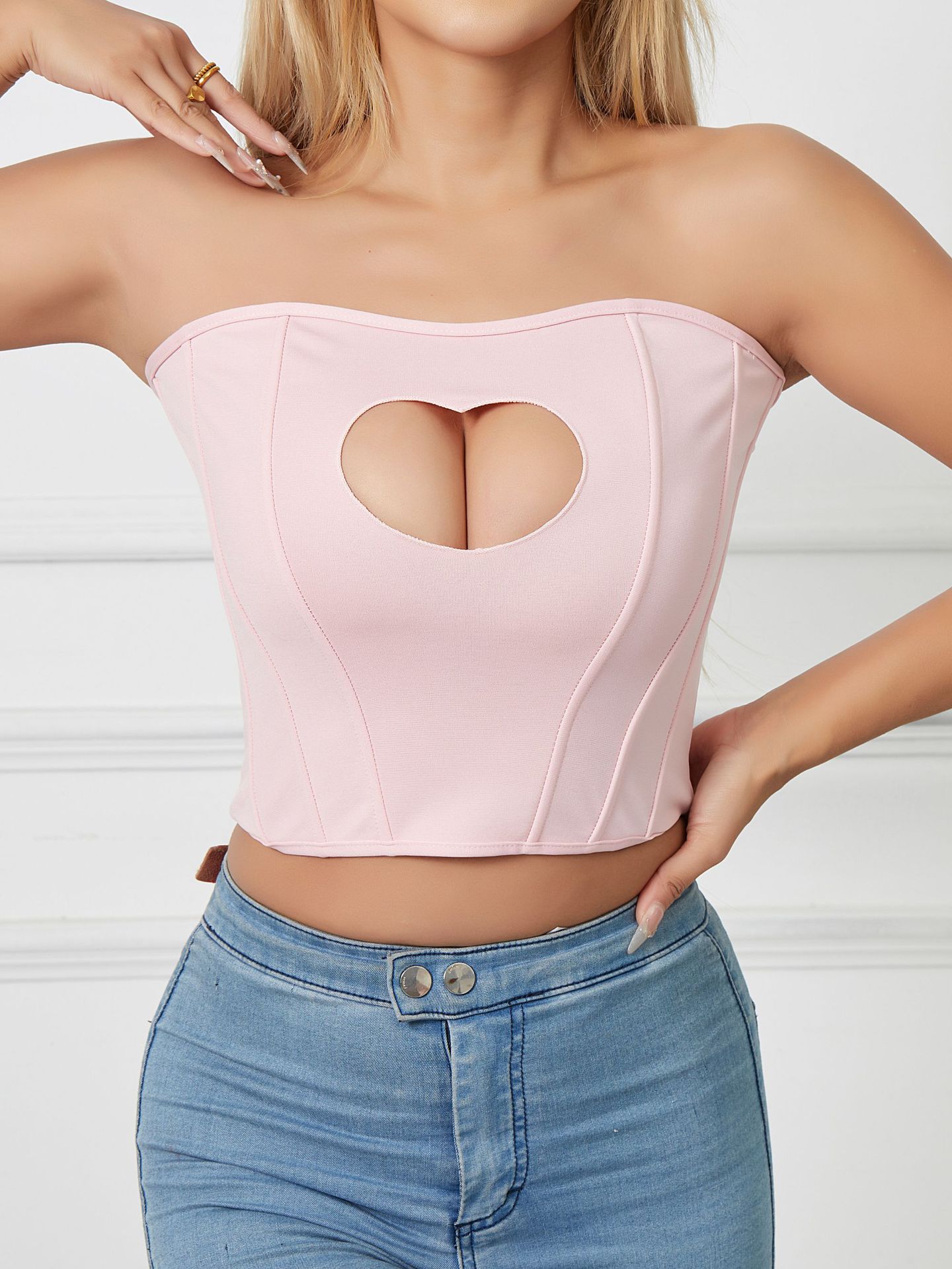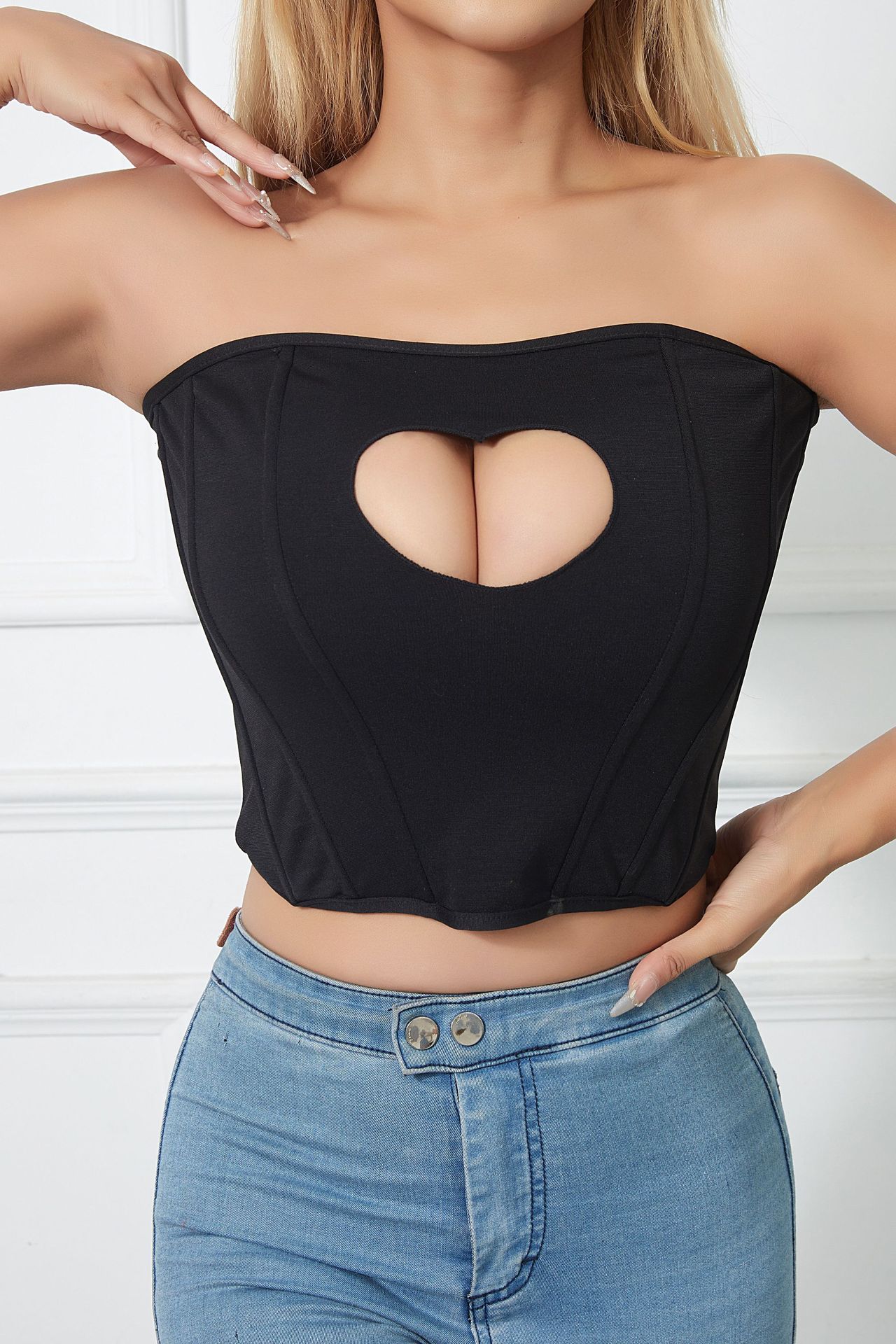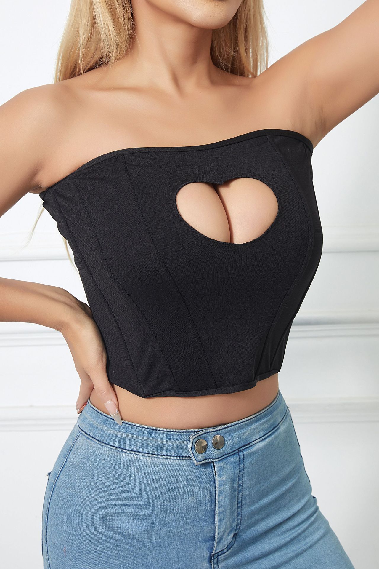 유럽과 미국의 국경을 넘나드는 섹시한 오프숄더 피쉬본 가슴 감싸는 달콤하고 매콤한 디자인 하트 모양의 속이 빈 허리 타이트한 튜브탑스토어 가기