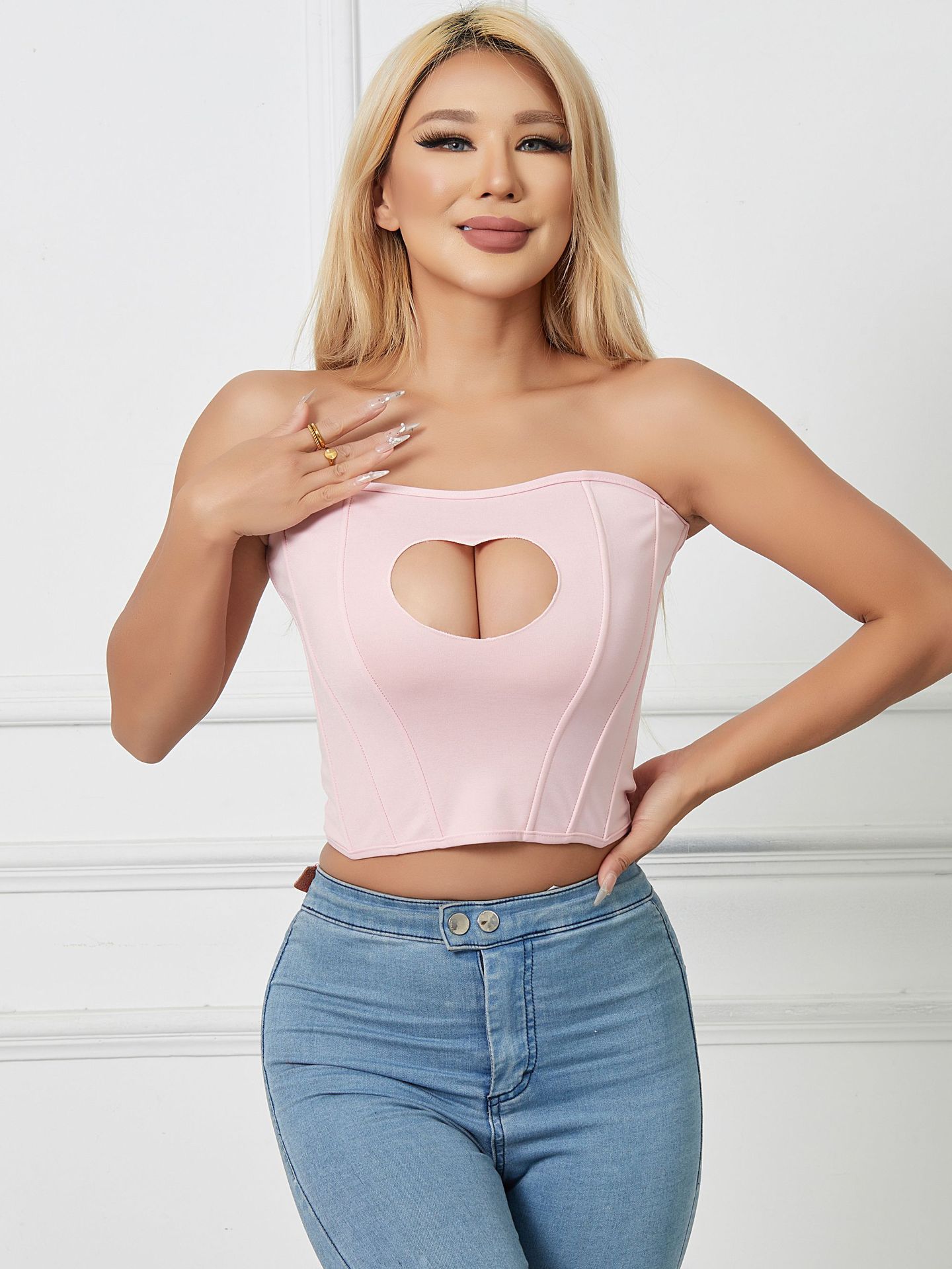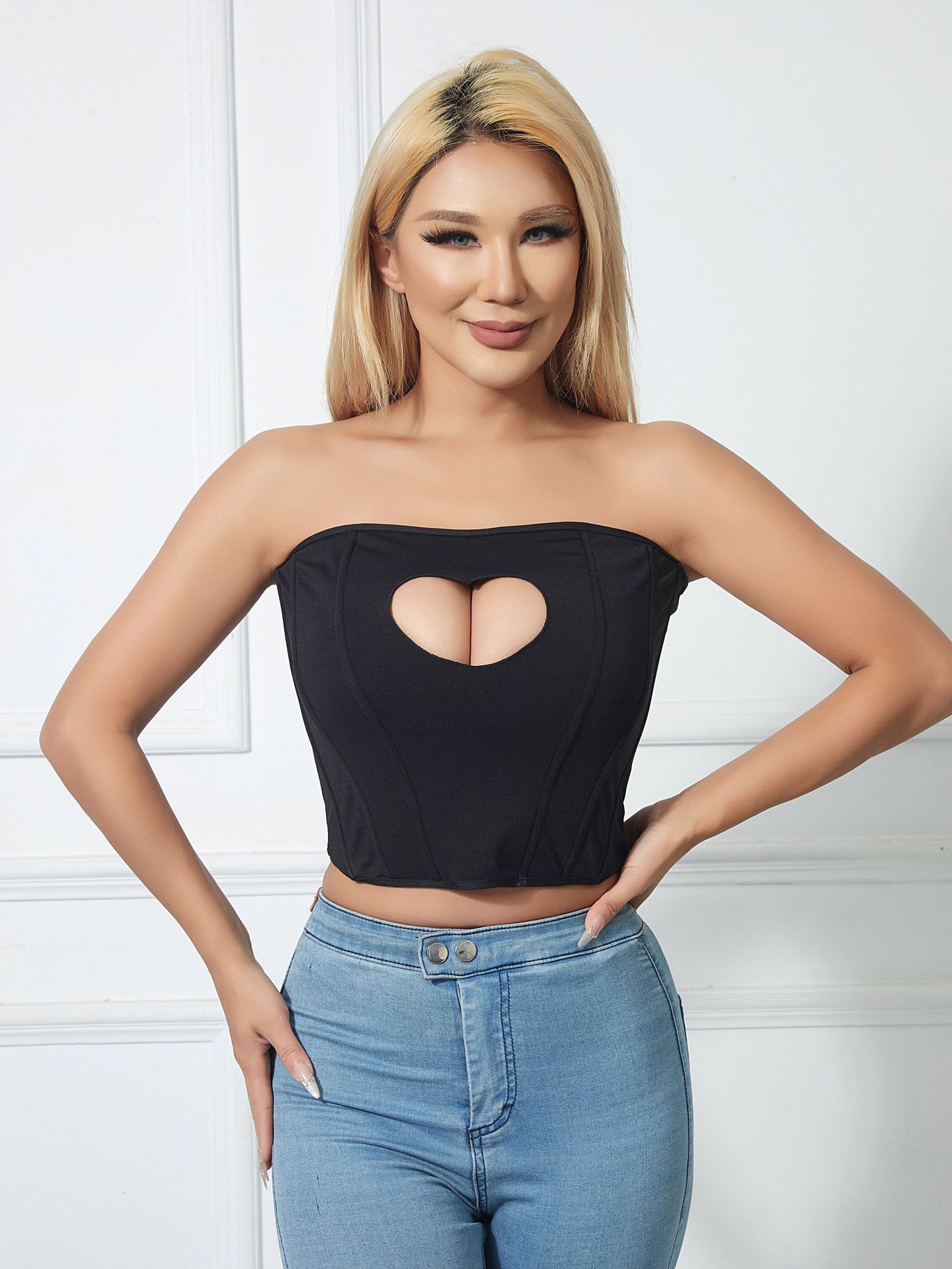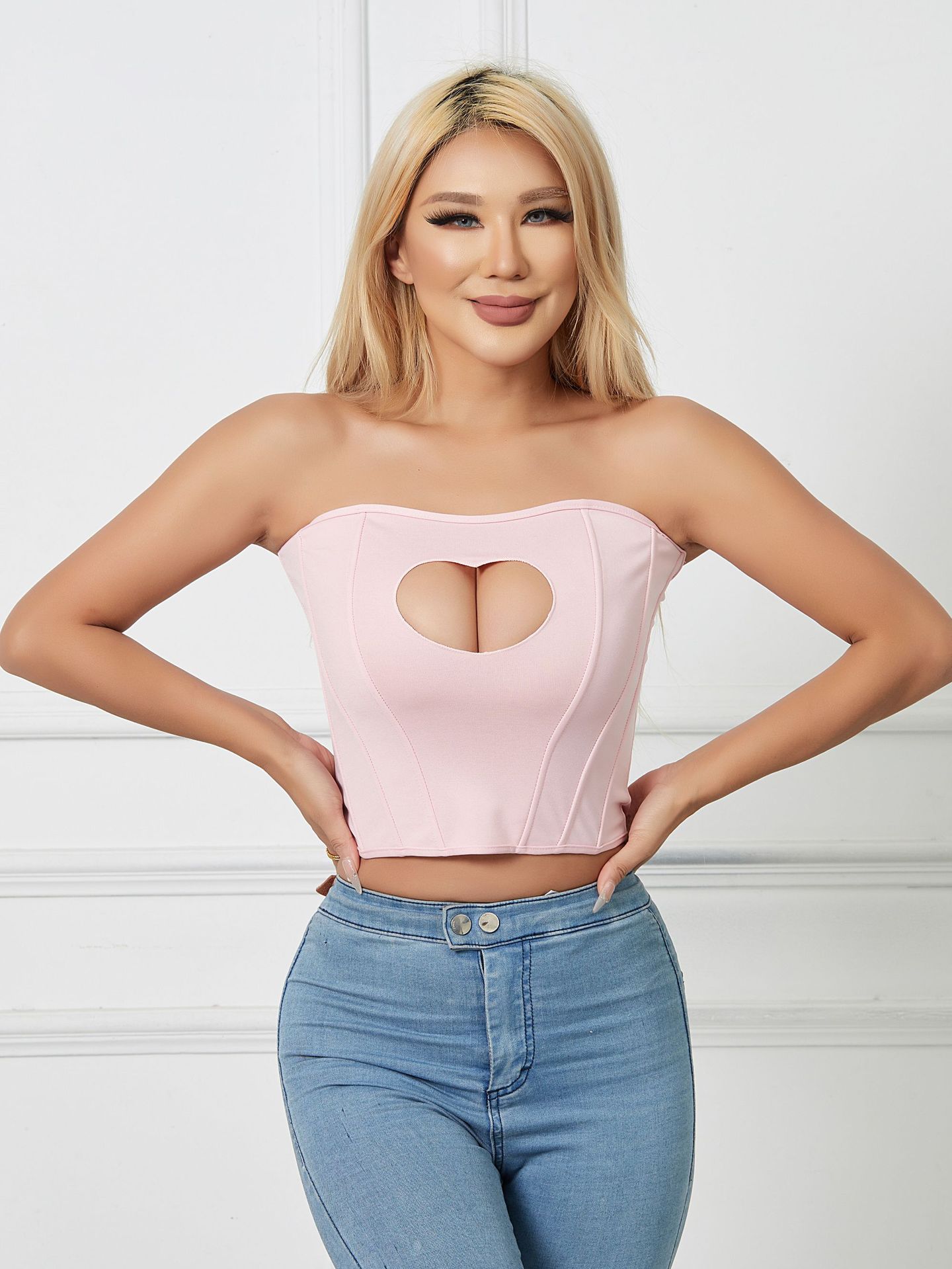 유럽과 미국의 국경을 넘나드는 섹시한 오프숄더 피쉬본 가슴 감싸는 달콤하고 매콤한 디자인 하트 모양의 속이 빈 허리 타이트한 튜브탑스토어 가기
