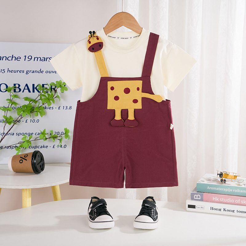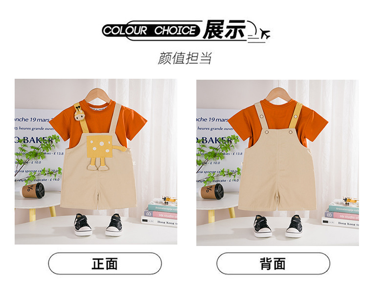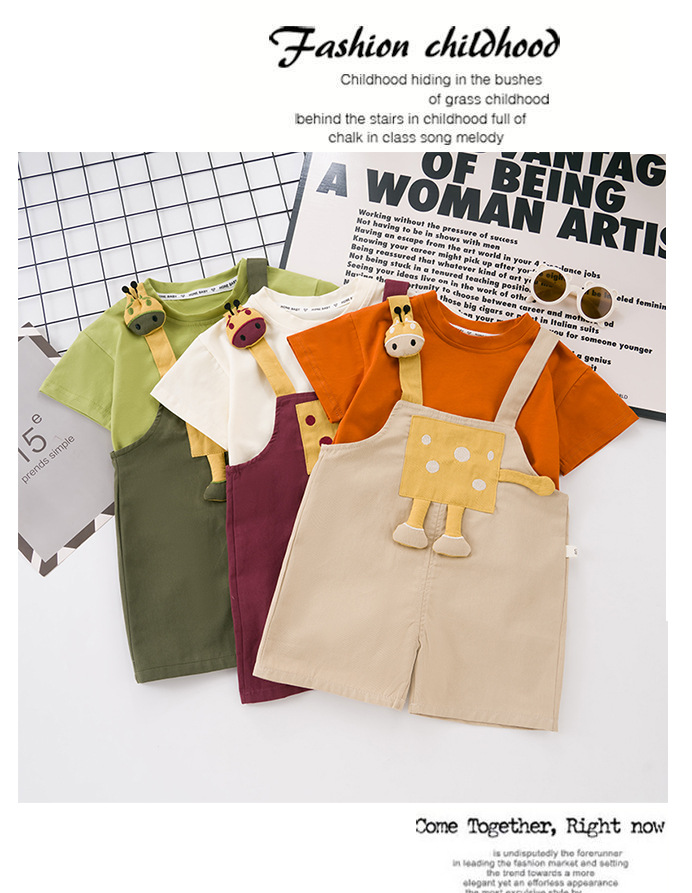 2025 반팔 만화 귀여운 소년과 소녀 단색 입체 기린 캐주얼 작업복 아동복 투피스 세트스토어 가기