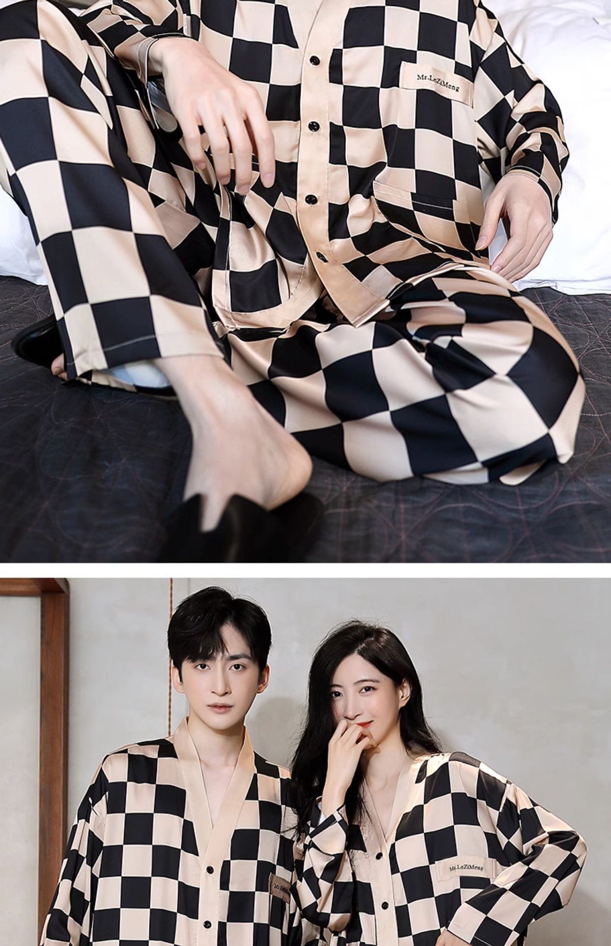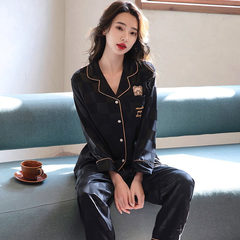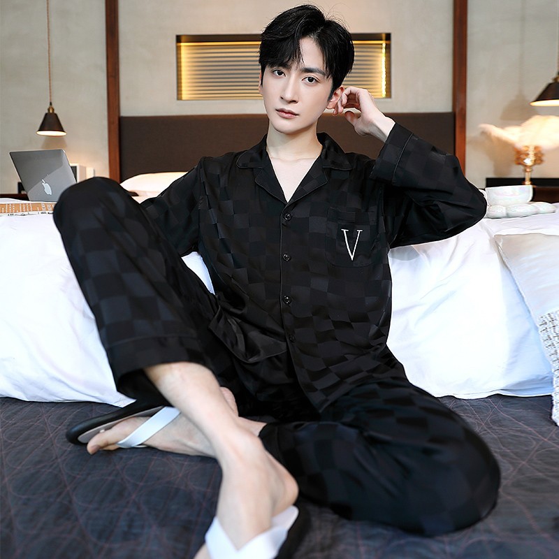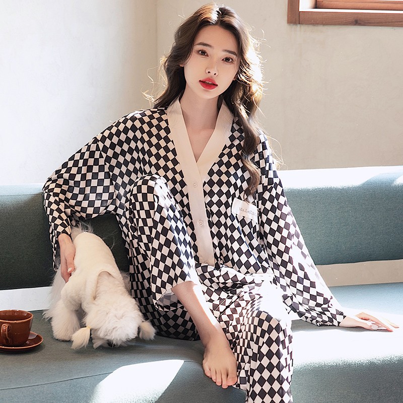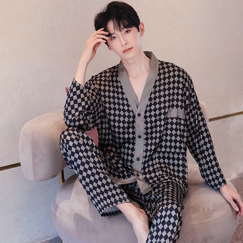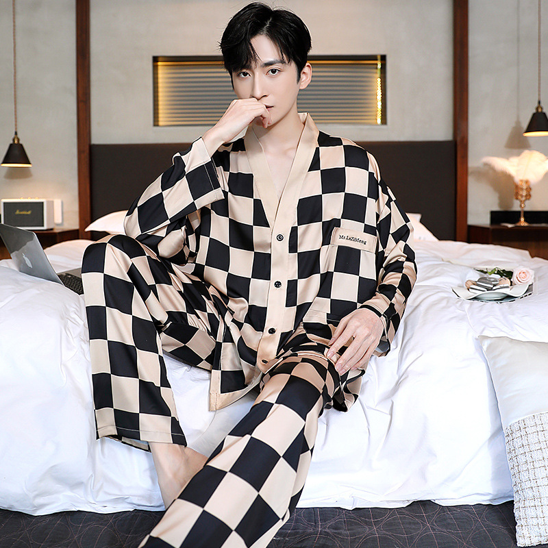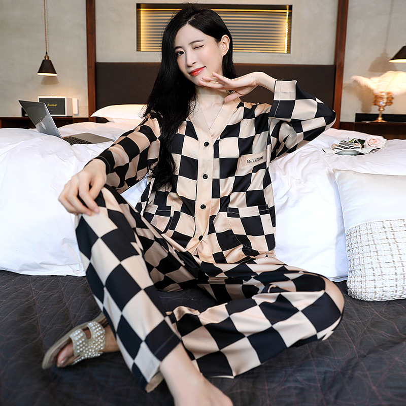 남성과 여성을 위한 아이스 실크 잠옷 커플 세트 봄, 가을 V 넥 체커보드 체크 무늬 긴팔 카디건 실크 홈웨어스토어 가기